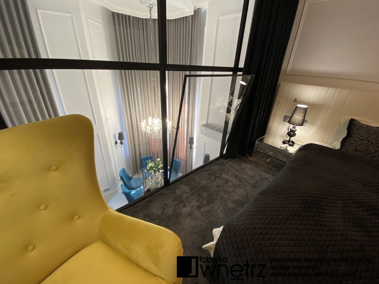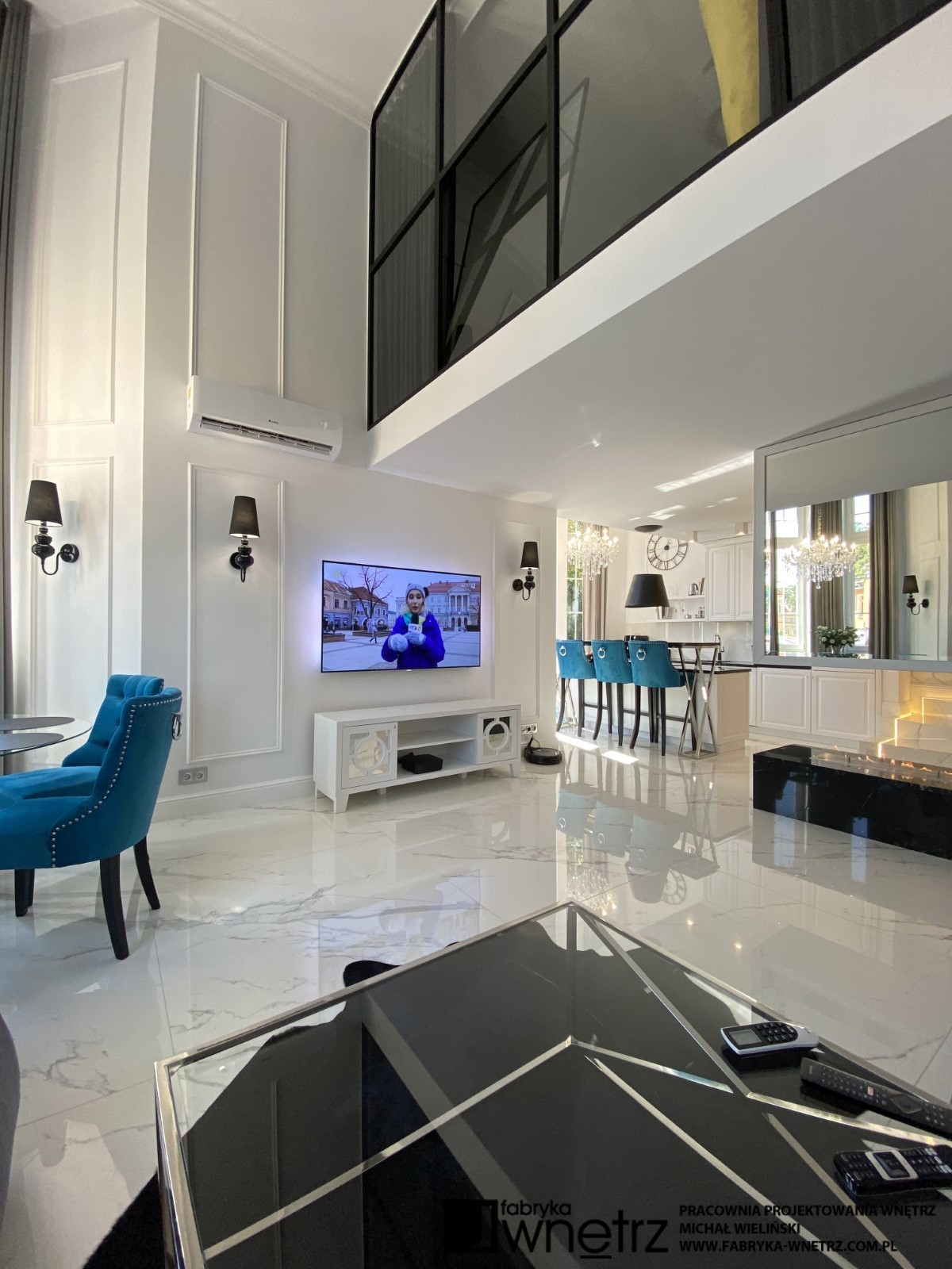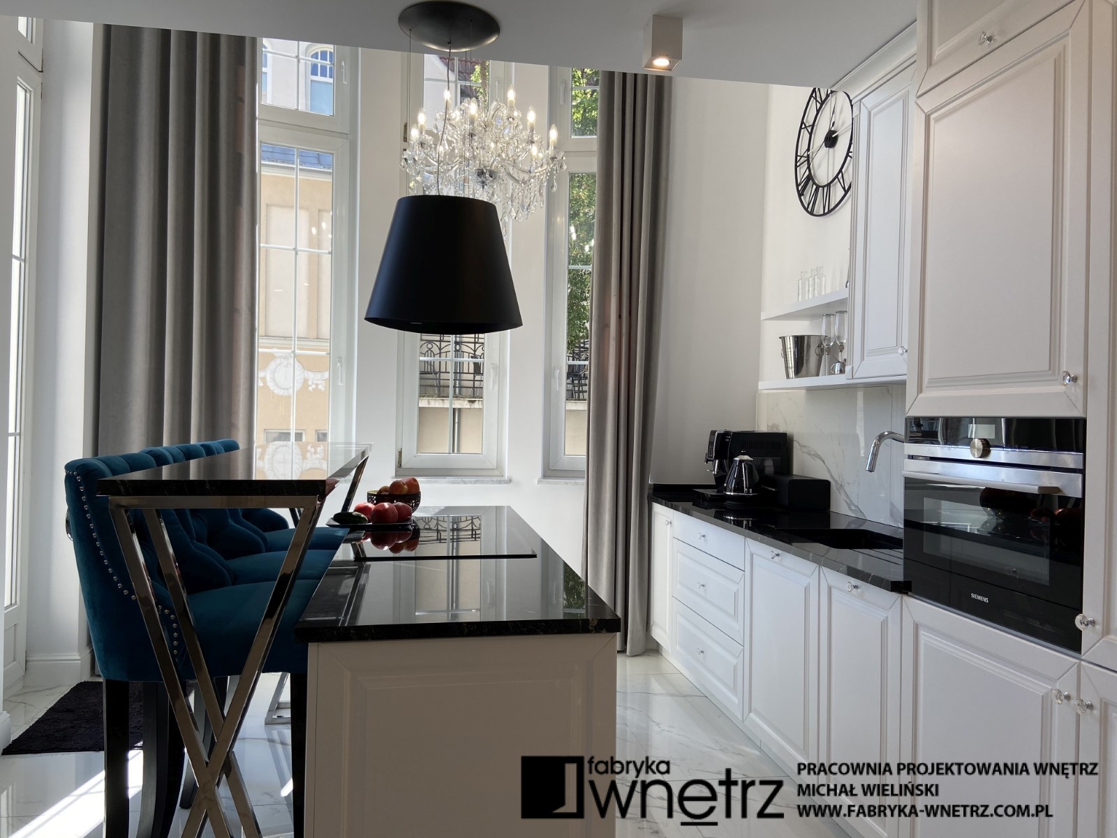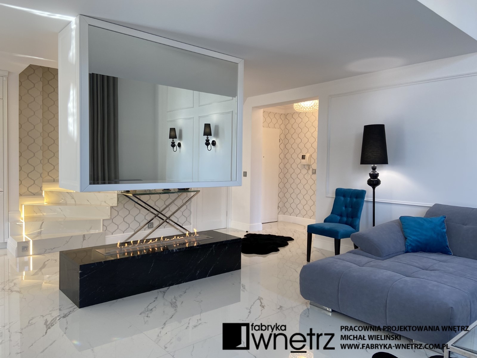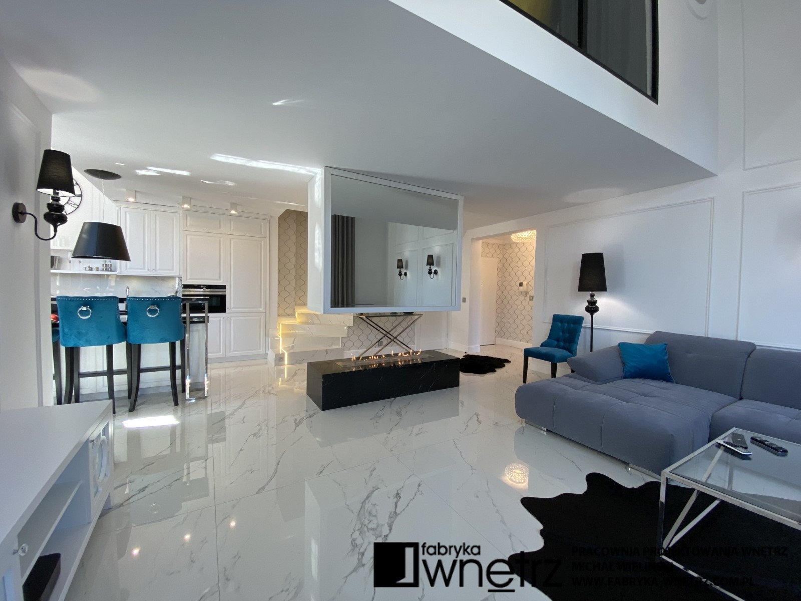 Aranżacja wnętrz i realizacja apartamentu w centrum Sopotu. Jedna z naszych najnowszych realizacji powstała w jednym z najpopularniejszych polskich kurortów, przy popularnym „Monciaku” w Sopocie. Naszym zadaniem było zaprojektowanie wnętrz i koordynacja realizacji dwupoziomowego apartamentu, o powierzchi około 110m2, w kilkupiętrowej, stylizowanej kamienicy, powstałej na wzór przedwojennej zabudowy, w tej części Sopotu. Apartament, którego układ funkcjonalny został przez nas dość mocno zmieniony, został zaprojektowany w stylu modern classic, z dominującym kolorem białym i z dodatkami w postaci kolorów beżu, czerni, szarości, niebieskiego i musztardowego. Na niższej kondygnacji znajduje się obszerny salon, z podwieszaną nad potężnym biokominkiem szafą, otwartą kuchnią z miejscem do spożywania posiłków i jadalnią ze szklanym stołem na 6 osób. Jest tu również sypialnia z toaletką i łazienką z przeszkloną jedną ścianą, aby do jej wnętrza wpuścić nieco naturalnego światła. Na wyższą kondygnację prowadzą podświetlane schody, z płytki imitującej biały marmur calaccata. Na górze znajdują się dwie sypialnie, w tym jedna z garderobą. Obie są przeszklone, z widokiem na dolną kondygnację. Jedna ma widok na salon, a druga na dolną sypialnię. Na górze znajduje się również obszerna łazienka, z dużą, otwartą kabiną prysznicową. To bardzo klimatyczne, eleganckie wnętrze doskonale sprawdza się jako mieszkanie, w którym można przyjemnie spędzić urlop nad morzem, niezależnie od pogody za oknem 😉