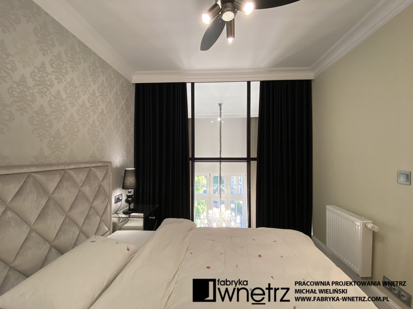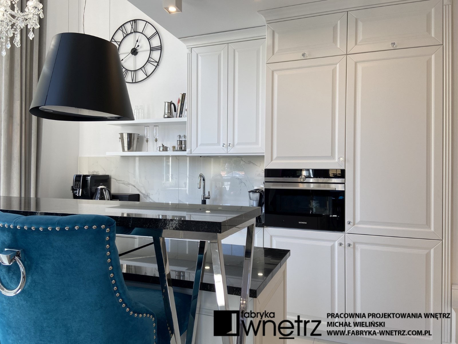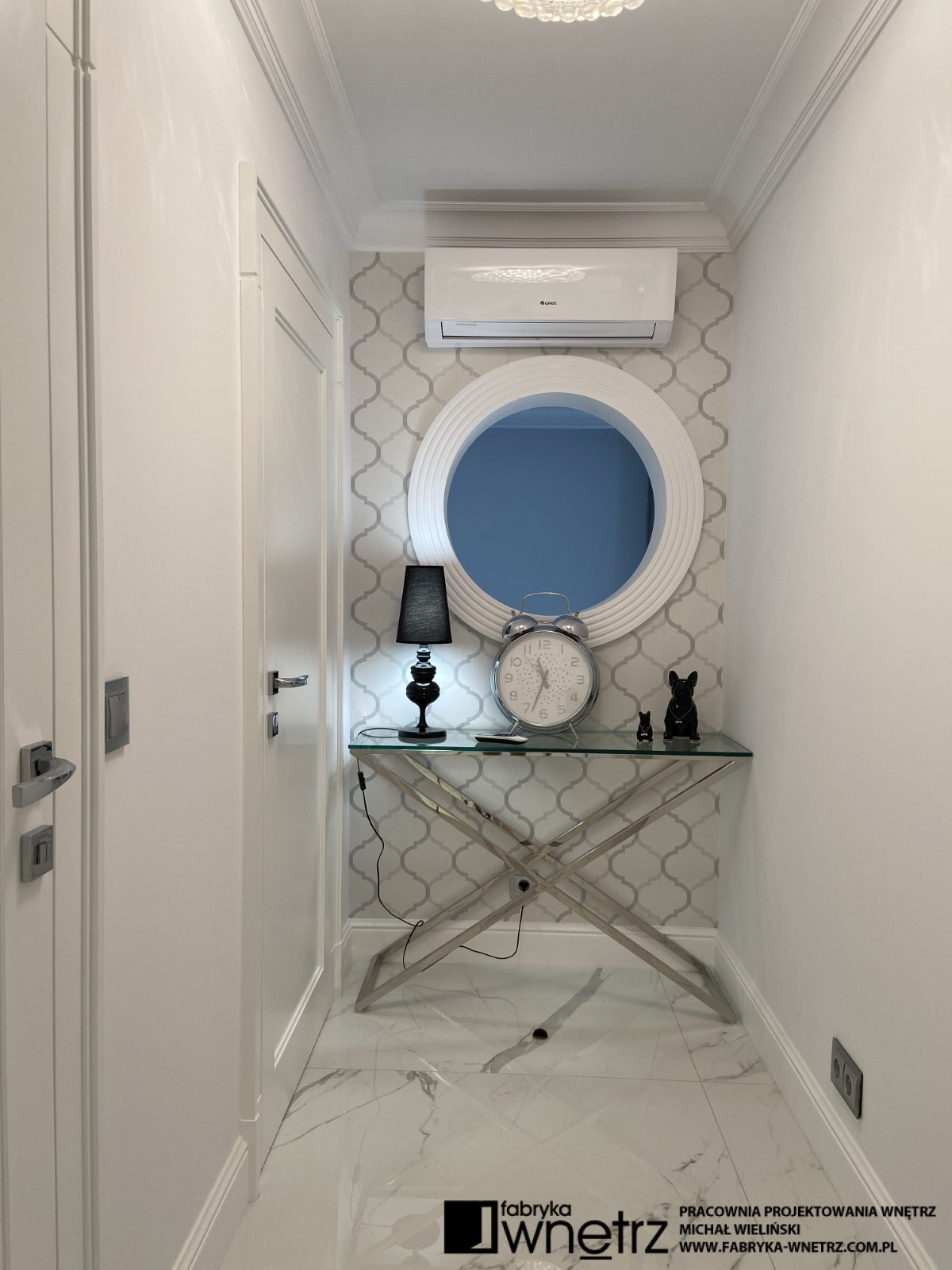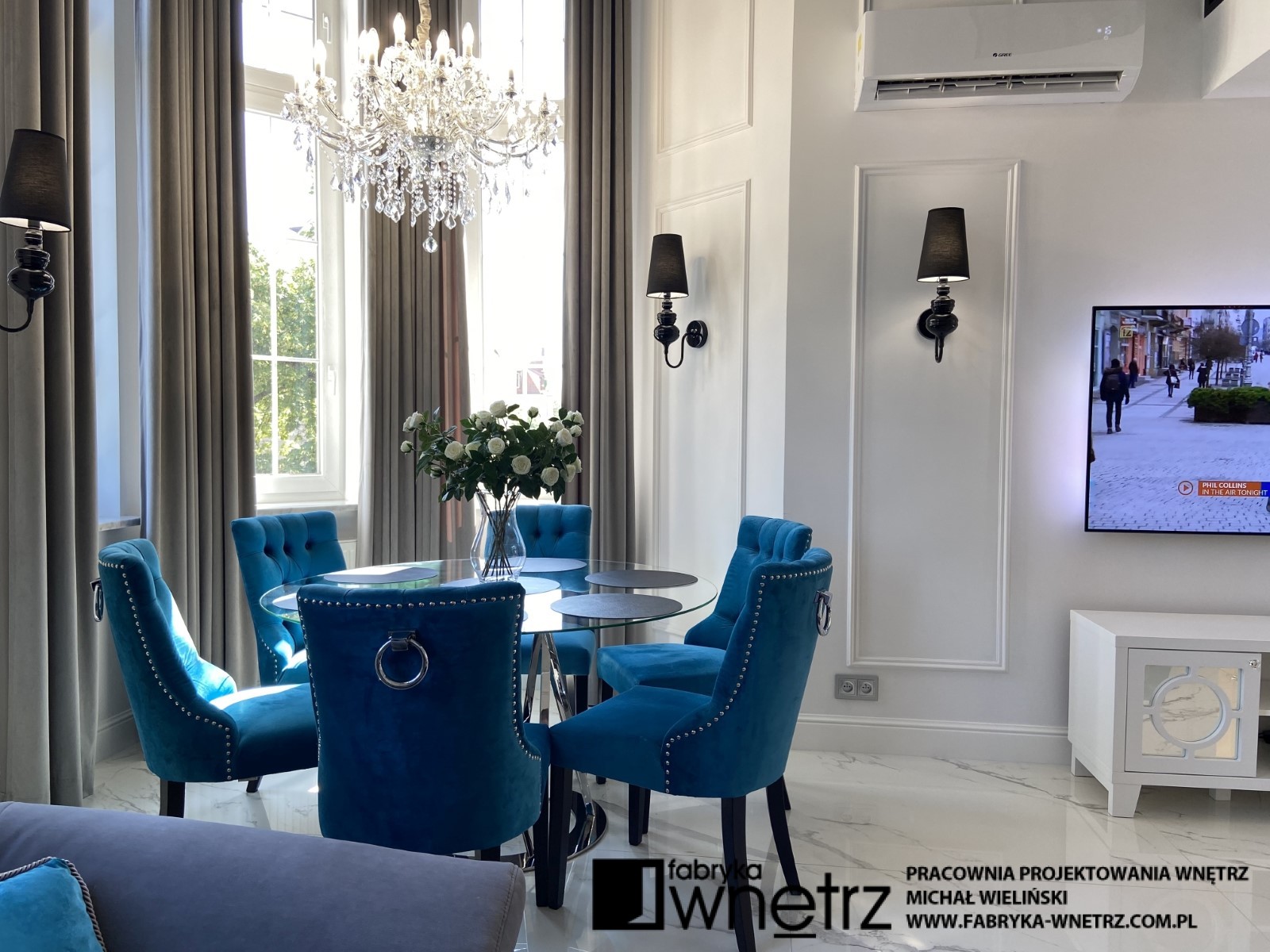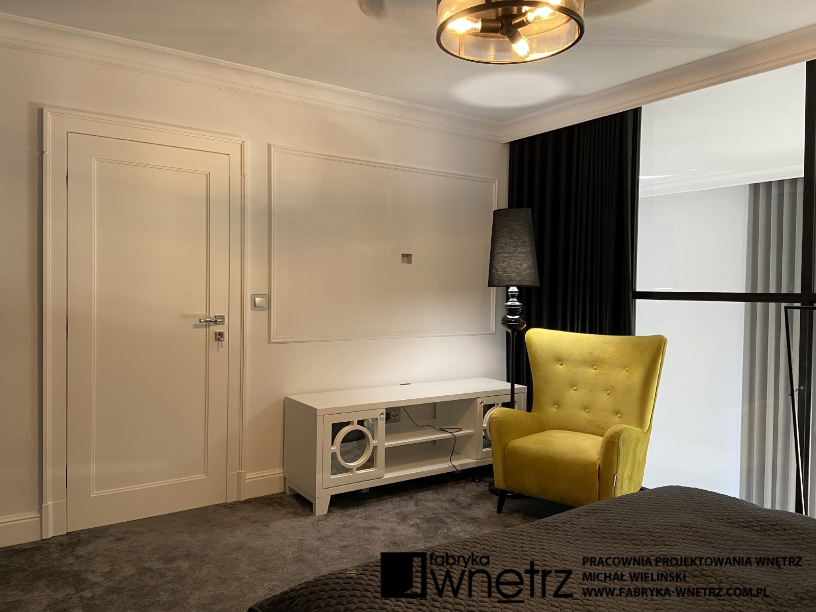 Aranżacja wnętrz i realizacja apartamentu w centrum Sopotu. Jedna z naszych najnowszych realizacji powstała w jednym z najpopularniejszych polskich kurortów, przy popularnym „Monciaku” w Sopocie. Naszym zadaniem było zaprojektowanie wnętrz i koordynacja realizacji dwupoziomowego apartamentu, o powierzchi około 110m2, w kilkupiętrowej, stylizowanej kamienicy, powstałej na wzór przedwojennej zabudowy, w tej części Sopotu. Apartament, którego układ funkcjonalny został przez nas dość mocno zmieniony, został zaprojektowany w stylu modern classic, z dominującym kolorem białym i z dodatkami w postaci kolorów beżu, czerni, szarości, niebieskiego i musztardowego. Na niższej kondygnacji znajduje się obszerny salon, z podwieszaną nad potężnym biokominkiem szafą, otwartą kuchnią z miejscem do spożywania posiłków i jadalnią ze szklanym stołem na 6 osób. Jest tu również sypialnia z toaletką i łazienką z przeszkloną jedną ścianą, aby do jej wnętrza wpuścić nieco naturalnego światła. Na wyższą kondygnację prowadzą podświetlane schody, z płytki imitującej biały marmur calaccata. Na górze znajdują się dwie sypialnie, w tym jedna z garderobą. Obie są przeszklone, z widokiem na dolną kondygnację. Jedna ma widok na salon, a druga na dolną sypialnię. Na górze znajduje się również obszerna łazienka, z dużą, otwartą kabiną prysznicową. To bardzo klimatyczne, eleganckie wnętrze doskonale sprawdza się jako mieszkanie, w którym można przyjemnie spędzić urlop nad morzem, niezależnie od pogody za oknem 😉