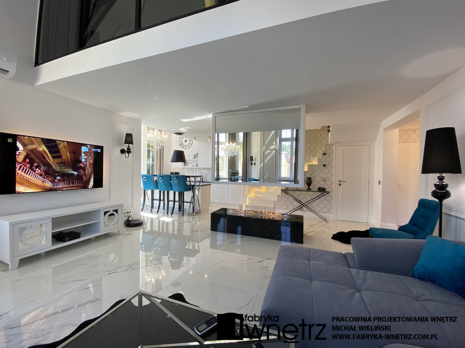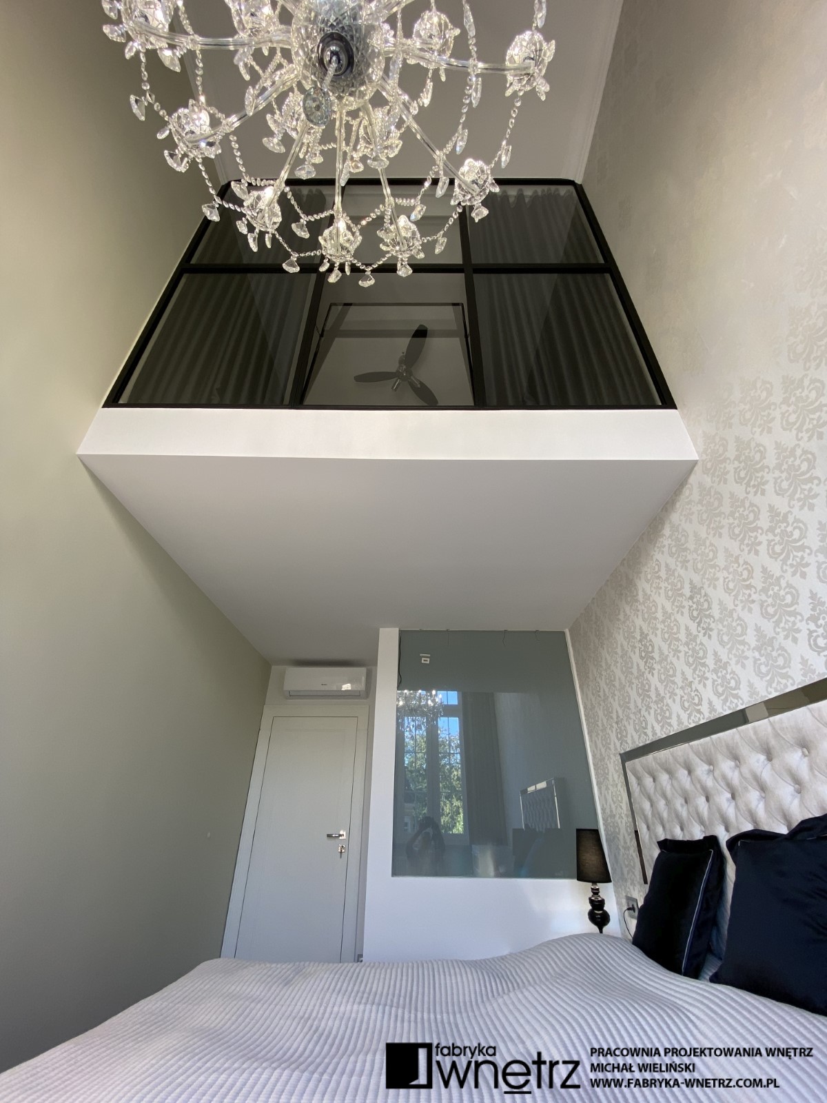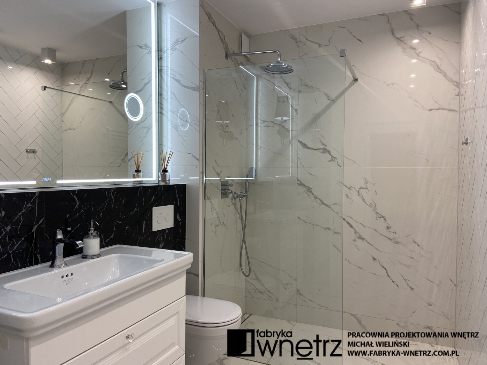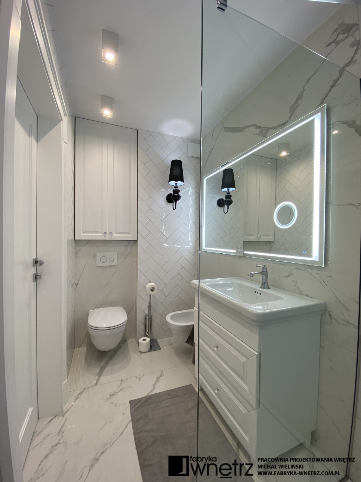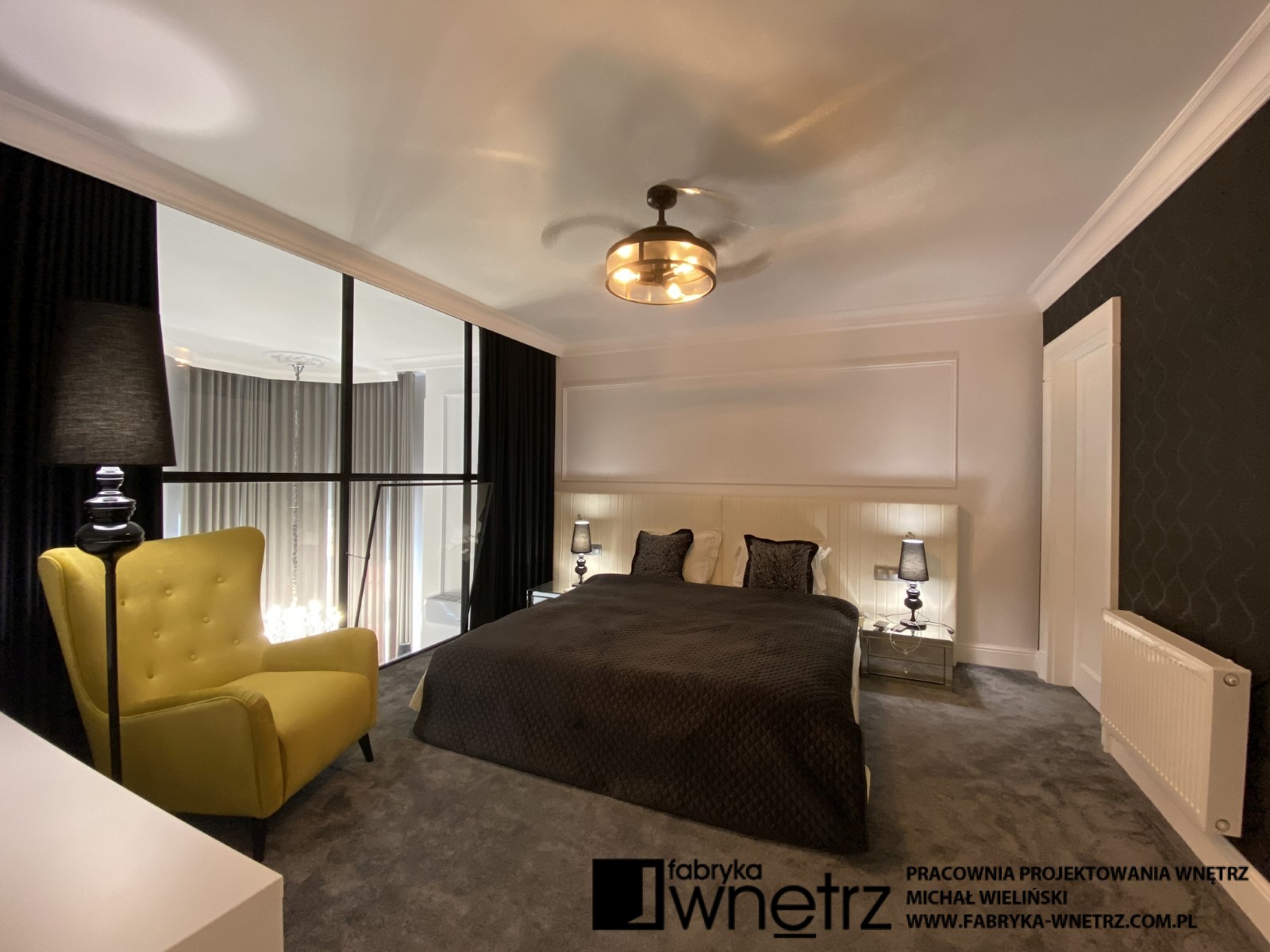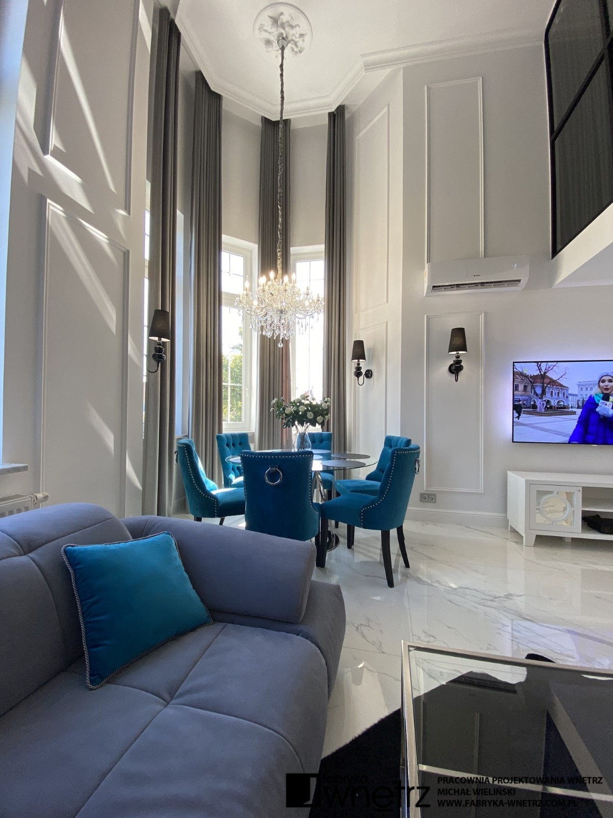 Aranżacja wnętrz i realizacja apartamentu w centrum Sopotu. Jedna z naszych najnowszych realizacji powstała w jednym z najpopularniejszych polskich kurortów, przy popularnym „Monciaku” w Sopocie. Naszym zadaniem było zaprojektowanie wnętrz i koordynacja realizacji dwupoziomowego apartamentu, o powierzchi około 110m2, w kilkupiętrowej, stylizowanej kamienicy, powstałej na wzór przedwojennej zabudowy, w tej części Sopotu. Apartament, którego układ funkcjonalny został przez nas dość mocno zmieniony, został zaprojektowany w stylu modern classic, z dominującym kolorem białym i z dodatkami w postaci kolorów beżu, czerni, szarości, niebieskiego i musztardowego. Na niższej kondygnacji znajduje się obszerny salon, z podwieszaną nad potężnym biokominkiem szafą, otwartą kuchnią z miejscem do spożywania posiłków i jadalnią ze szklanym stołem na 6 osób. Jest tu również sypialnia z toaletką i łazienką z przeszkloną jedną ścianą, aby do jej wnętrza wpuścić nieco naturalnego światła. Na wyższą kondygnację prowadzą podświetlane schody, z płytki imitującej biały marmur calaccata. Na górze znajdują się dwie sypialnie, w tym jedna z garderobą. Obie są przeszklone, z widokiem na dolną kondygnację. Jedna ma widok na salon, a druga na dolną sypialnię. Na górze znajduje się również obszerna łazienka, z dużą, otwartą kabiną prysznicową. To bardzo klimatyczne, eleganckie wnętrze doskonale sprawdza się jako mieszkanie, w którym można przyjemnie spędzić urlop nad morzem, niezależnie od pogody za oknem 😉