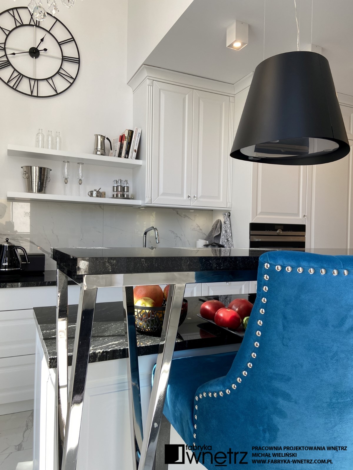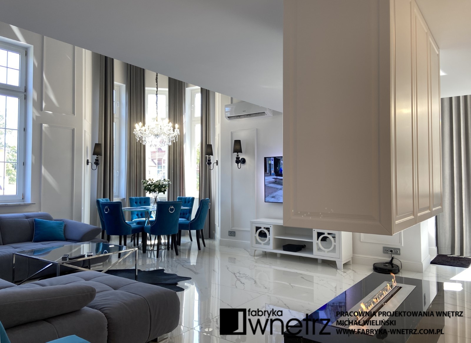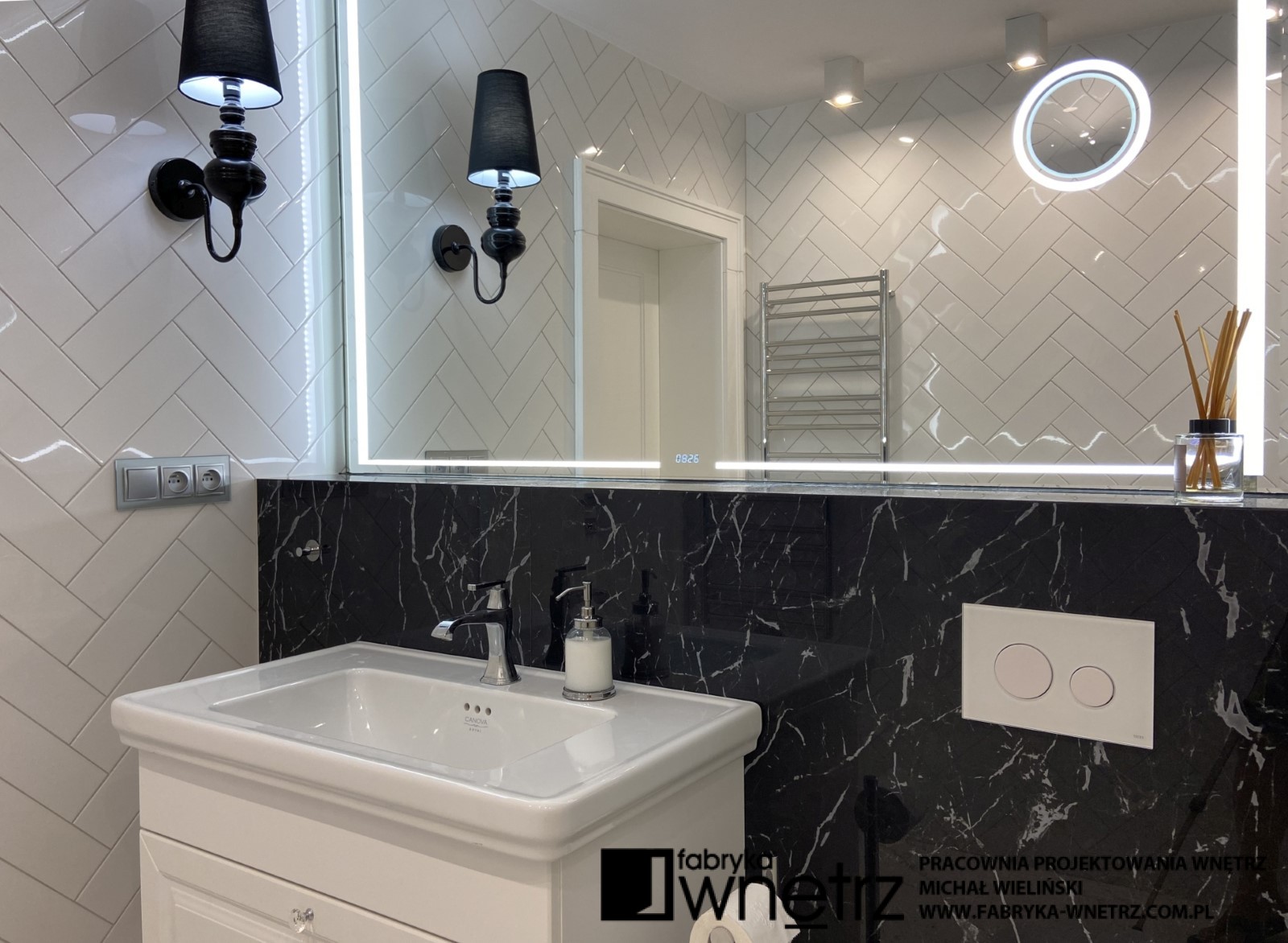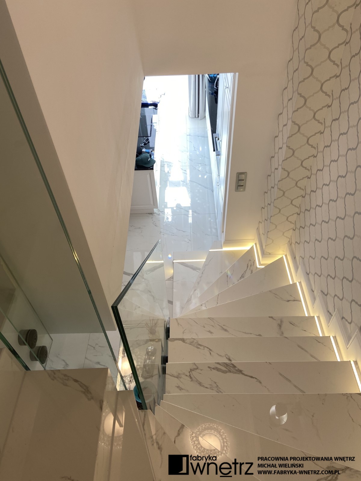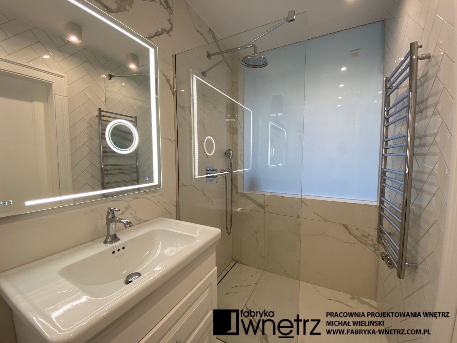Aranżacja wnętrz i realizacja apartamentu w centrum Sopotu. Jedna z naszych najnowszych realizacji powstała w jednym z najpopularniejszych polskich kurortów, przy popularnym „Monciaku” w Sopocie. Naszym zadaniem było zaprojektowanie wnętrz i koordynacja realizacji dwupoziomowego apartamentu, o powierzchi około 110m2, w kilkupiętrowej, stylizowanej kamienicy, powstałej na wzór przedwojennej zabudowy, w tej części Sopotu. Apartament, którego układ funkcjonalny został przez nas dość mocno zmieniony, został zaprojektowany w stylu modern classic, z dominującym kolorem białym i z dodatkami w postaci kolorów beżu, czerni, szarości, niebieskiego i musztardowego. Na niższej kondygnacji znajduje się obszerny salon, z podwieszaną nad potężnym biokominkiem szafą, otwartą kuchnią z miejscem do spożywania posiłków i jadalnią ze szklanym stołem na 6 osób. Jest tu również sypialnia z toaletką i łazienką z przeszkloną jedną ścianą, aby do jej wnętrza wpuścić nieco naturalnego światła. Na wyższą kondygnację prowadzą podświetlane schody, z płytki imitującej biały marmur calaccata. Na górze znajdują się dwie sypialnie, w tym jedna z garderobą. Obie są przeszklone, z widokiem na dolną kondygnację. Jedna ma widok na salon, a druga na dolną sypialnię. Na górze znajduje się również obszerna łazienka, z dużą, otwartą kabiną prysznicową. To bardzo klimatyczne, eleganckie wnętrze doskonale sprawdza się jako mieszkanie, w którym można przyjemnie spędzić urlop nad morzem, niezależnie od pogody za oknem 😉