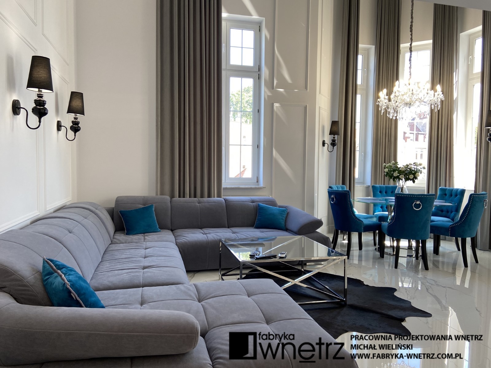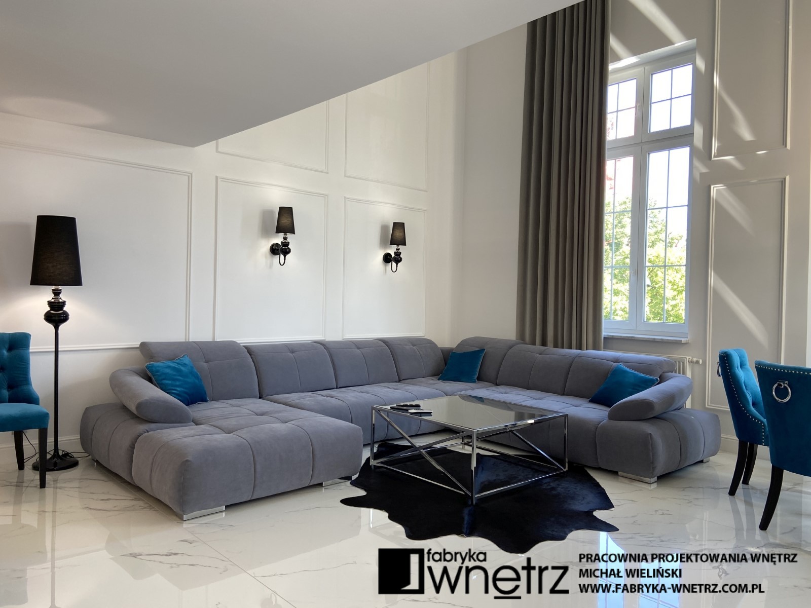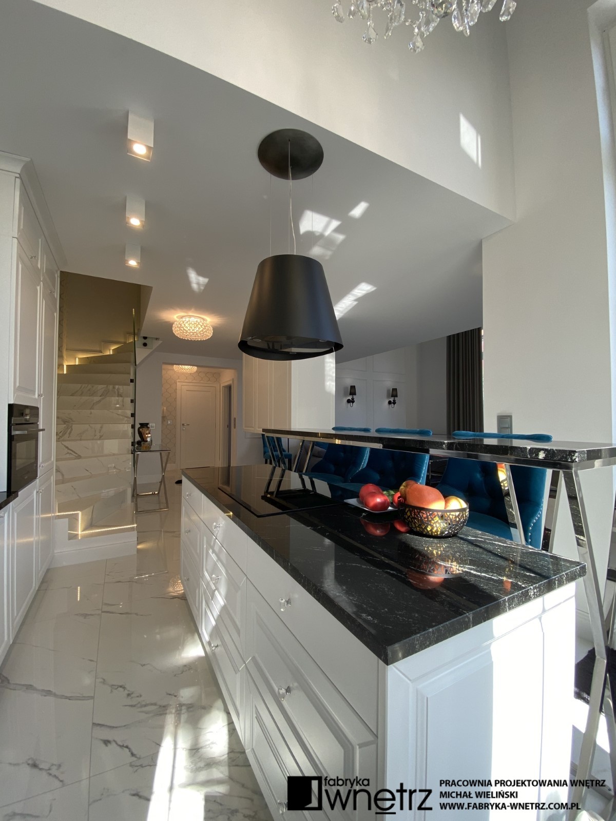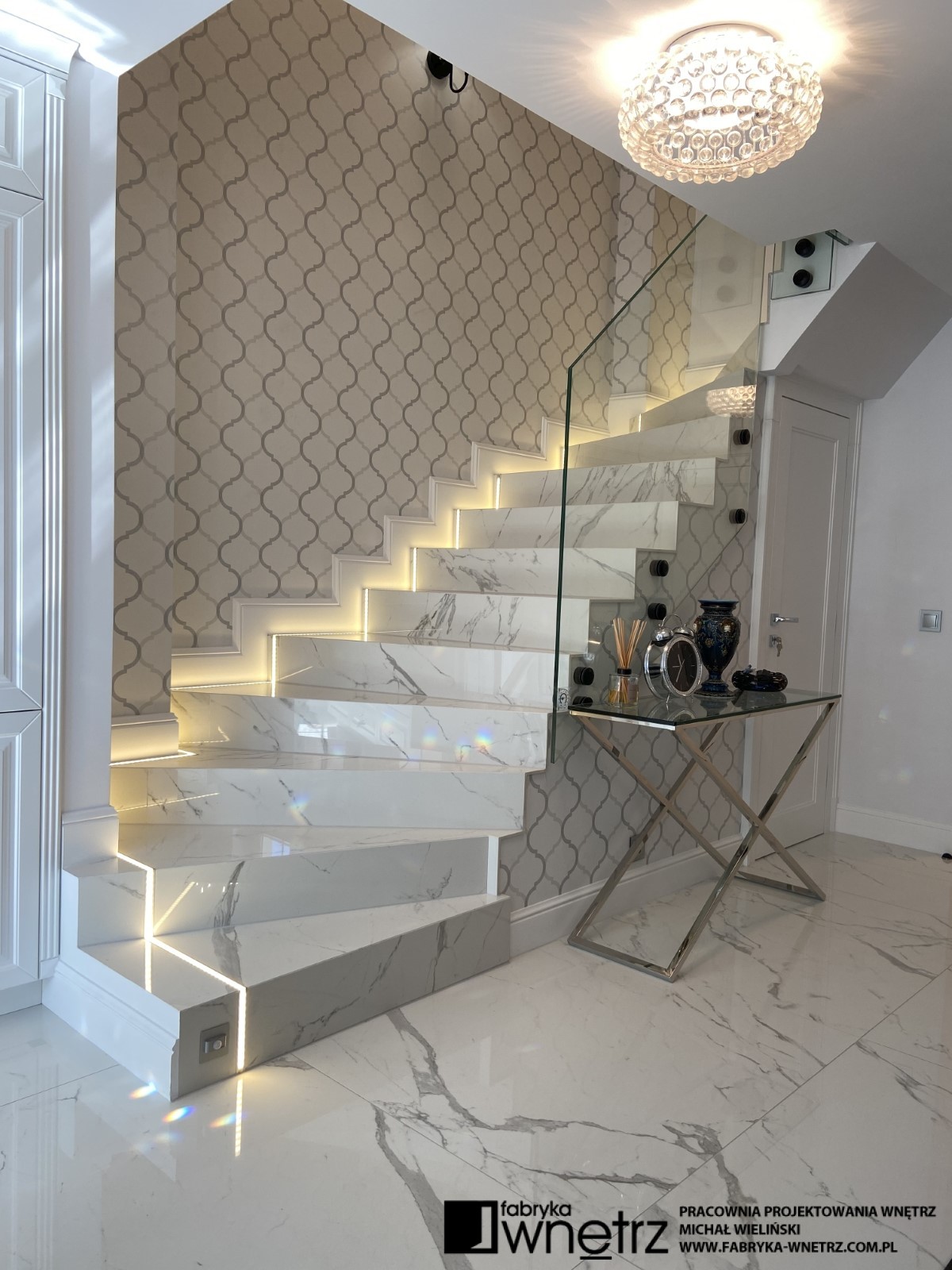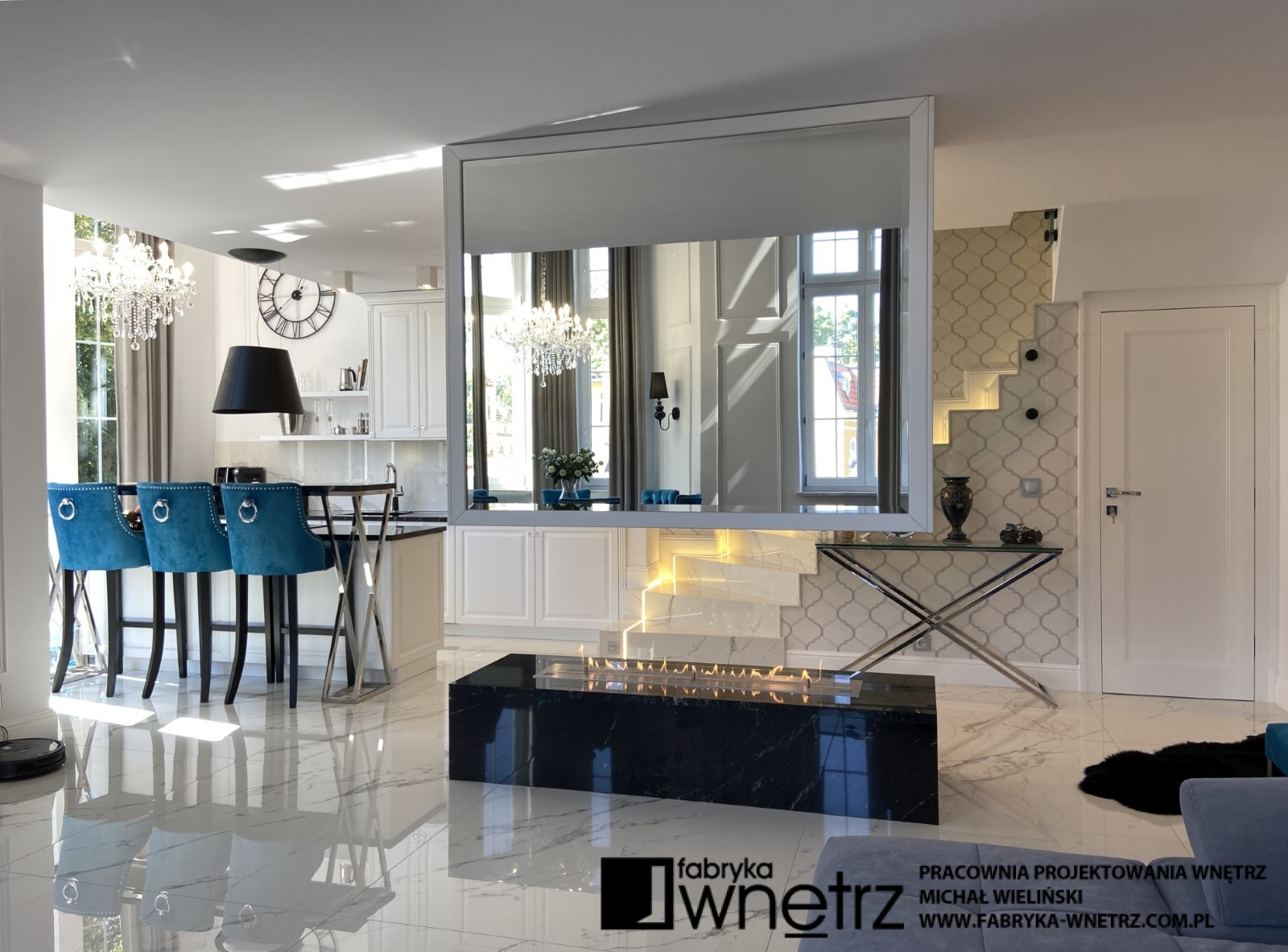 Aranżacja wnętrz i realizacja apartamentu w centrum Sopotu. Jedna z naszych najnowszych realizacji powstała w jednym z najpopularniejszych polskich kurortów, przy popularnym „Monciaku” w Sopocie. Naszym zadaniem było zaprojektowanie wnętrz i koordynacja realizacji dwupoziomowego apartamentu, o powierzchi około 110m2, w kilkupiętrowej, stylizowanej kamienicy, powstałej na wzór przedwojennej zabudowy, w tej części Sopotu. Apartament, którego układ funkcjonalny został przez nas dość mocno zmieniony, został zaprojektowany w stylu modern classic, z dominującym kolorem białym i z dodatkami w postaci kolorów beżu, czerni, szarości, niebieskiego i musztardowego. Na niższej kondygnacji znajduje się obszerny salon, z podwieszaną nad potężnym biokominkiem szafą, otwartą kuchnią z miejscem do spożywania posiłków i jadalnią ze szklanym stołem na 6 osób. Jest tu również sypialnia z toaletką i łazienką z przeszkloną jedną ścianą, aby do jej wnętrza wpuścić nieco naturalnego światła. Na wyższą kondygnację prowadzą podświetlane schody, z płytki imitującej biały marmur calaccata. Na górze znajdują się dwie sypialnie, w tym jedna z garderobą. Obie są przeszklone, z widokiem na dolną kondygnację. Jedna ma widok na salon, a druga na dolną sypialnię. Na górze znajduje się również obszerna łazienka, z dużą, otwartą kabiną prysznicową. To bardzo klimatyczne, eleganckie wnętrze doskonale sprawdza się jako mieszkanie, w którym można przyjemnie spędzić urlop nad morzem, niezależnie od pogody za oknem 😉