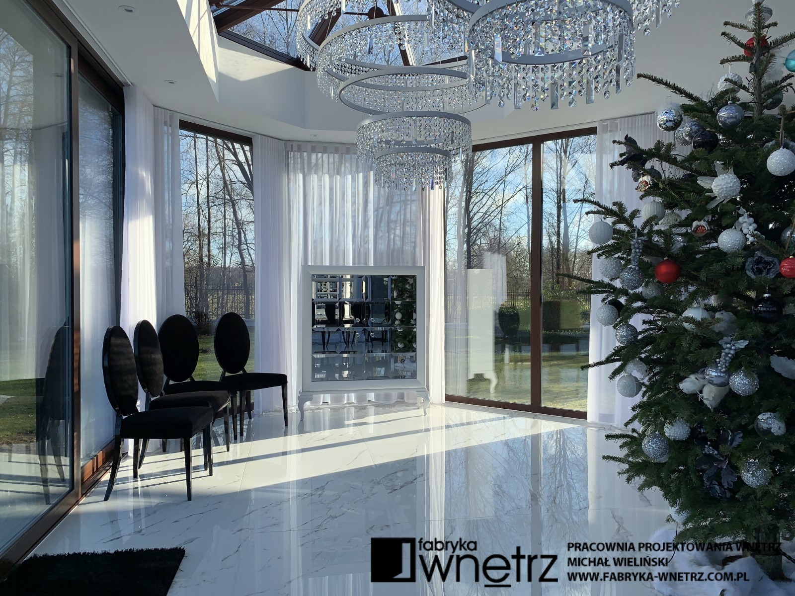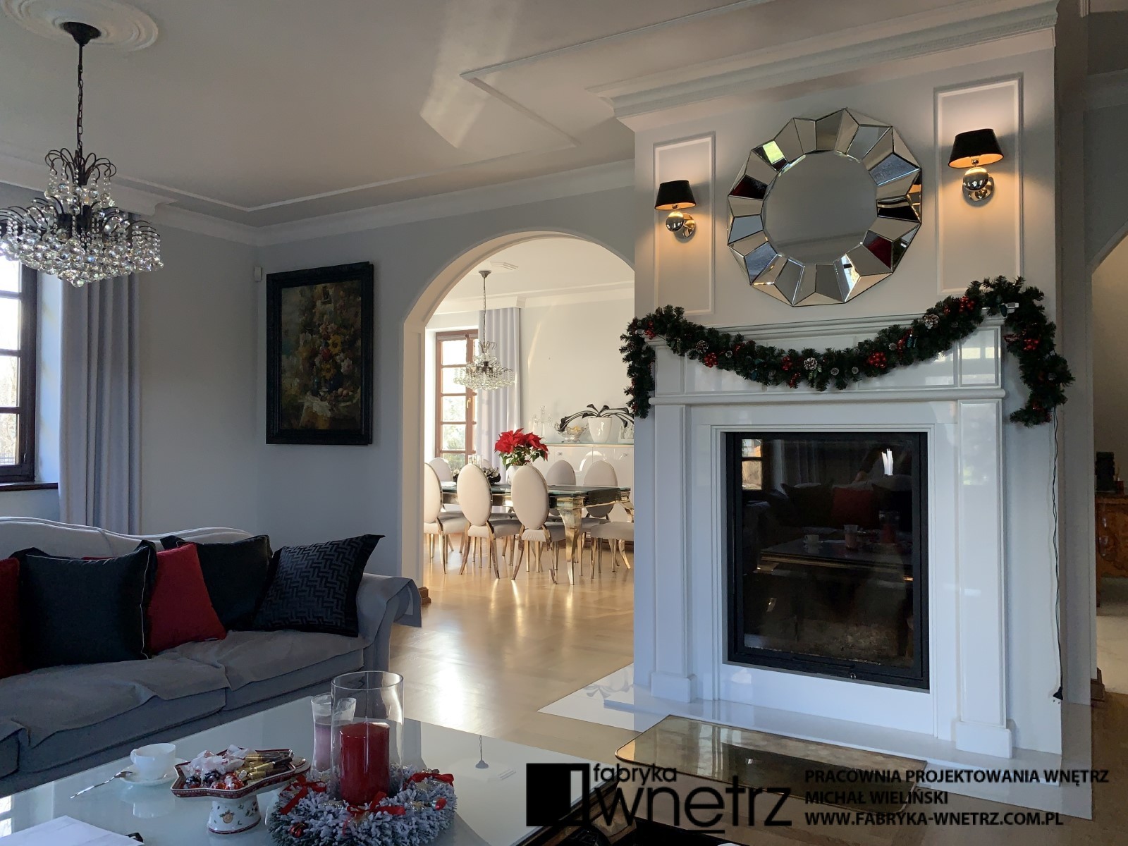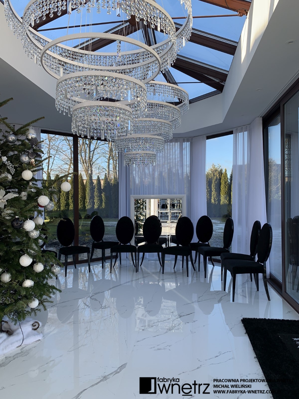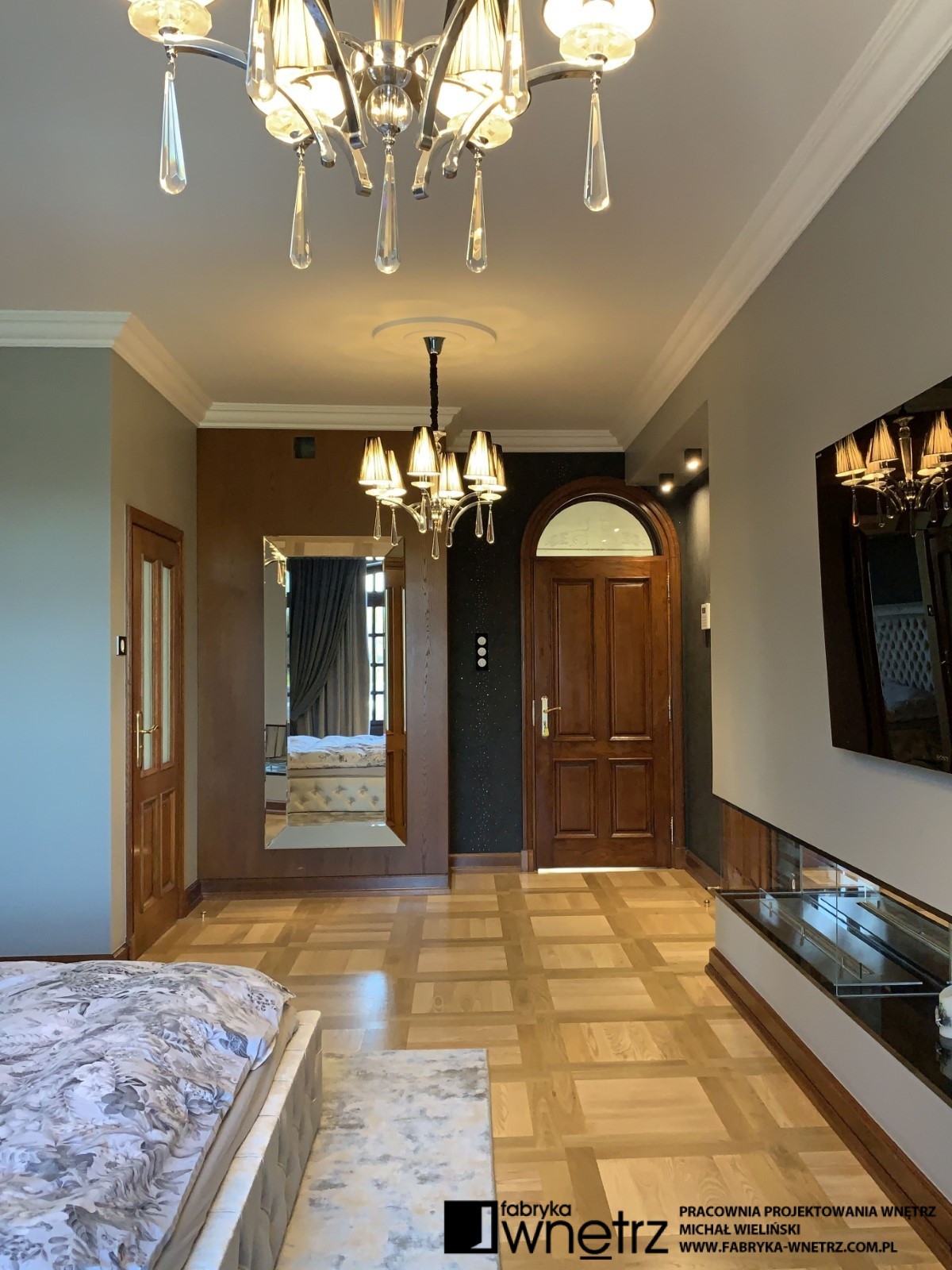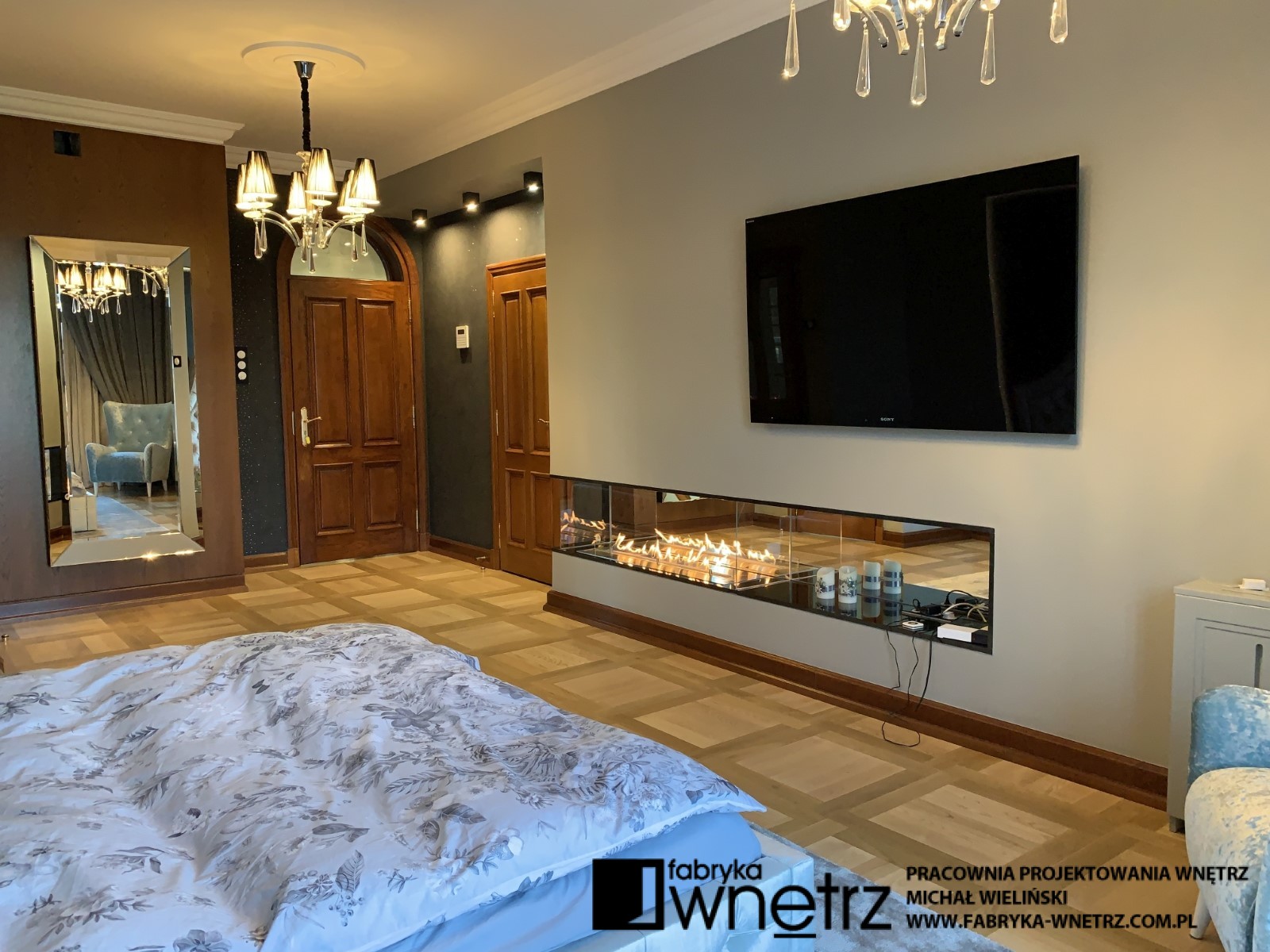 Naszym zadaniem, w tym klasycznym domu pod Koninem, był lifting kilku pomieszczeń na piętrze, kilku detali w salonie i stworzenie od podstaw ogrodu zimowego. Na piętrze projektowaliśmy wnętrza sypialni z garderobą i łazienką, oraz pokój młodzieżowy z garderobą i łazienką. W sypialni uwagę zwraca duży biokominek sterowany elektronicznie, oraz tapeta z kryształami Swarovskiego. W łazience, duże płytki gresowe w czarno-białej kolorystyce, oraz meble robione na zamówienie. Garderoba zachwyca swoim rozmiarem i pojemnością szaf. W pokoju młodzieżowym zastosowaliśmy otwierany podest z materacem, panele ścienne wykonane z kolorowej gąbki, oraz imitację betonu na ścianie za telewizorem. W łazience zaprojektowaliśmy saunę, biokominek, oraz sterowany elektronicznie prysznic. W salonie od nowa stworzyliśmy kominek i ścianę telewizyjną. Ogród zimowy zaprojektowaliśmy tak, aby zmieściły się w nim wygodne sofy, duży stół z 16 krzesłami, oraz dwie komody. Klimat tworzą ogromne przeszklenia, kryształowe żyrandole, oraz dwa wolnostojące biokominki.