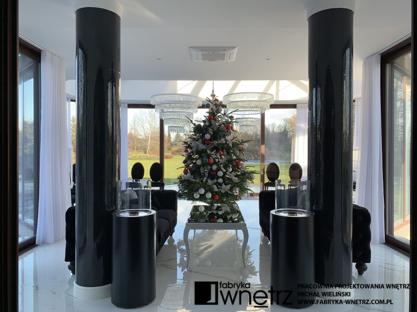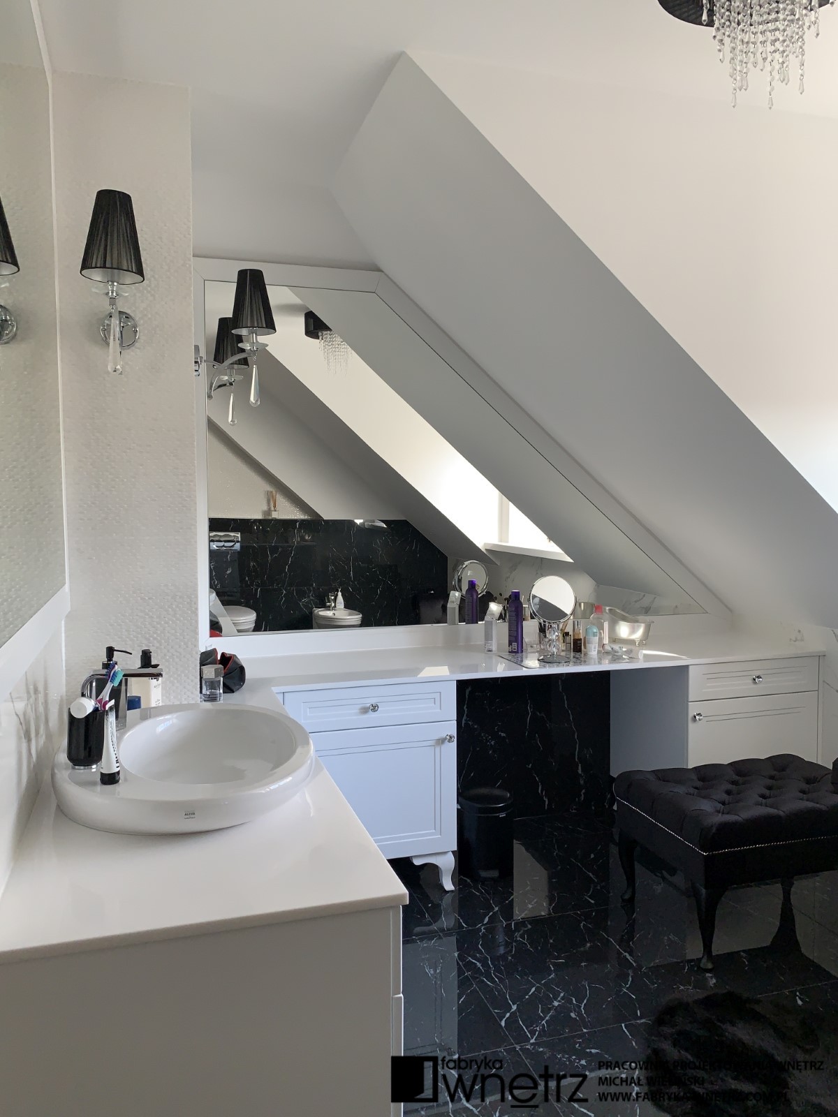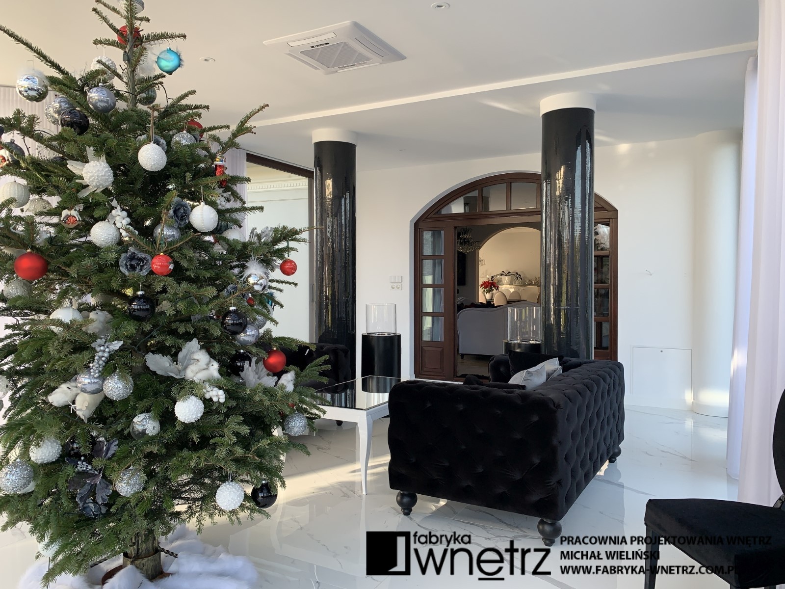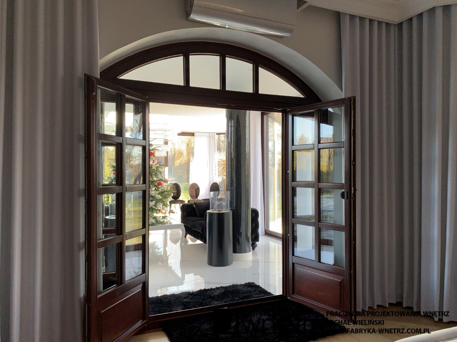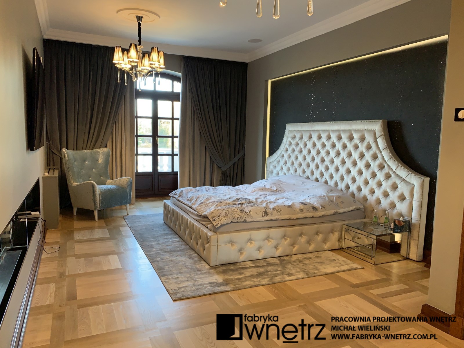 Naszym zadaniem, w tym klasycznym domu pod Koninem, był lifting kilku pomieszczeń na piętrze, kilku detali w salonie i stworzenie od podstaw ogrodu zimowego. Na piętrze projektowaliśmy wnętrza sypialni z garderobą i łazienką, oraz pokój młodzieżowy z garderobą i łazienką. W sypialni uwagę zwraca duży biokominek sterowany elektronicznie, oraz tapeta z kryształami Swarovskiego. W łazience, duże płytki gresowe w czarno-białej kolorystyce, oraz meble robione na zamówienie. Garderoba zachwyca swoim rozmiarem i pojemnością szaf. W pokoju młodzieżowym zastosowaliśmy otwierany podest z materacem, panele ścienne wykonane z kolorowej gąbki, oraz imitację betonu na ścianie za telewizorem. W łazience zaprojektowaliśmy saunę, biokominek, oraz sterowany elektronicznie prysznic. W salonie od nowa stworzyliśmy kominek i ścianę telewizyjną. Ogród zimowy zaprojektowaliśmy tak, aby zmieściły się w nim wygodne sofy, duży stół z 16 krzesłami, oraz dwie komody. Klimat tworzą ogromne przeszklenia, kryształowe żyrandole, oraz dwa wolnostojące biokominki.