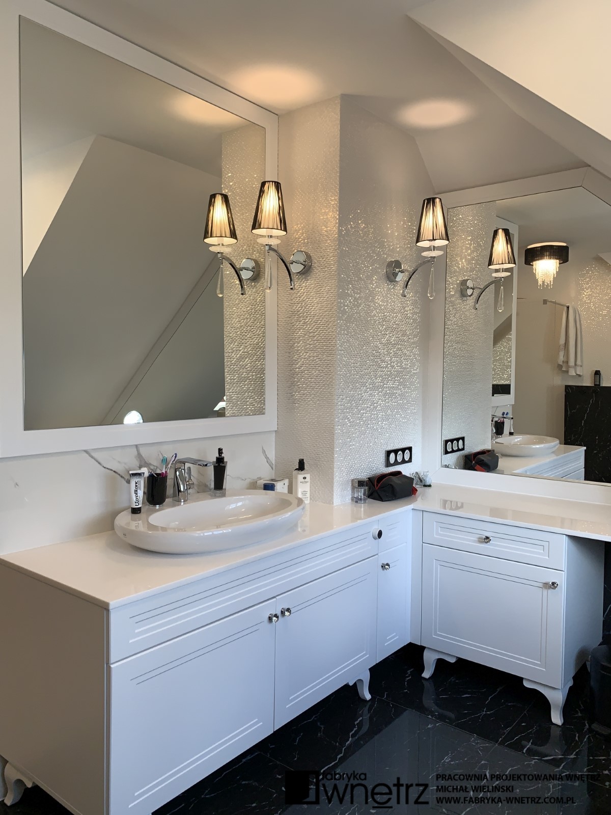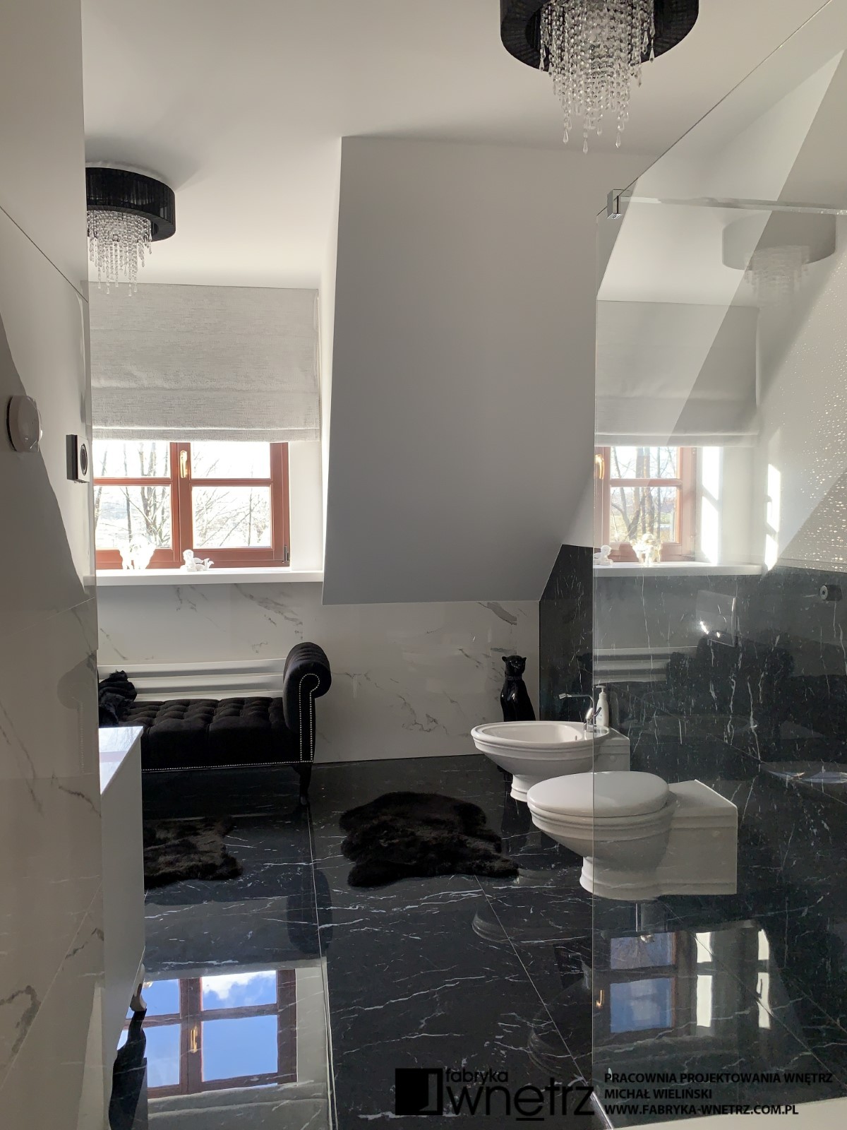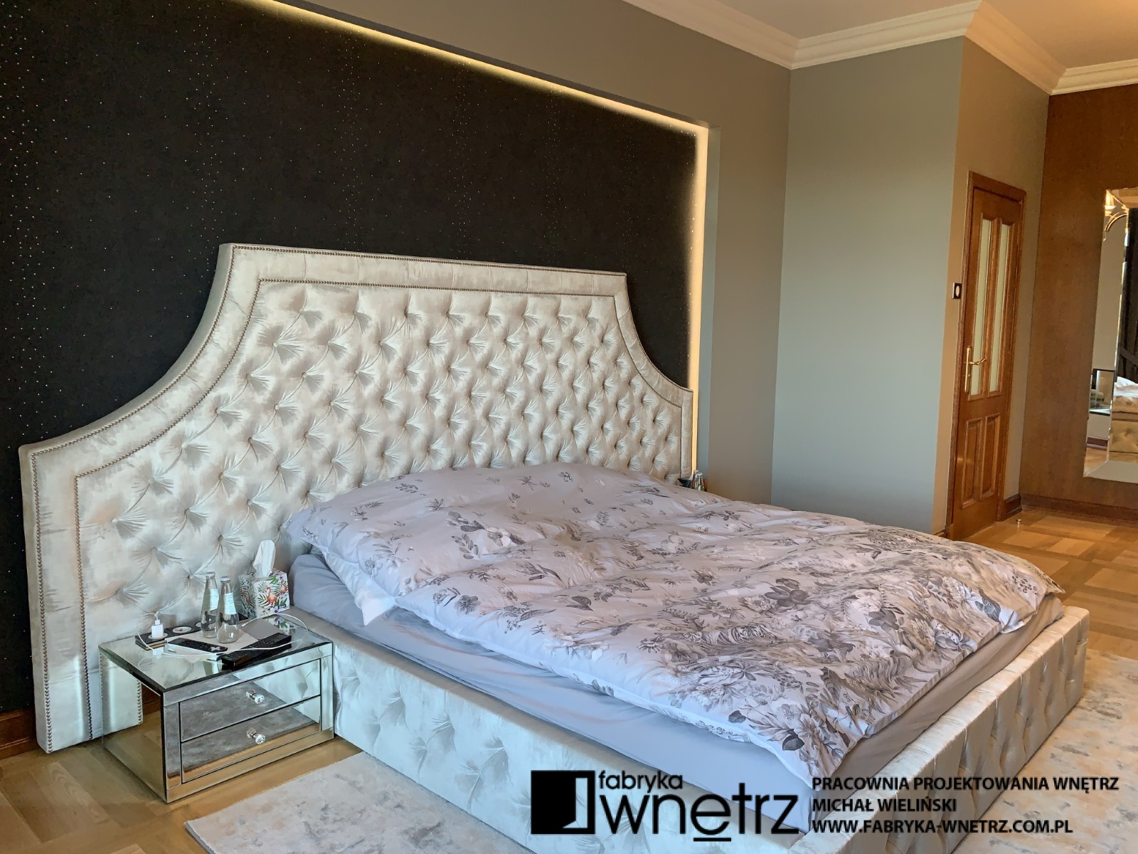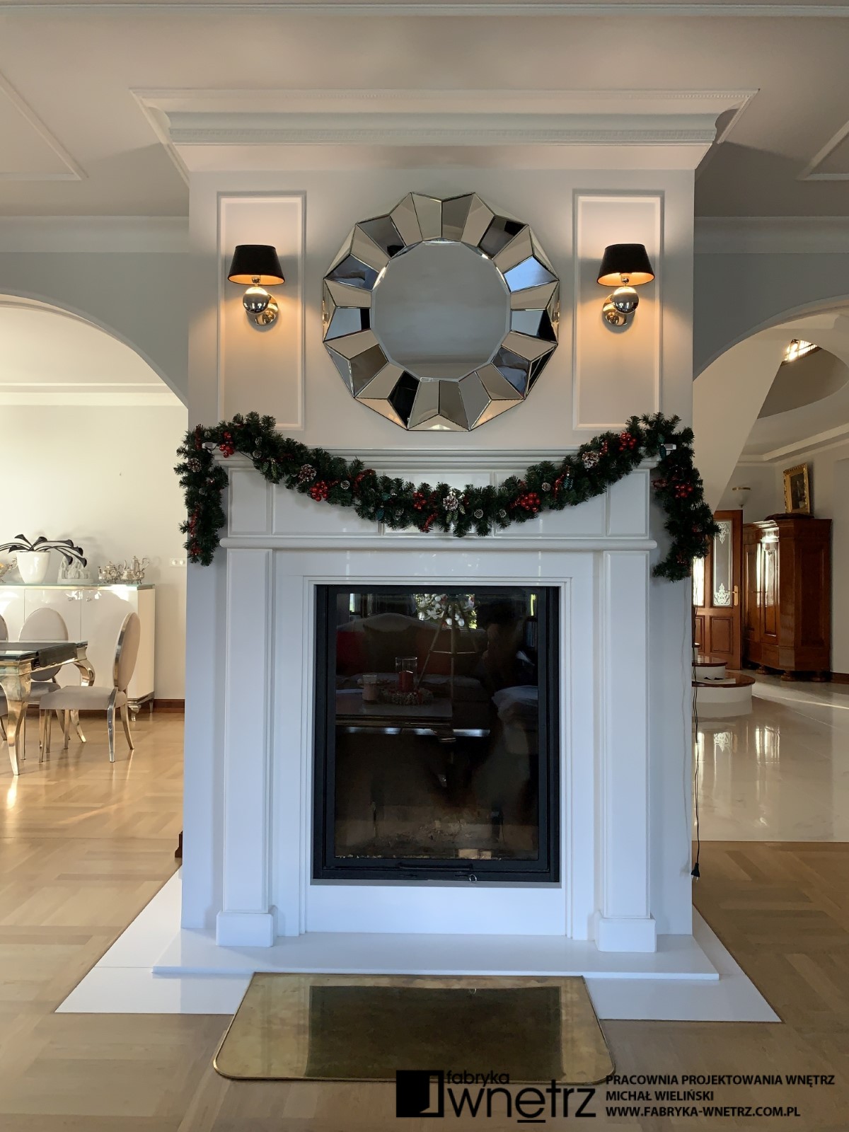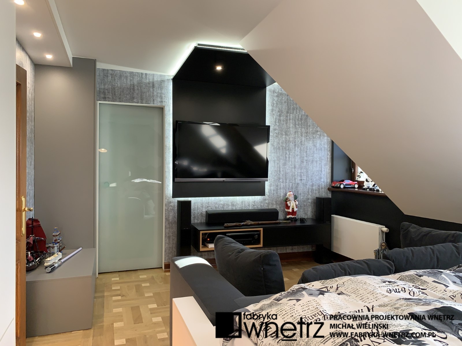 Naszym zadaniem, w tym klasycznym domu pod Koninem, był lifting kilku pomieszczeń na piętrze, kilku detali w salonie i stworzenie od podstaw ogrodu zimowego. Na piętrze projektowaliśmy wnętrza sypialni z garderobą i łazienką, oraz pokój młodzieżowy z garderobą i łazienką. W sypialni uwagę zwraca duży biokominek sterowany elektronicznie, oraz tapeta z kryształami Swarovskiego. W łazience, duże płytki gresowe w czarno-białej kolorystyce, oraz meble robione na zamówienie. Garderoba zachwyca swoim rozmiarem i pojemnością szaf. W pokoju młodzieżowym zastosowaliśmy otwierany podest z materacem, panele ścienne wykonane z kolorowej gąbki, oraz imitację betonu na ścianie za telewizorem. W łazience zaprojektowaliśmy saunę, biokominek, oraz sterowany elektronicznie prysznic. W salonie od nowa stworzyliśmy kominek i ścianę telewizyjną. Ogród zimowy zaprojektowaliśmy tak, aby zmieściły się w nim wygodne sofy, duży stół z 16 krzesłami, oraz dwie komody. Klimat tworzą ogromne przeszklenia, kryształowe żyrandole, oraz dwa wolnostojące biokominki.