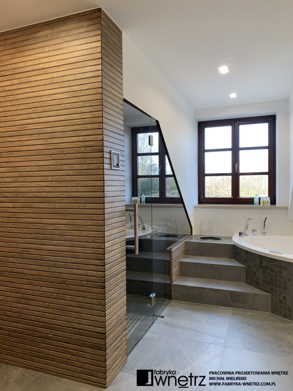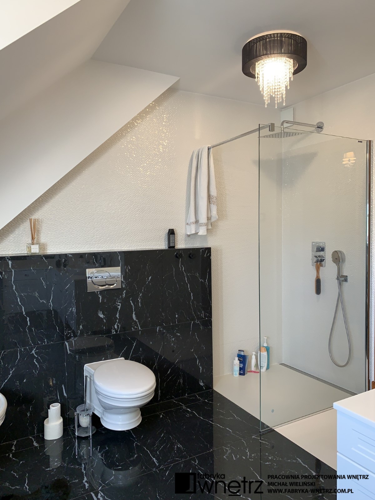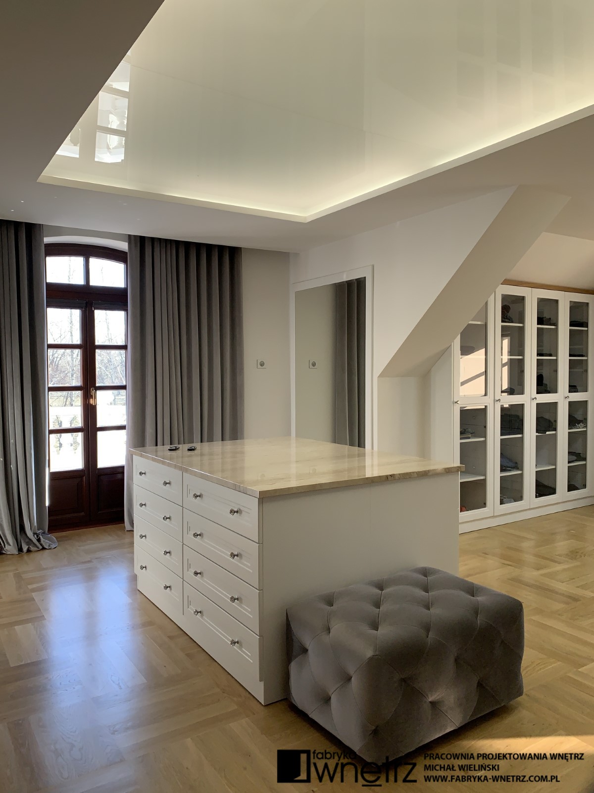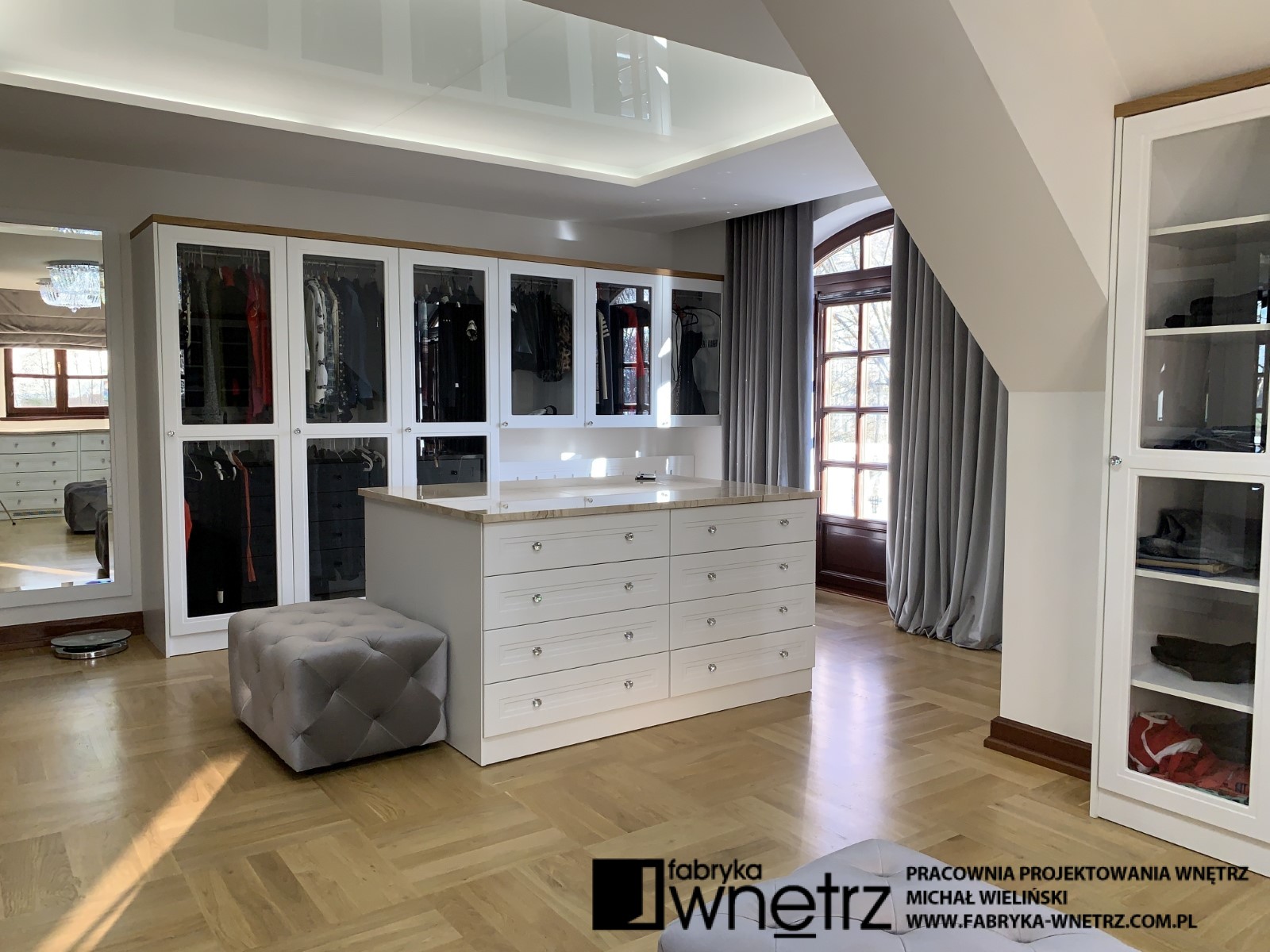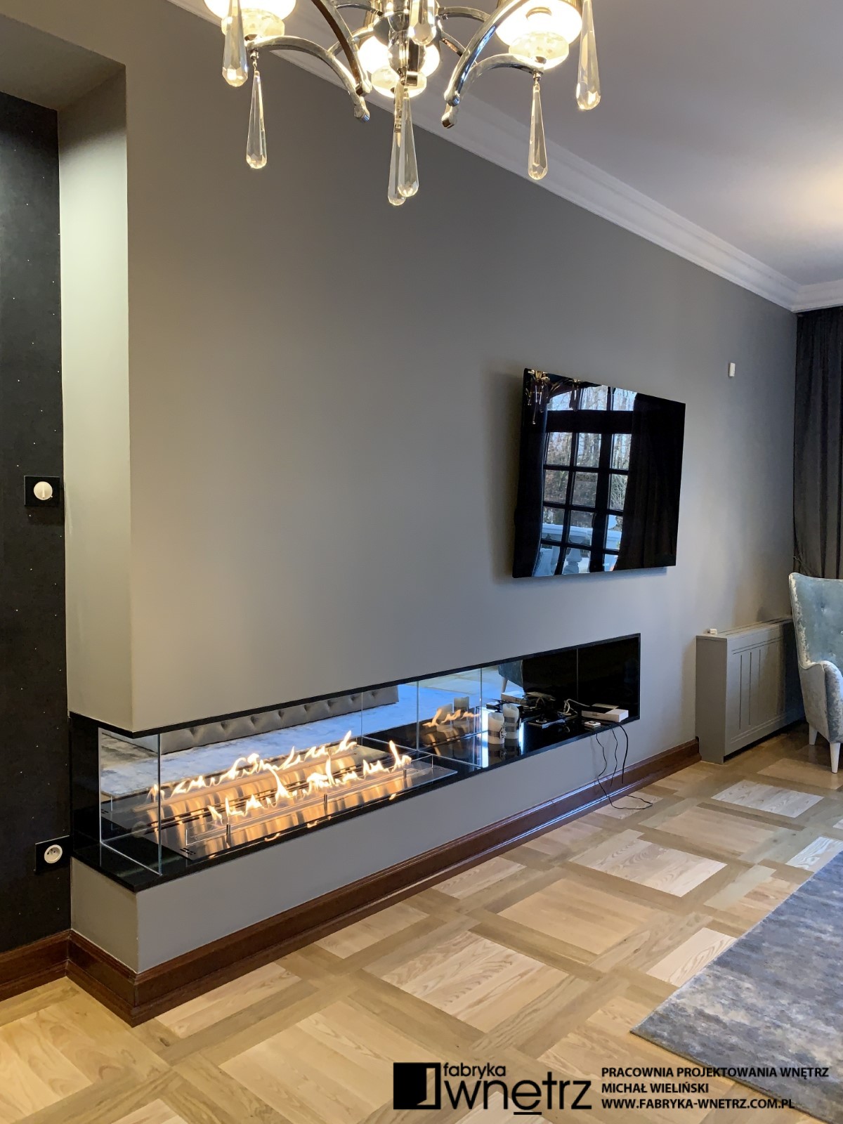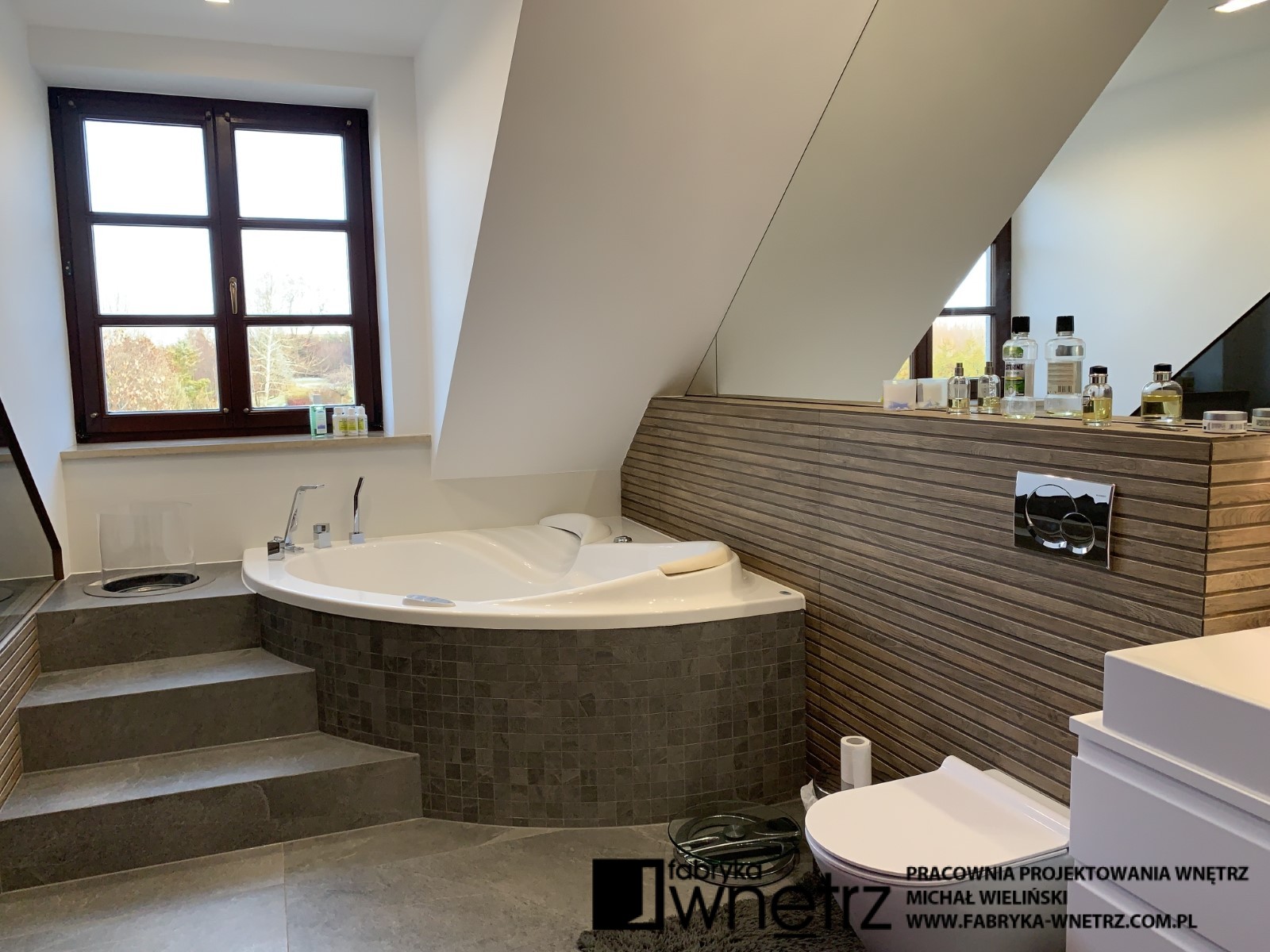 Naszym zadaniem, w tym klasycznym domu pod Koninem, był lifting kilku pomieszczeń na piętrze, kilku detali w salonie i stworzenie od podstaw ogrodu zimowego. Na piętrze projektowaliśmy wnętrza sypialni z garderobą i łazienką, oraz pokój młodzieżowy z garderobą i łazienką. W sypialni uwagę zwraca duży biokominek sterowany elektronicznie, oraz tapeta z kryształami Swarovskiego. W łazience, duże płytki gresowe w czarno-białej kolorystyce, oraz meble robione na zamówienie. Garderoba zachwyca swoim rozmiarem i pojemnością szaf. W pokoju młodzieżowym zastosowaliśmy otwierany podest z materacem, panele ścienne wykonane z kolorowej gąbki, oraz imitację betonu na ścianie za telewizorem. W łazience zaprojektowaliśmy saunę, biokominek, oraz sterowany elektronicznie prysznic. W salonie od nowa stworzyliśmy kominek i ścianę telewizyjną. Ogród zimowy zaprojektowaliśmy tak, aby zmieściły się w nim wygodne sofy, duży stół z 16 krzesłami, oraz dwie komody. Klimat tworzą ogromne przeszklenia, kryształowe żyrandole, oraz dwa wolnostojące biokominki.