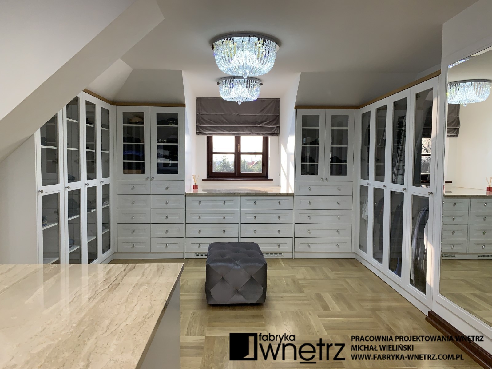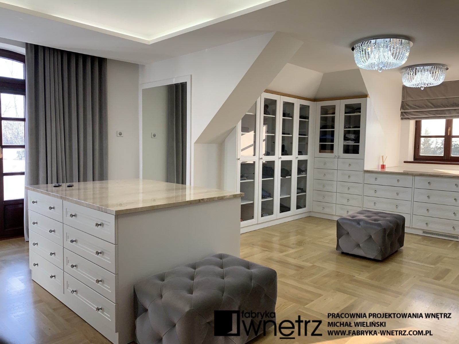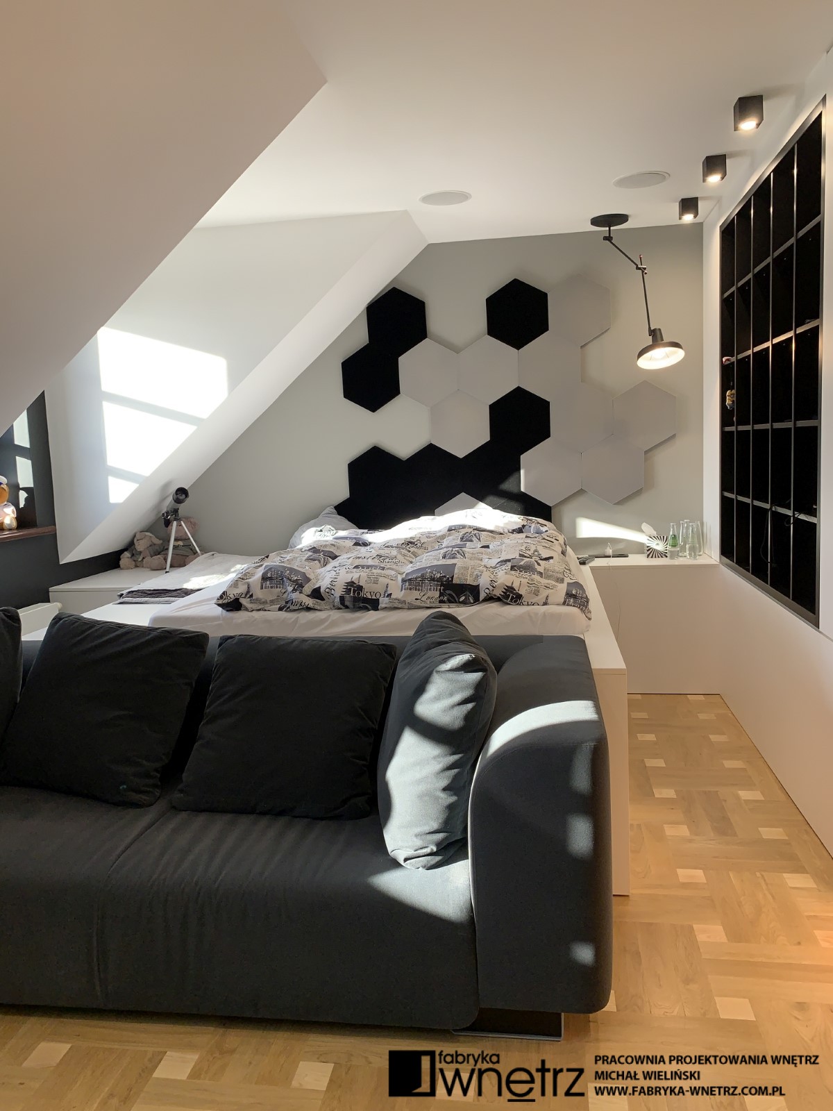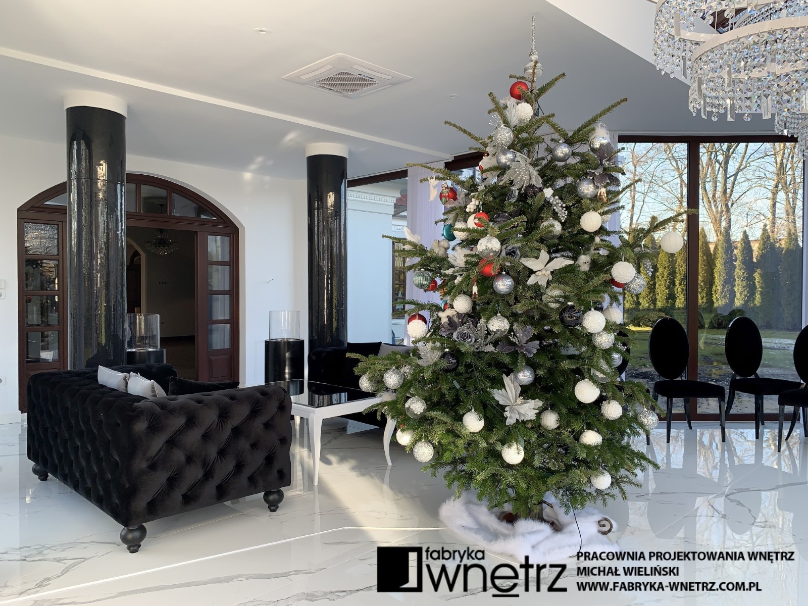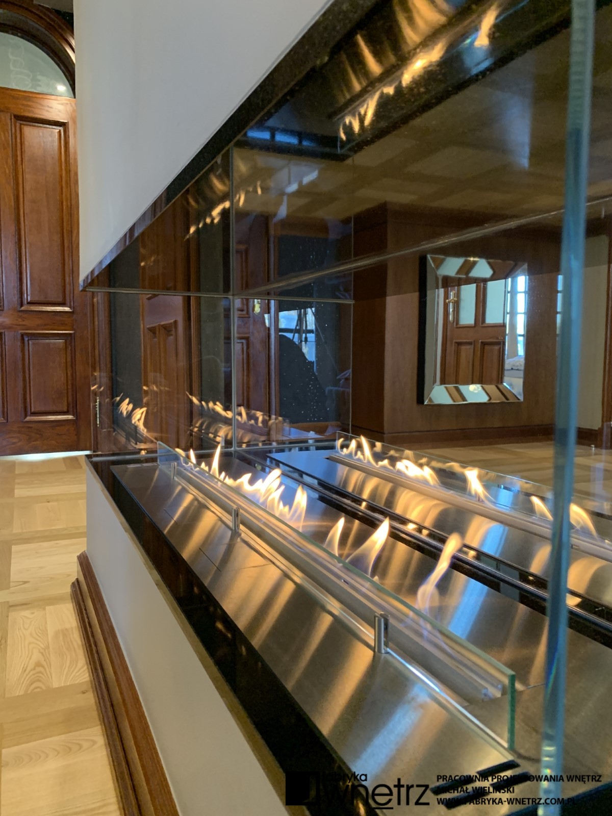 Naszym zadaniem, w tym klasycznym domu pod Koninem, był lifting kilku pomieszczeń na piętrze, kilku detali w salonie i stworzenie od podstaw ogrodu zimowego. Na piętrze projektowaliśmy wnętrza sypialni z garderobą i łazienką, oraz pokój młodzieżowy z garderobą i łazienką. W sypialni uwagę zwraca duży biokominek sterowany elektronicznie, oraz tapeta z kryształami Swarovskiego. W łazience, duże płytki gresowe w czarno-białej kolorystyce, oraz meble robione na zamówienie. Garderoba zachwyca swoim rozmiarem i pojemnością szaf. W pokoju młodzieżowym zastosowaliśmy otwierany podest z materacem, panele ścienne wykonane z kolorowej gąbki, oraz imitację betonu na ścianie za telewizorem. W łazience zaprojektowaliśmy saunę, biokominek, oraz sterowany elektronicznie prysznic. W salonie od nowa stworzyliśmy kominek i ścianę telewizyjną. Ogród zimowy zaprojektowaliśmy tak, aby zmieściły się w nim wygodne sofy, duży stół z 16 krzesłami, oraz dwie komody. Klimat tworzą ogromne przeszklenia, kryształowe żyrandole, oraz dwa wolnostojące biokominki.