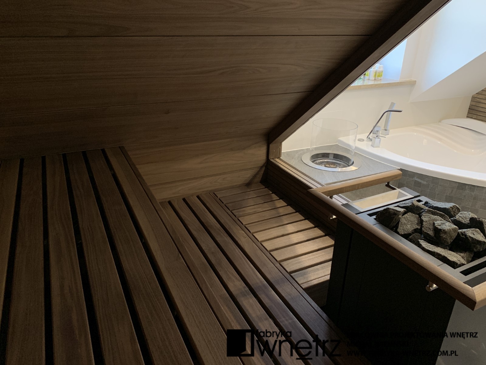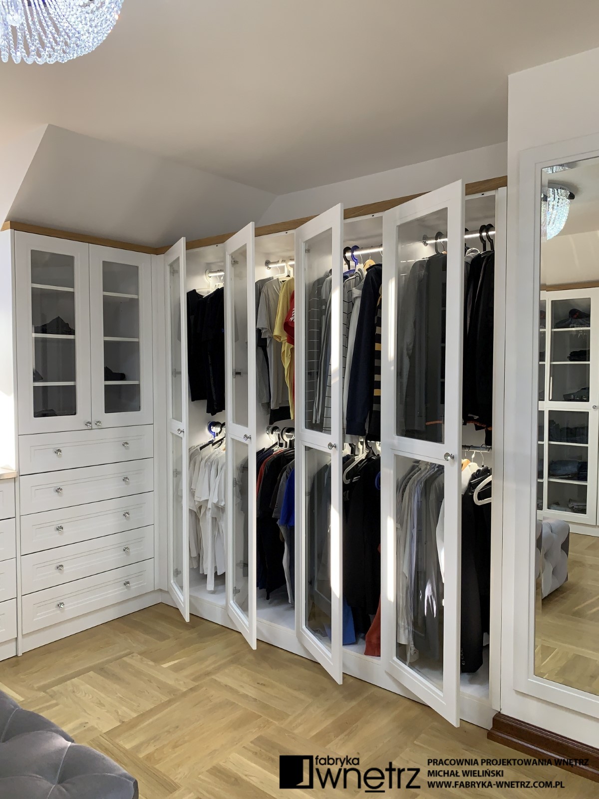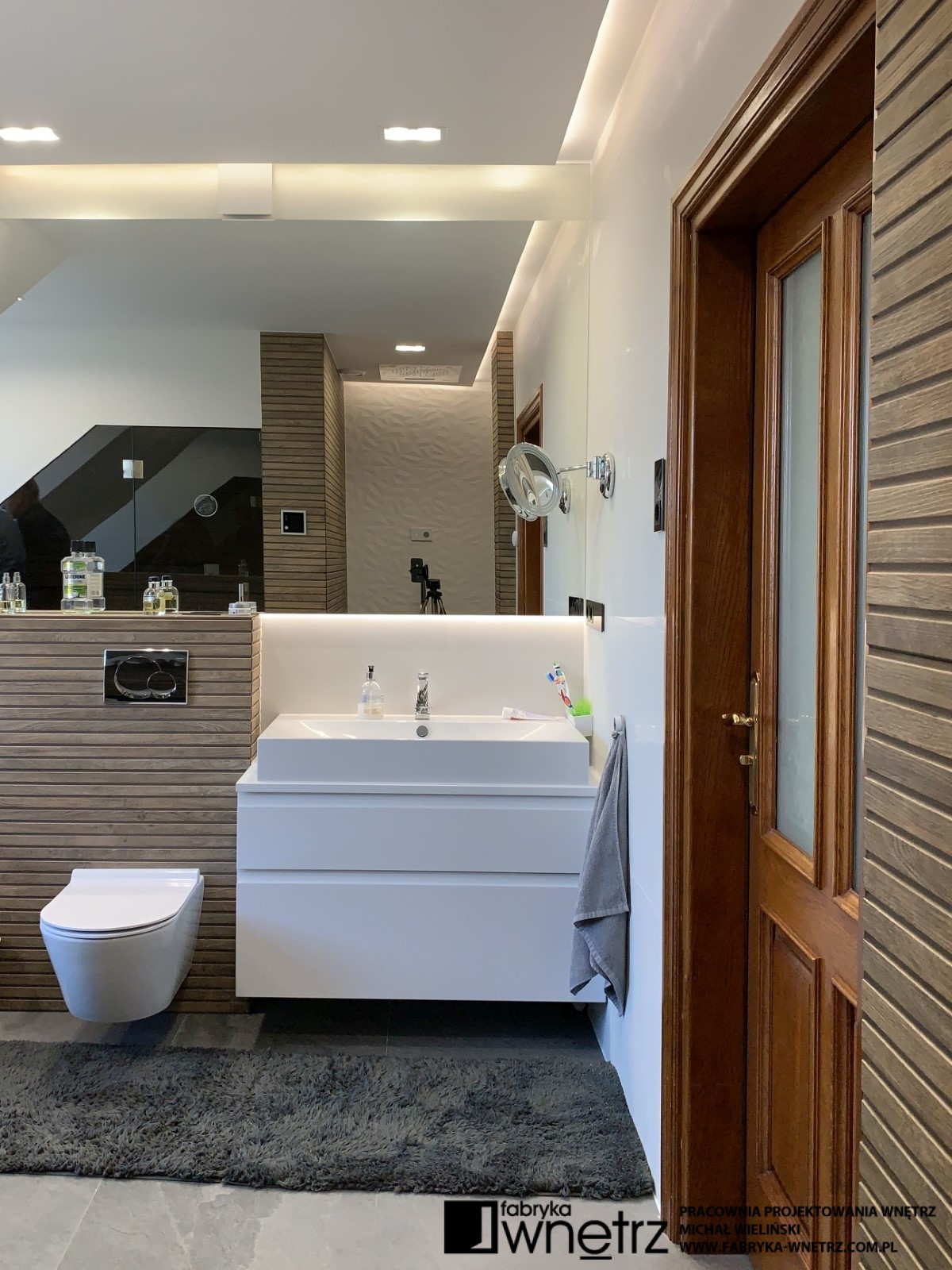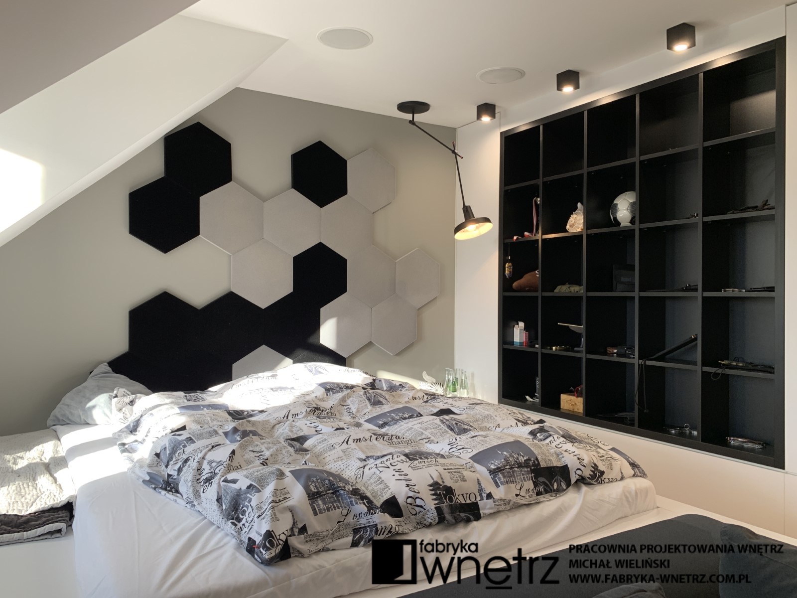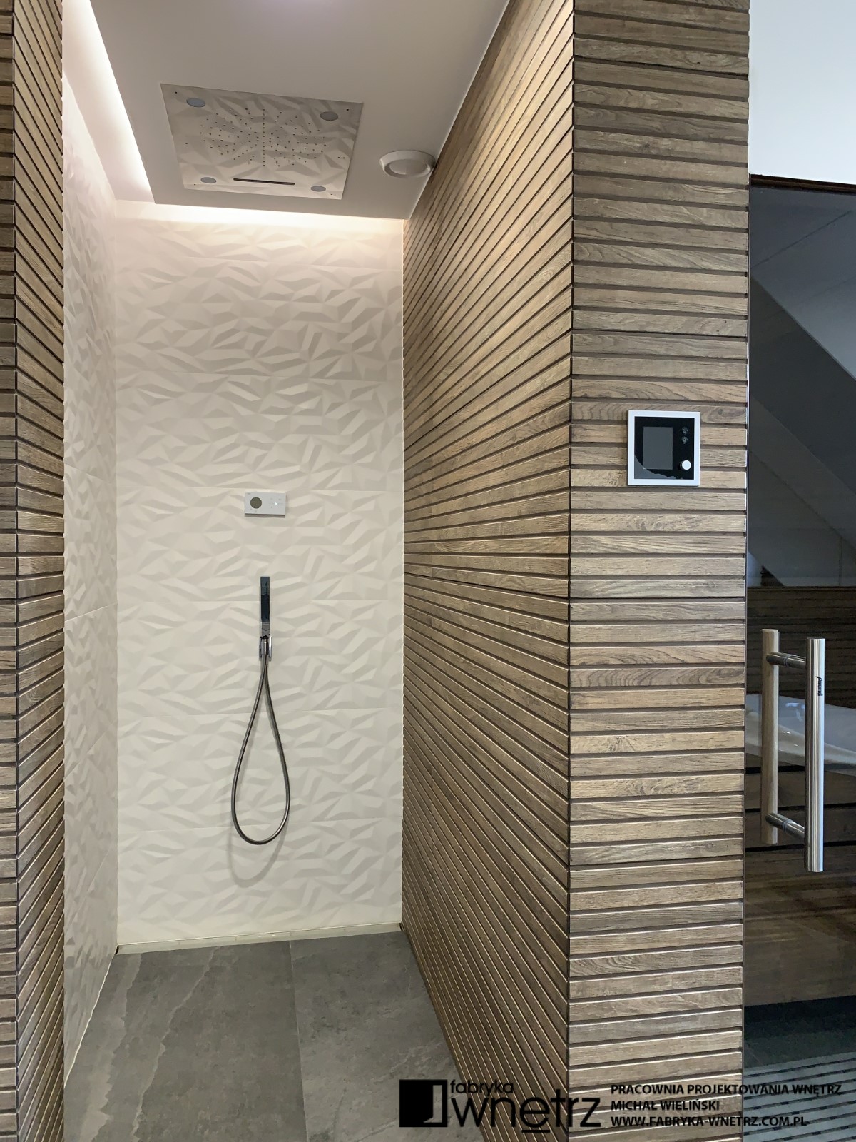 Naszym zadaniem, w tym klasycznym domu pod Koninem, był lifting kilku pomieszczeń na piętrze, kilku detali w salonie i stworzenie od podstaw ogrodu zimowego. Na piętrze projektowaliśmy wnętrza sypialni z garderobą i łazienką, oraz pokój młodzieżowy z garderobą i łazienką. W sypialni uwagę zwraca duży biokominek sterowany elektronicznie, oraz tapeta z kryształami Swarovskiego. W łazience, duże płytki gresowe w czarno-białej kolorystyce, oraz meble robione na zamówienie. Garderoba zachwyca swoim rozmiarem i pojemnością szaf. W pokoju młodzieżowym zastosowaliśmy otwierany podest z materacem, panele ścienne wykonane z kolorowej gąbki, oraz imitację betonu na ścianie za telewizorem. W łazience zaprojektowaliśmy saunę, biokominek, oraz sterowany elektronicznie prysznic. W salonie od nowa stworzyliśmy kominek i ścianę telewizyjną. Ogród zimowy zaprojektowaliśmy tak, aby zmieściły się w nim wygodne sofy, duży stół z 16 krzesłami, oraz dwie komody. Klimat tworzą ogromne przeszklenia, kryształowe żyrandole, oraz dwa wolnostojące biokominki.