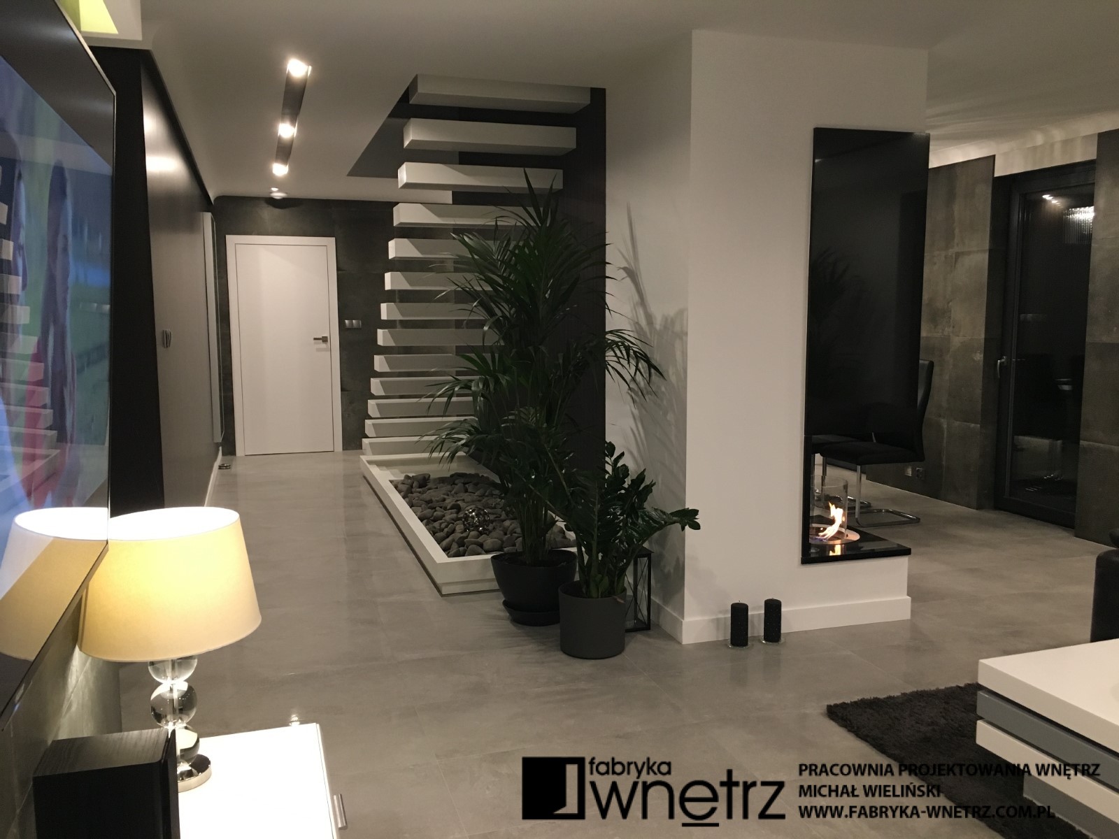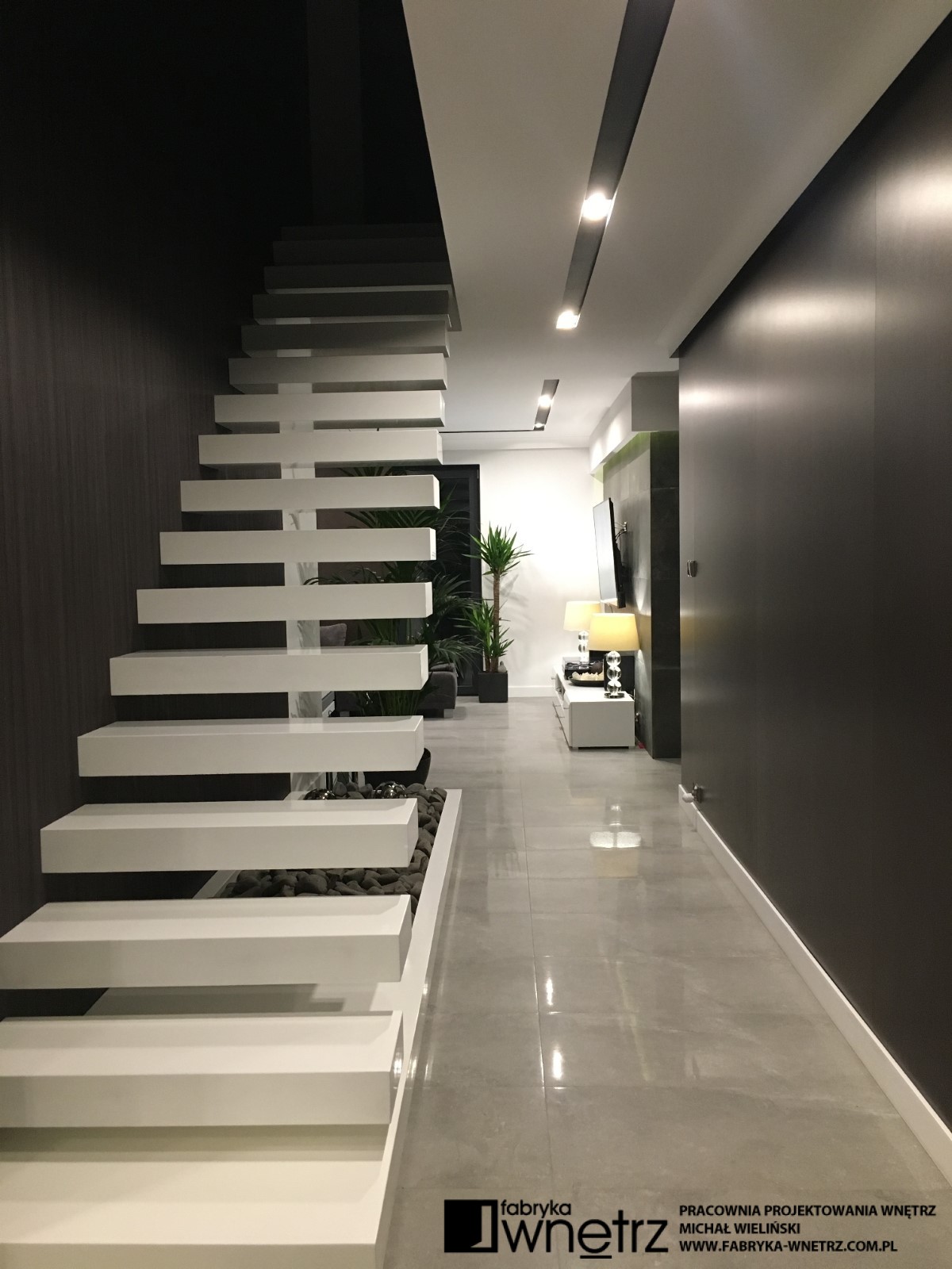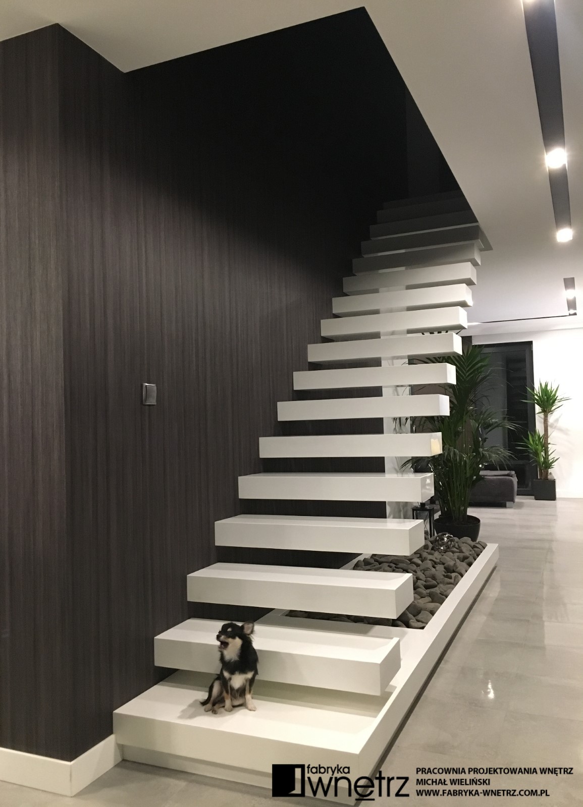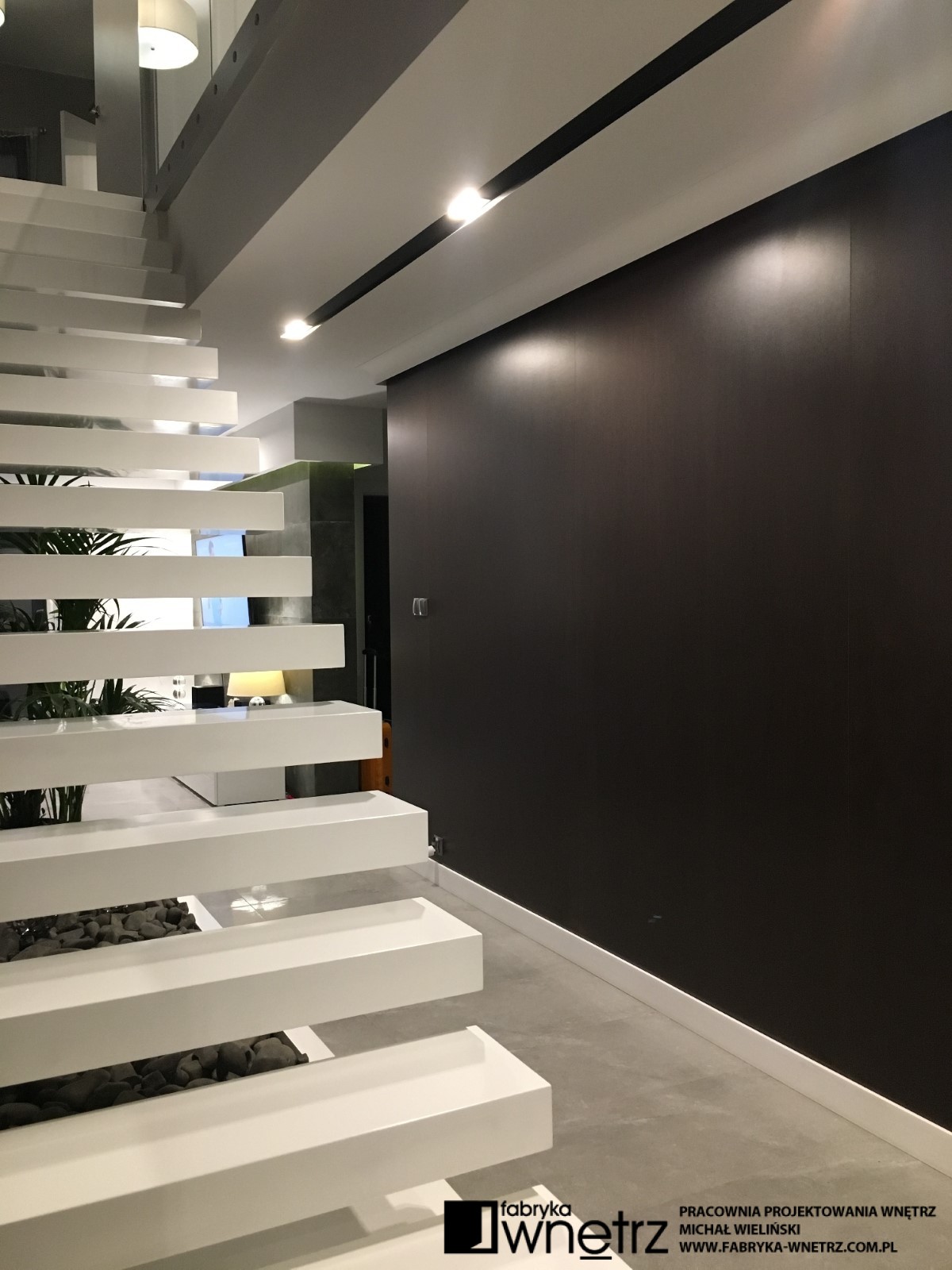 Wnętrza domu jednorodzinnego w Koninie. Biel, czerń, szarości i ciemne drewno. To kolory dominujące w realizacji prezentowanej w tej galerii. Bogate wzory jasnego i ciemnego kamienia z gładkim wzorem drewna, bielą schodów i sufitów, tworzą udaną kompozycję w tym eleganckim i ponadczasowym wnętrzu. Szczególnie lekka konstrukcja białych schodów, z donicą tworzącą pierwszy stopień, zachwyca już od wejścia i zwiastuje pełne kontrastów zestawienia, w pozostałej części domu. Zaskakujący kominek i ogromna, bardzo wygodna kanapa zaprasza do wypoczynku. Czarne sufity w łazienkach zaskakują nie mniej niż wspomniany kominek i zachęcają do relaksu w prywatnych strefach wypoczynku.
