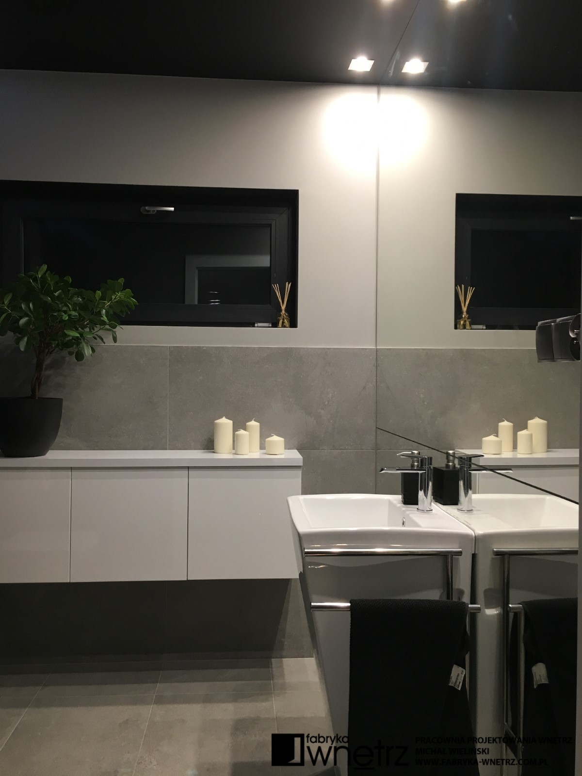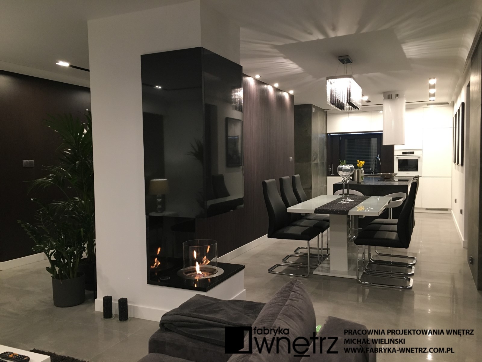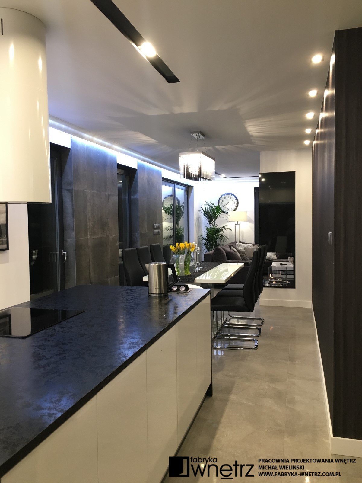 Wnętrza domu jednorodzinnego w Koninie. Biel, czerń, szarości i ciemne drewno. To kolory dominujące w realizacji prezentowanej w tej galerii. Bogate wzory jasnego i ciemnego kamienia z gładkim wzorem drewna, bielą schodów i sufitów, tworzą udaną kompozycję w tym eleganckim i ponadczasowym wnętrzu. Szczególnie lekka konstrukcja białych schodów, z donicą tworzącą pierwszy stopień, zachwyca już od wejścia i zwiastuje pełne kontrastów zestawienia, w pozostałej części domu. Zaskakujący kominek i ogromna, bardzo wygodna kanapa zaprasza do wypoczynku. Czarne sufity w łazienkach zaskakują nie mniej niż wspomniany kominek i zachęcają do relaksu w prywatnych strefach wypoczynku.