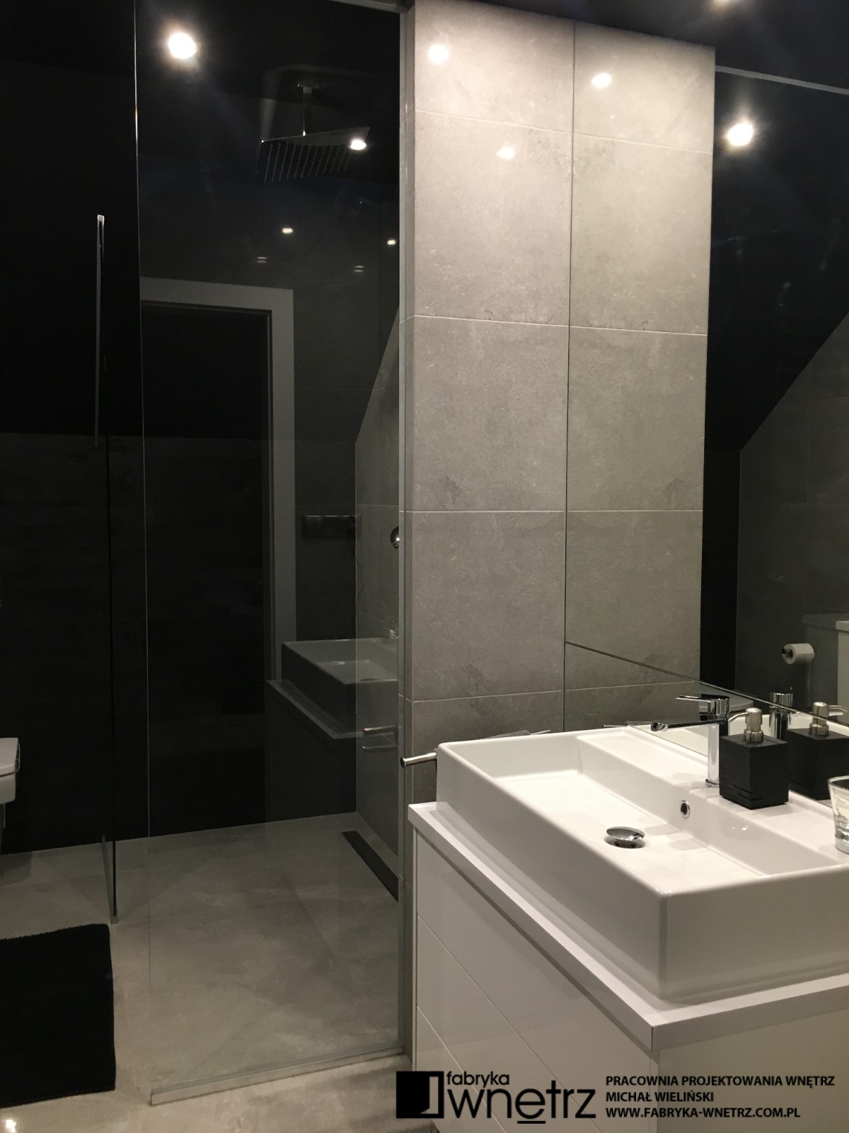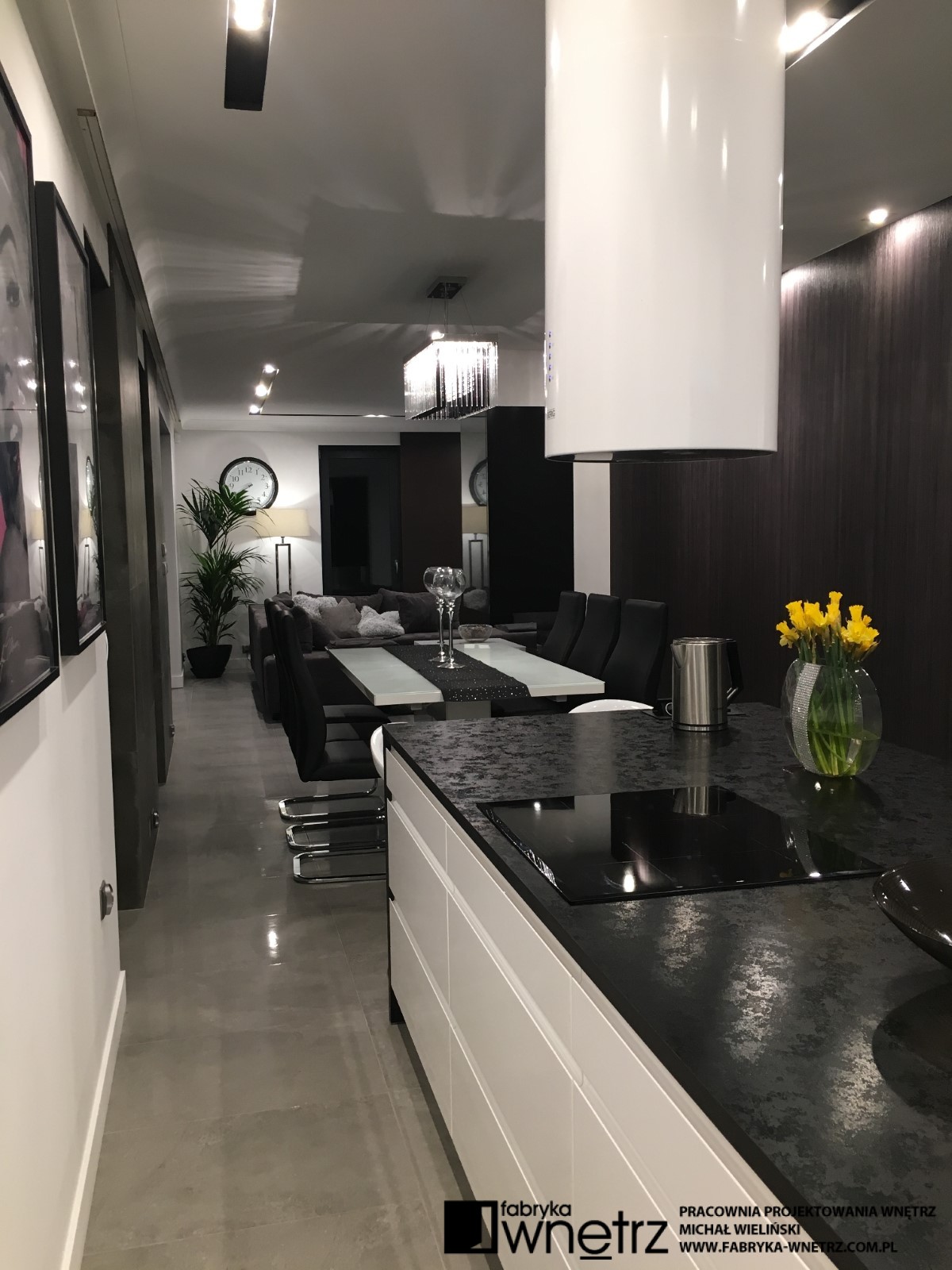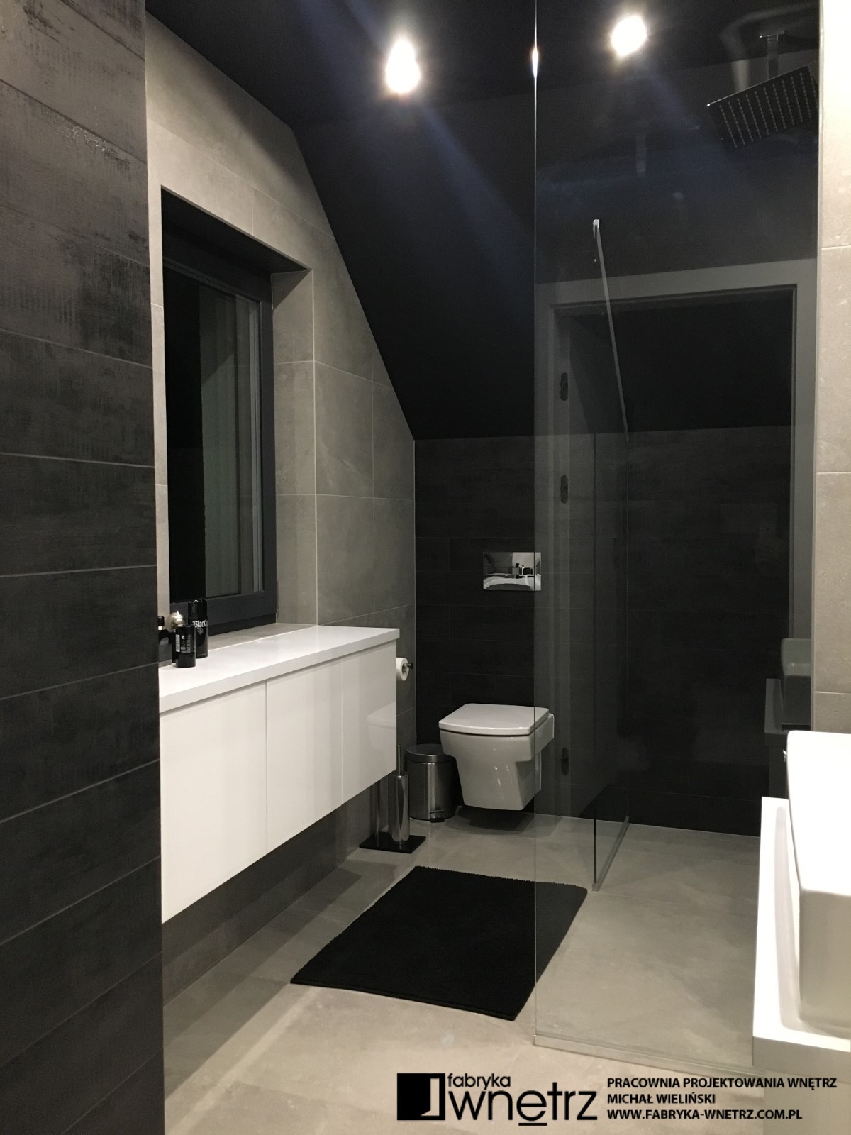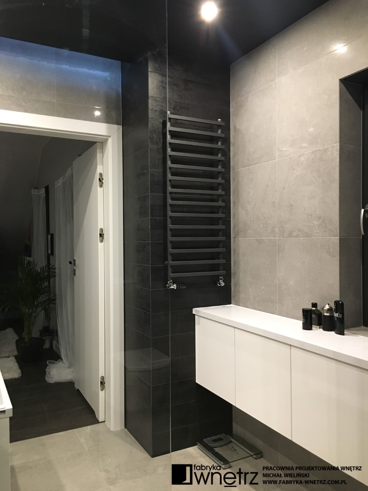 Wnętrza domu jednorodzinnego w Koninie. Biel, czerń, szarości i ciemne drewno. To kolory dominujące w realizacji prezentowanej w tej galerii. Bogate wzory jasnego i ciemnego kamienia z gładkim wzorem drewna, bielą schodów i sufitów, tworzą udaną kompozycję w tym eleganckim i ponadczasowym wnętrzu. Szczególnie lekka konstrukcja białych schodów, z donicą tworzącą pierwszy stopień, zachwyca już od wejścia i zwiastuje pełne kontrastów zestawienia, w pozostałej części domu. Zaskakujący kominek i ogromna, bardzo wygodna kanapa zaprasza do wypoczynku. Czarne sufity w łazienkach zaskakują nie mniej niż wspomniany kominek i zachęcają do relaksu w prywatnych strefach wypoczynku.