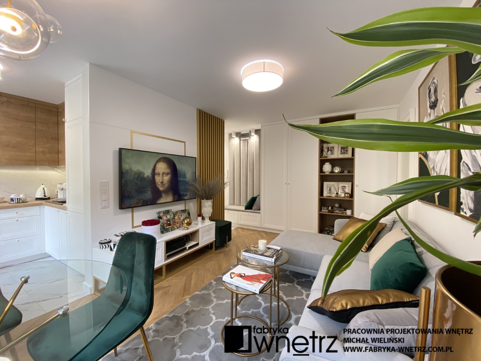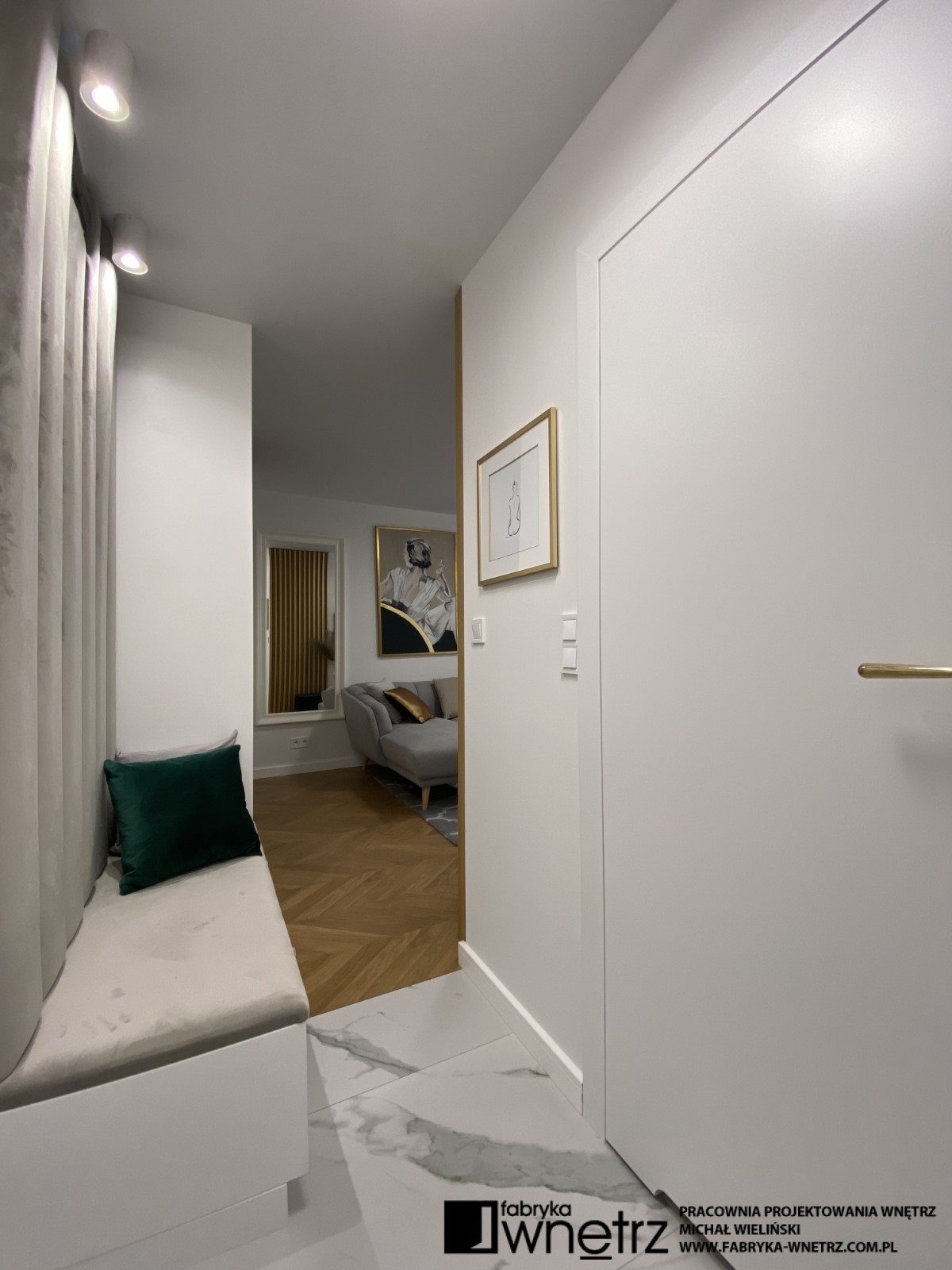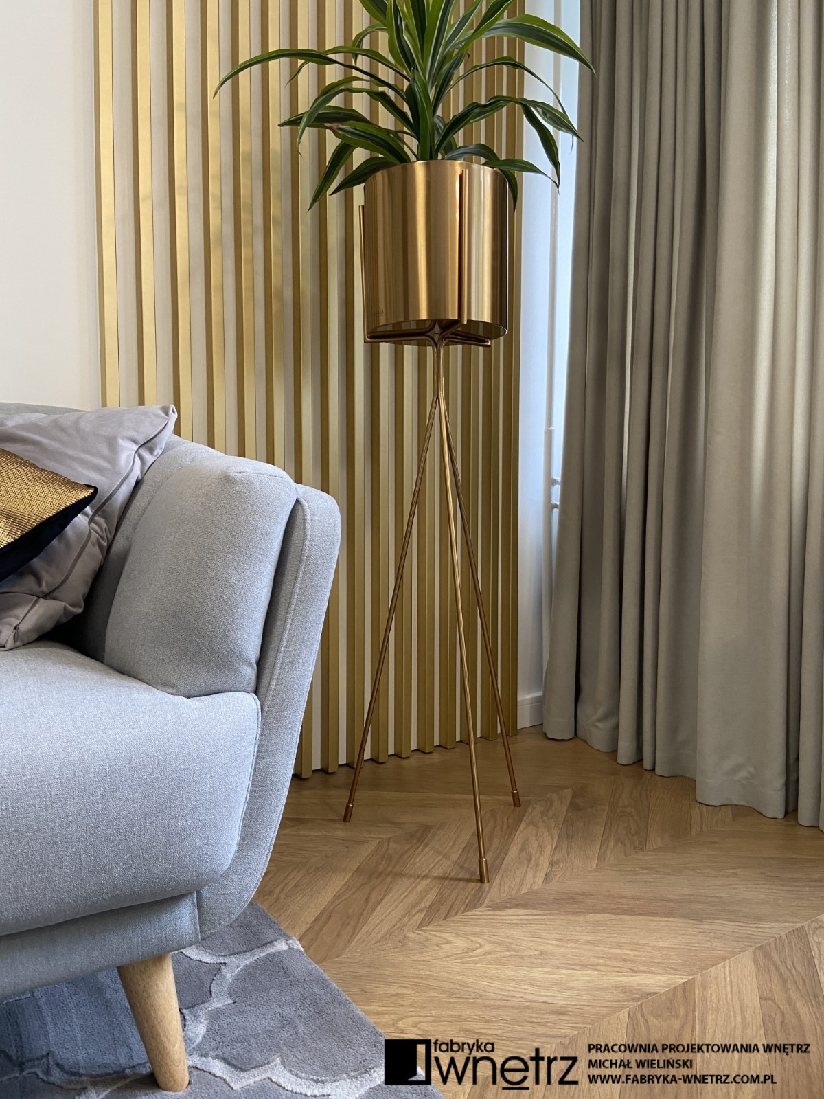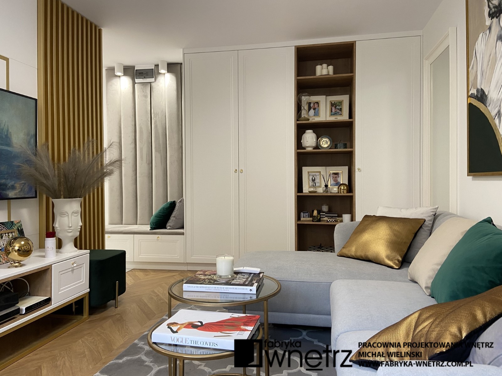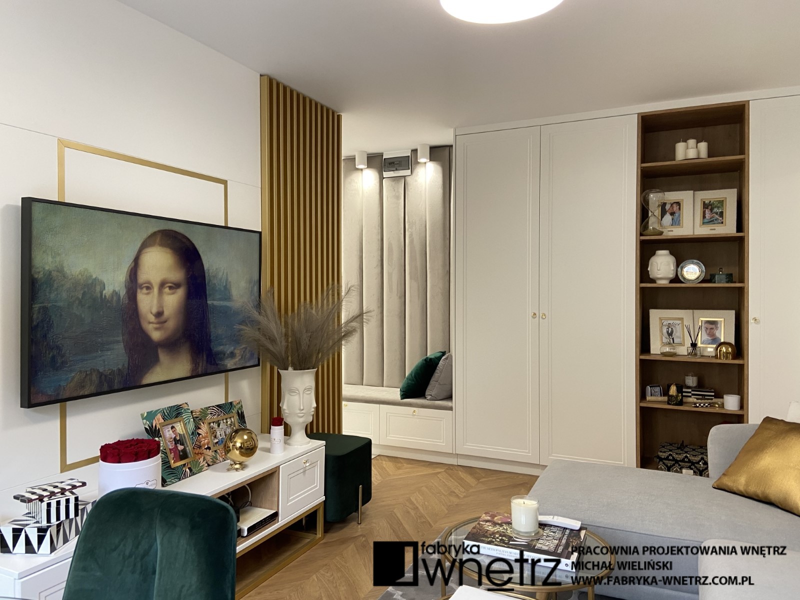 Mieszkanie na styku stylu nowoczesnego i modern classic w Koninie. Zaprojektowane i wykończone przez naszą pracownię, w 100% pod klucz. Inwestor mógł skupić się tylko i wyłącznie na finansowaniu całej inwestycji i obejrzeć dopiero efekt końcowy naszej pracy. Resztą zajęliśmy się my. Motywem przewodnim w tym wnętrzu jest kolor złoty, który pojawia się zarówno w stałych elementach zabudowy, lampach, klamkach, uchwytach, jak i w meblach, akcesoriach łazienkowych, oraz w sztuce, która obecna jest w tym mieszkaniu na każdym kroku. Niewielkie mieszkanie o powierzchni 38m2, zyskało na przestrzeni, poprzez wyburzenie fragmentów ścian, otwierając na salon kuchnię i przedpokój. Drewno, tkaniny, dywany, roślinność i dodatki, wprowadzają bardzo przytulny klimat. Tapicerowane fragmenty ścian nad łóżkiem i siedziskiem, w połączeniu z nastrojowym oświetleniem, pozwalają na wieczorny relaks po trudach całego dnia. W całym mieszkaniu udało nam się zmieścić bardzo dużą ilość szaf, aby wnętrze mogło cieszyć otwartą, uporządkowaną przestrzenią.