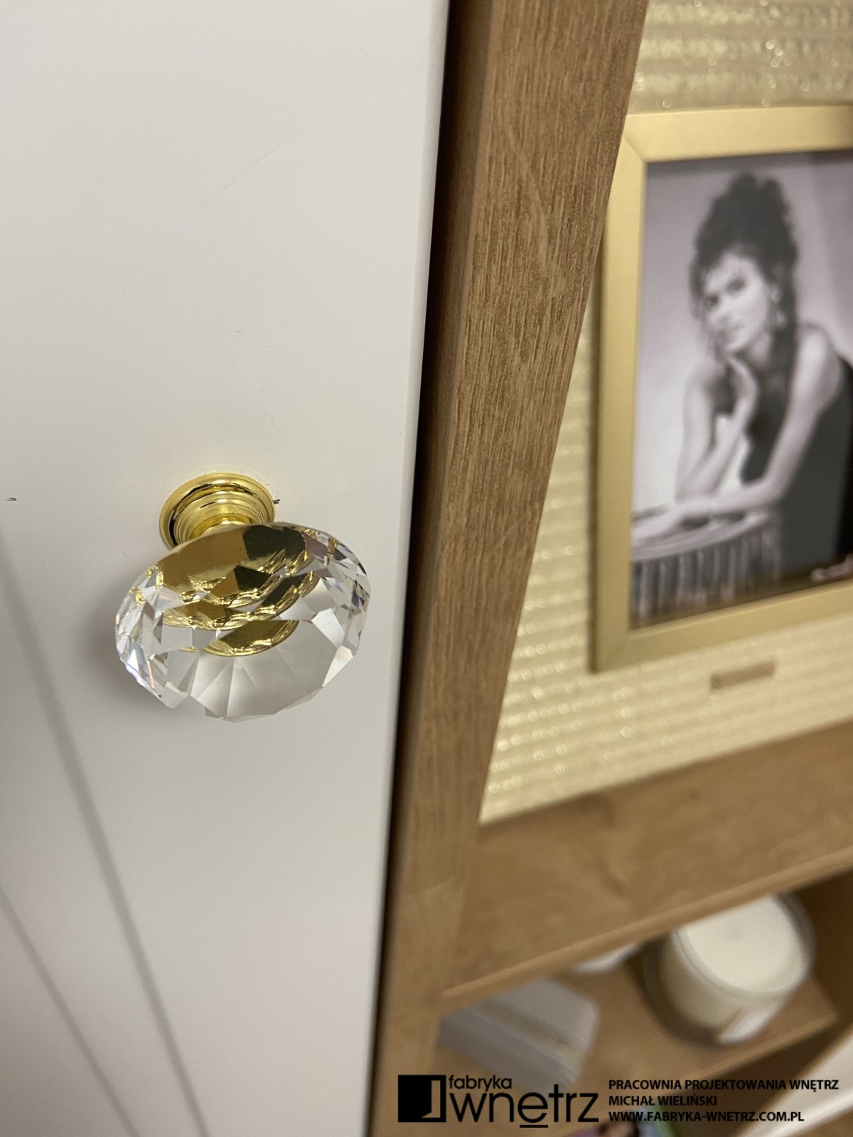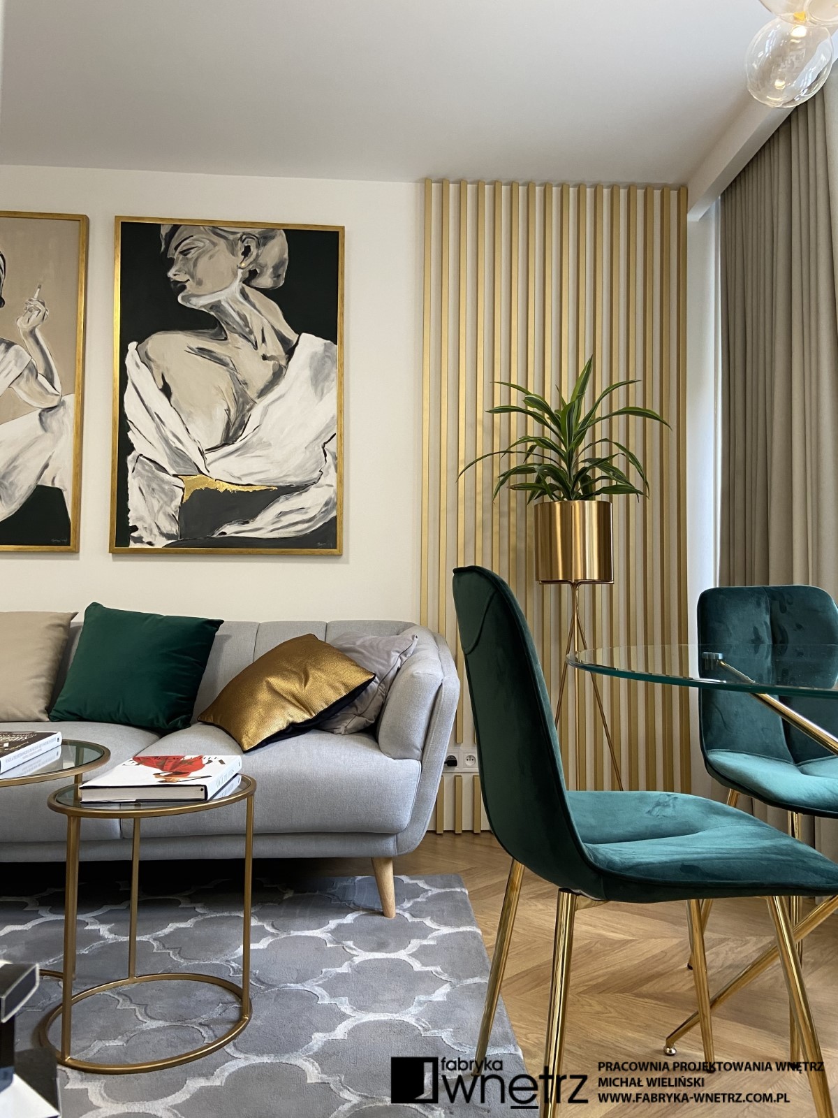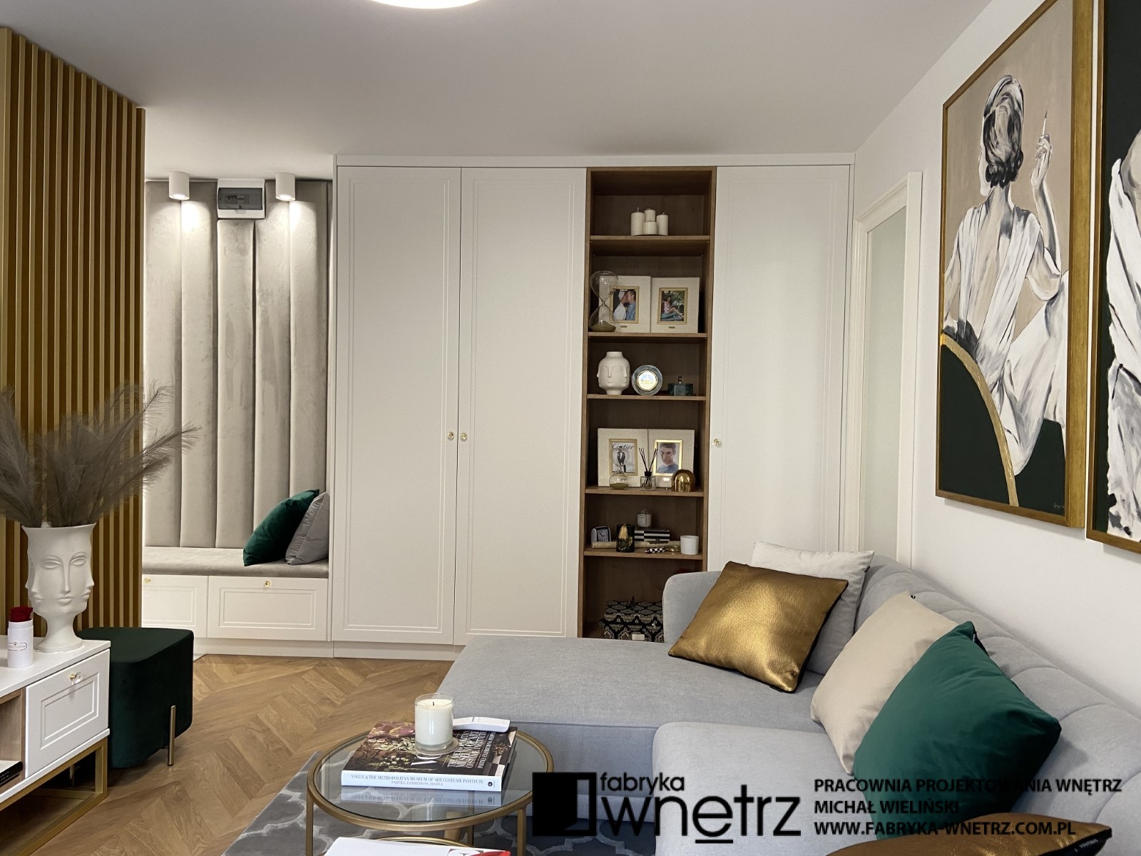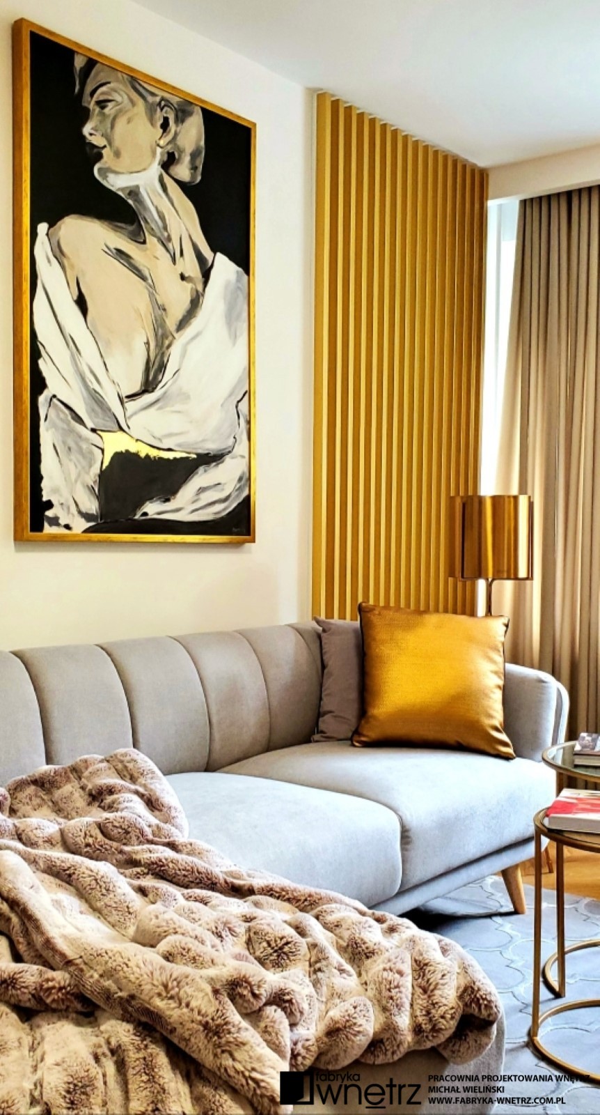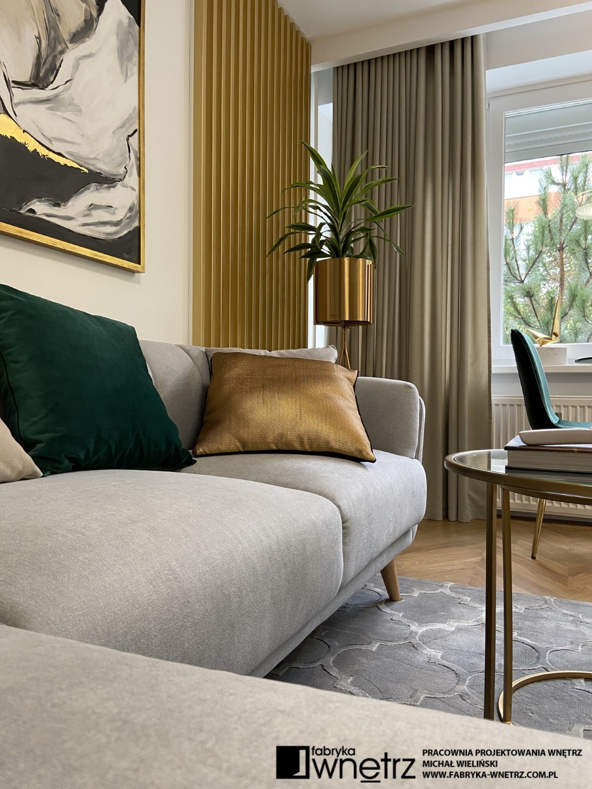 Mieszkanie na styku stylu nowoczesnego i modern classic w Koninie. Zaprojektowane i wykończone przez naszą pracownię, w 100% pod klucz. Inwestor mógł skupić się tylko i wyłącznie na finansowaniu całej inwestycji i obejrzeć dopiero efekt końcowy naszej pracy. Resztą zajęliśmy się my. Motywem przewodnim w tym wnętrzu jest kolor złoty, który pojawia się zarówno w stałych elementach zabudowy, lampach, klamkach, uchwytach, jak i w meblach, akcesoriach łazienkowych, oraz w sztuce, która obecna jest w tym mieszkaniu na każdym kroku. Niewielkie mieszkanie o powierzchni 38m2, zyskało na przestrzeni, poprzez wyburzenie fragmentów ścian, otwierając na salon kuchnię i przedpokój. Drewno, tkaniny, dywany, roślinność i dodatki, wprowadzają bardzo przytulny klimat. Tapicerowane fragmenty ścian nad łóżkiem i siedziskiem, w połączeniu z nastrojowym oświetleniem, pozwalają na wieczorny relaks po trudach całego dnia. W całym mieszkaniu udało nam się zmieścić bardzo dużą ilość szaf, aby wnętrze mogło cieszyć otwartą, uporządkowaną przestrzenią.