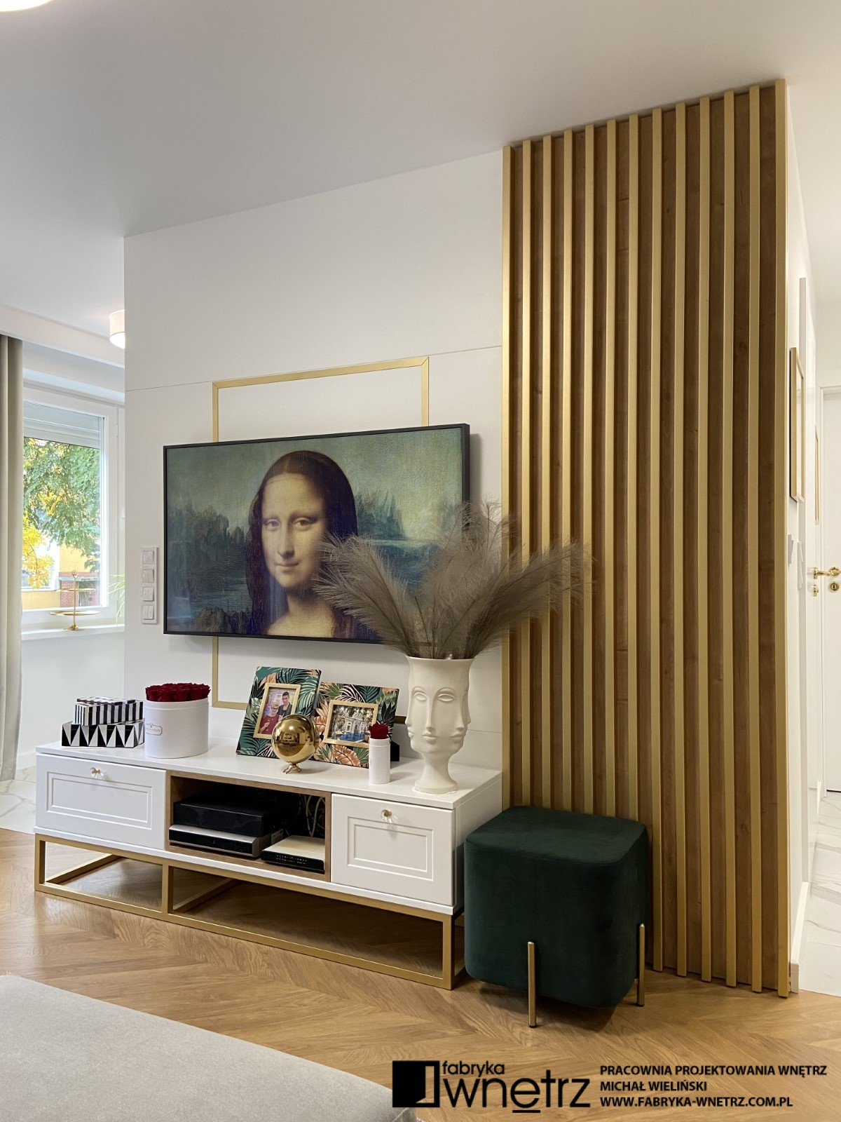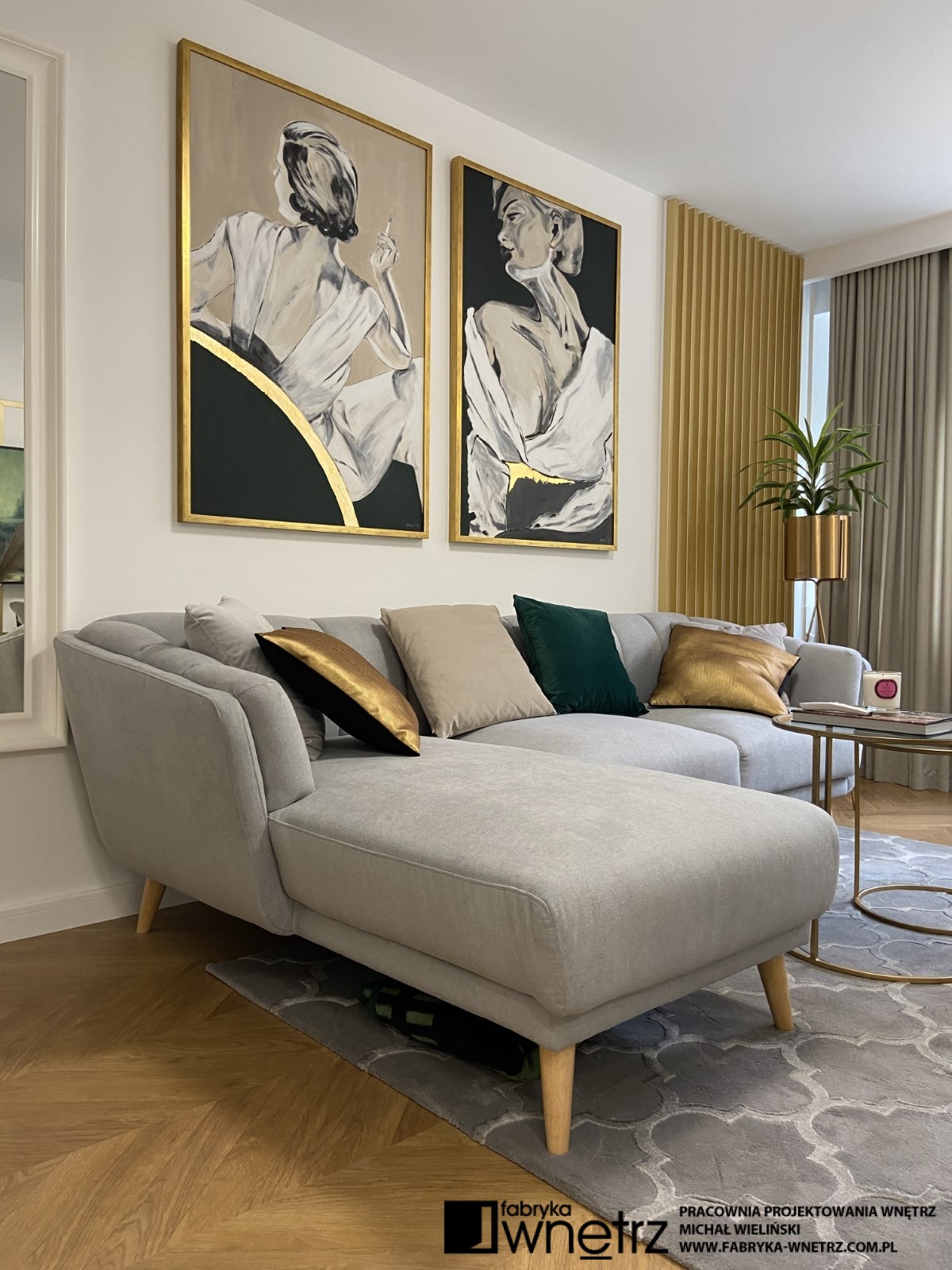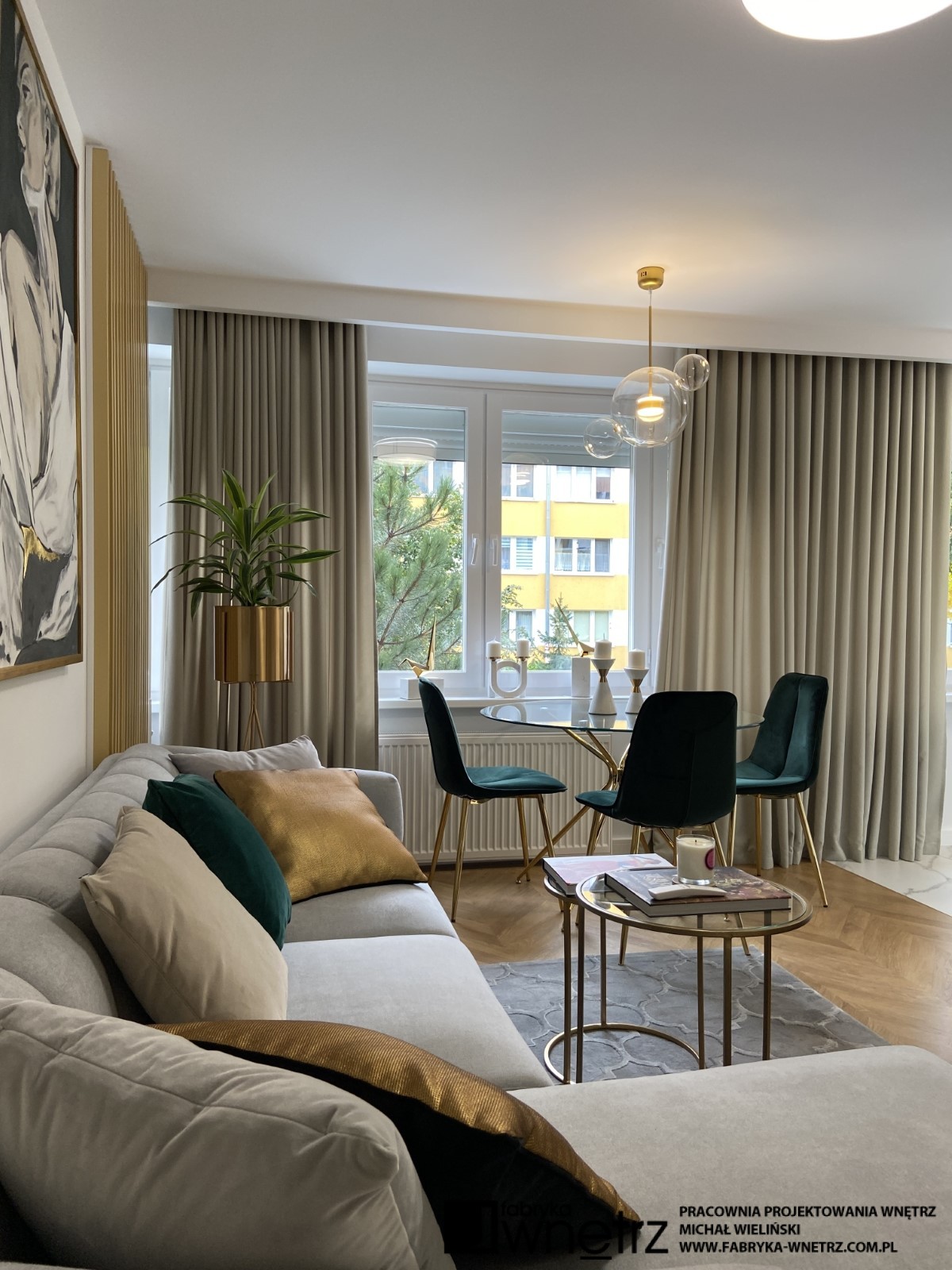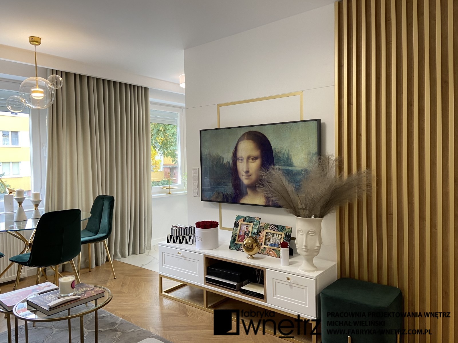 Mieszkanie na styku stylu nowoczesnego i modern classic w Koninie. Zaprojektowane i wykończone przez naszą pracownię, w 100% pod klucz. Inwestor mógł skupić się tylko i wyłącznie na finansowaniu całej inwestycji i obejrzeć dopiero efekt końcowy naszej pracy. Resztą zajęliśmy się my. Motywem przewodnim w tym wnętrzu jest kolor złoty, który pojawia się zarówno w stałych elementach zabudowy, lampach, klamkach, uchwytach, jak i w meblach, akcesoriach łazienkowych, oraz w sztuce, która obecna jest w tym mieszkaniu na każdym kroku. Niewielkie mieszkanie o powierzchni 38m2, zyskało na przestrzeni, poprzez wyburzenie fragmentów ścian, otwierając na salon kuchnię i przedpokój. Drewno, tkaniny, dywany, roślinność i dodatki, wprowadzają bardzo przytulny klimat. Tapicerowane fragmenty ścian nad łóżkiem i siedziskiem, w połączeniu z nastrojowym oświetleniem, pozwalają na wieczorny relaks po trudach całego dnia. W całym mieszkaniu udało nam się zmieścić bardzo dużą ilość szaf, aby wnętrze mogło cieszyć otwartą, uporządkowaną przestrzenią.