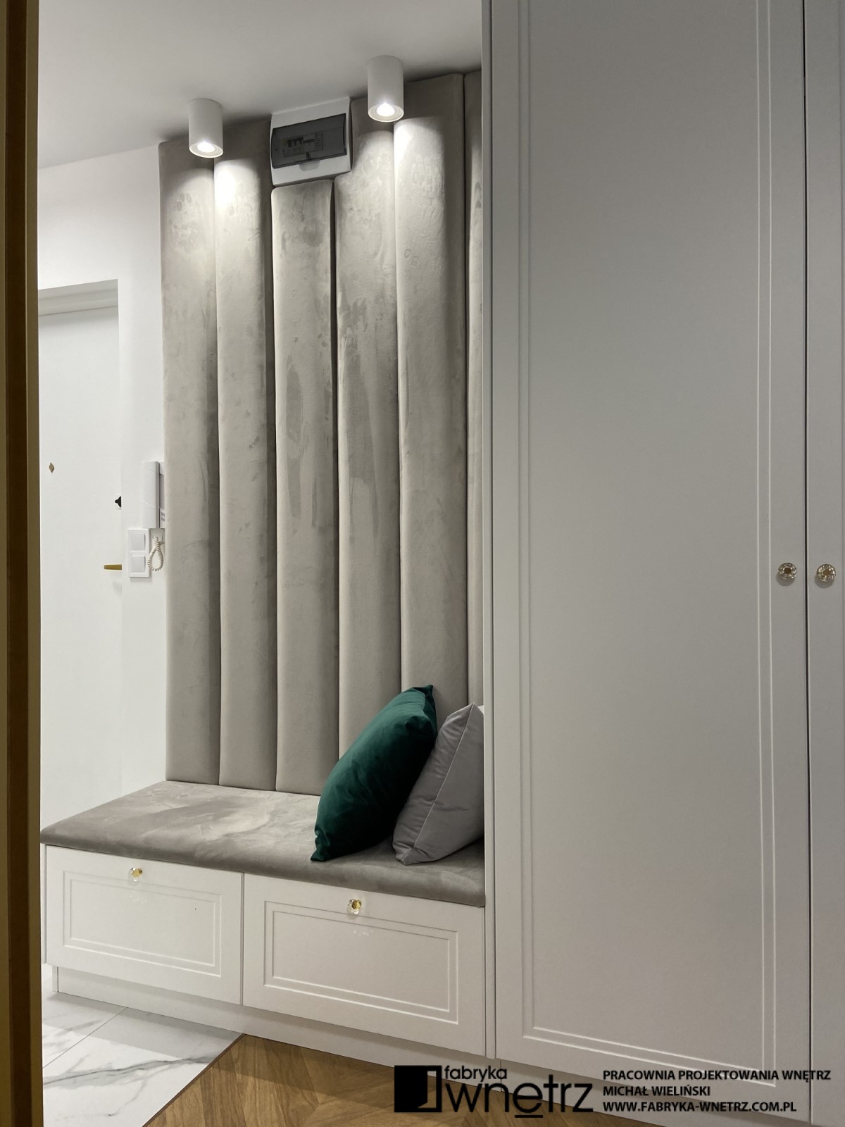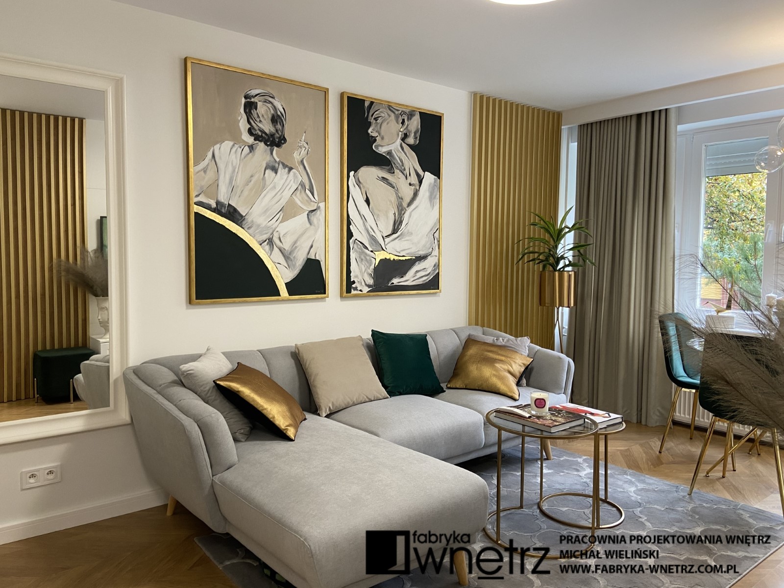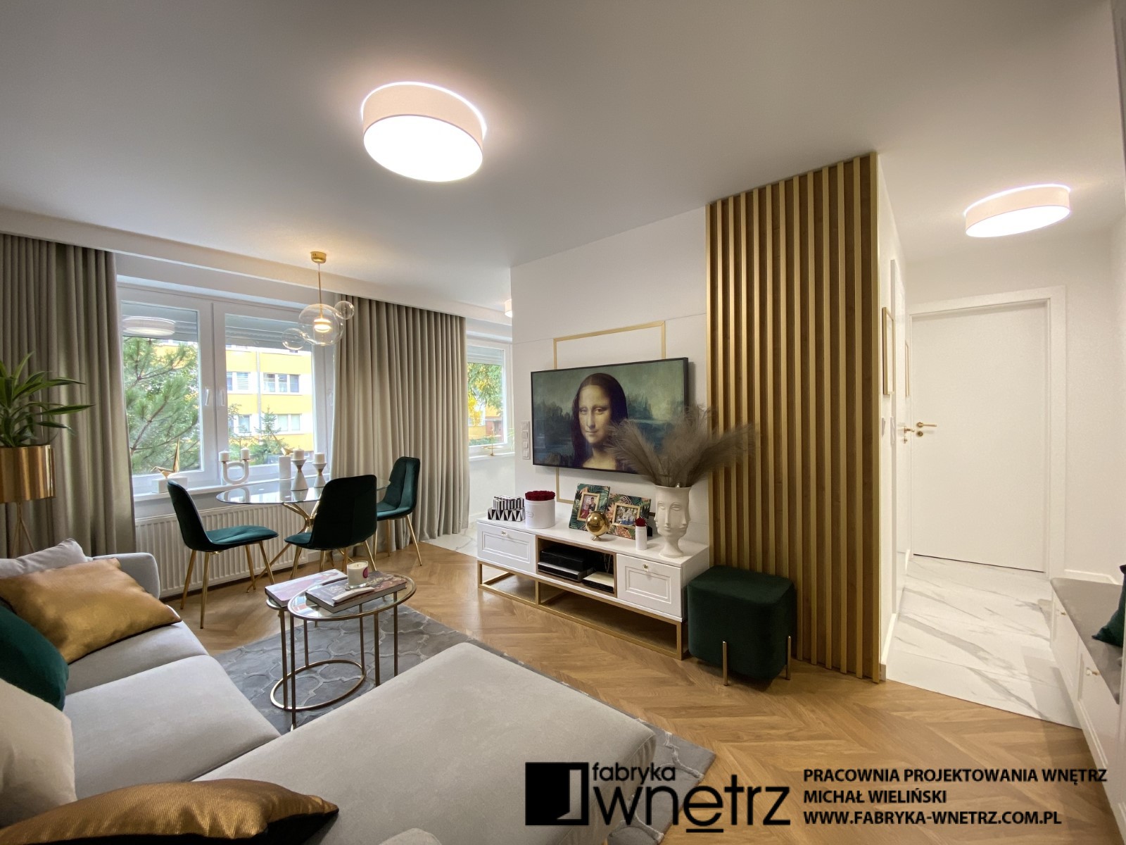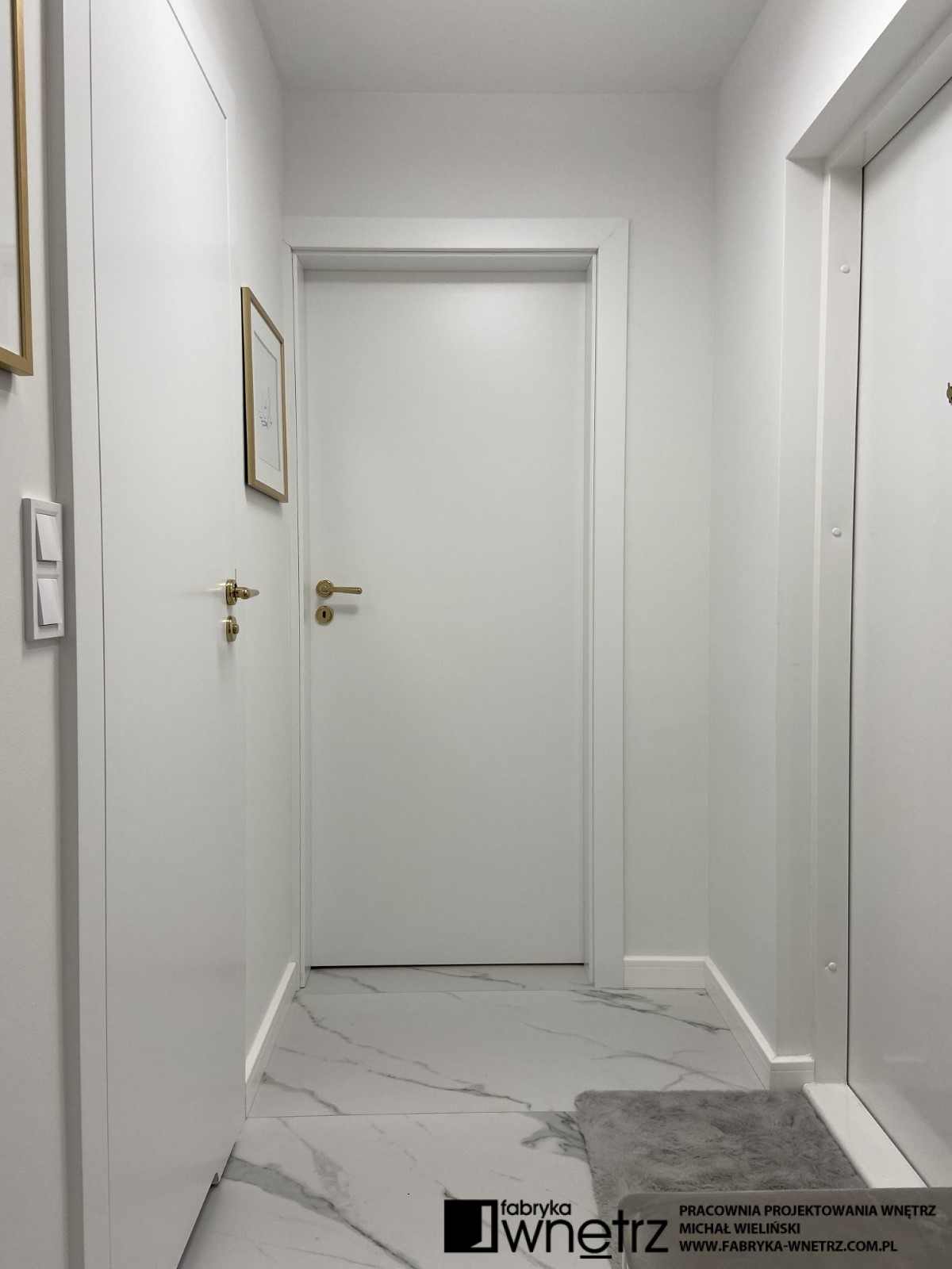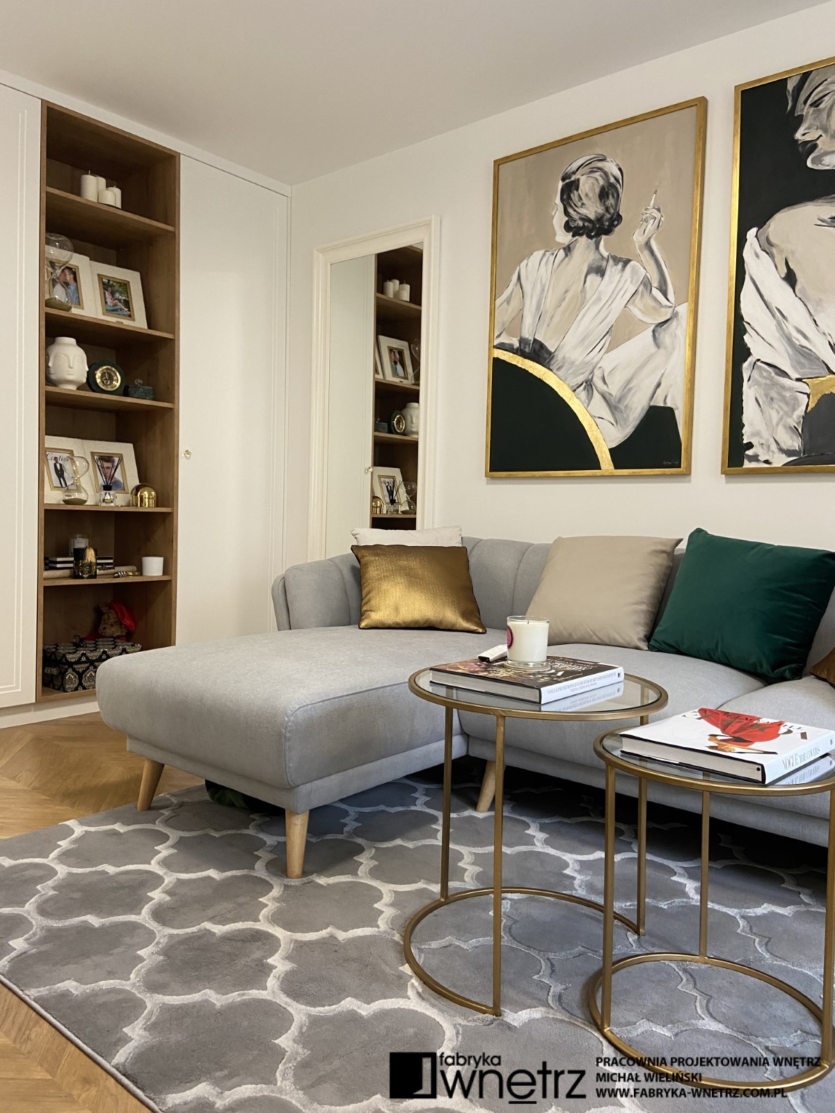 Mieszkanie na styku stylu nowoczesnego i modern classic w Koninie. Zaprojektowane i wykończone przez naszą pracownię, w 100% pod klucz. Inwestor mógł skupić się tylko i wyłącznie na finansowaniu całej inwestycji i obejrzeć dopiero efekt końcowy naszej pracy. Resztą zajęliśmy się my. Motywem przewodnim w tym wnętrzu jest kolor złoty, który pojawia się zarówno w stałych elementach zabudowy, lampach, klamkach, uchwytach, jak i w meblach, akcesoriach łazienkowych, oraz w sztuce, która obecna jest w tym mieszkaniu na każdym kroku. Niewielkie mieszkanie o powierzchni 38m2, zyskało na przestrzeni, poprzez wyburzenie fragmentów ścian, otwierając na salon kuchnię i przedpokój. Drewno, tkaniny, dywany, roślinność i dodatki, wprowadzają bardzo przytulny klimat. Tapicerowane fragmenty ścian nad łóżkiem i siedziskiem, w połączeniu z nastrojowym oświetleniem, pozwalają na wieczorny relaks po trudach całego dnia. W całym mieszkaniu udało nam się zmieścić bardzo dużą ilość szaf, aby wnętrze mogło cieszyć otwartą, uporządkowaną przestrzenią.