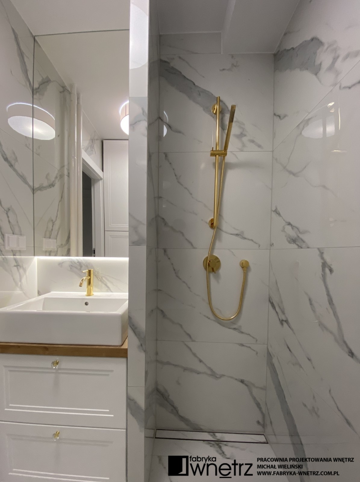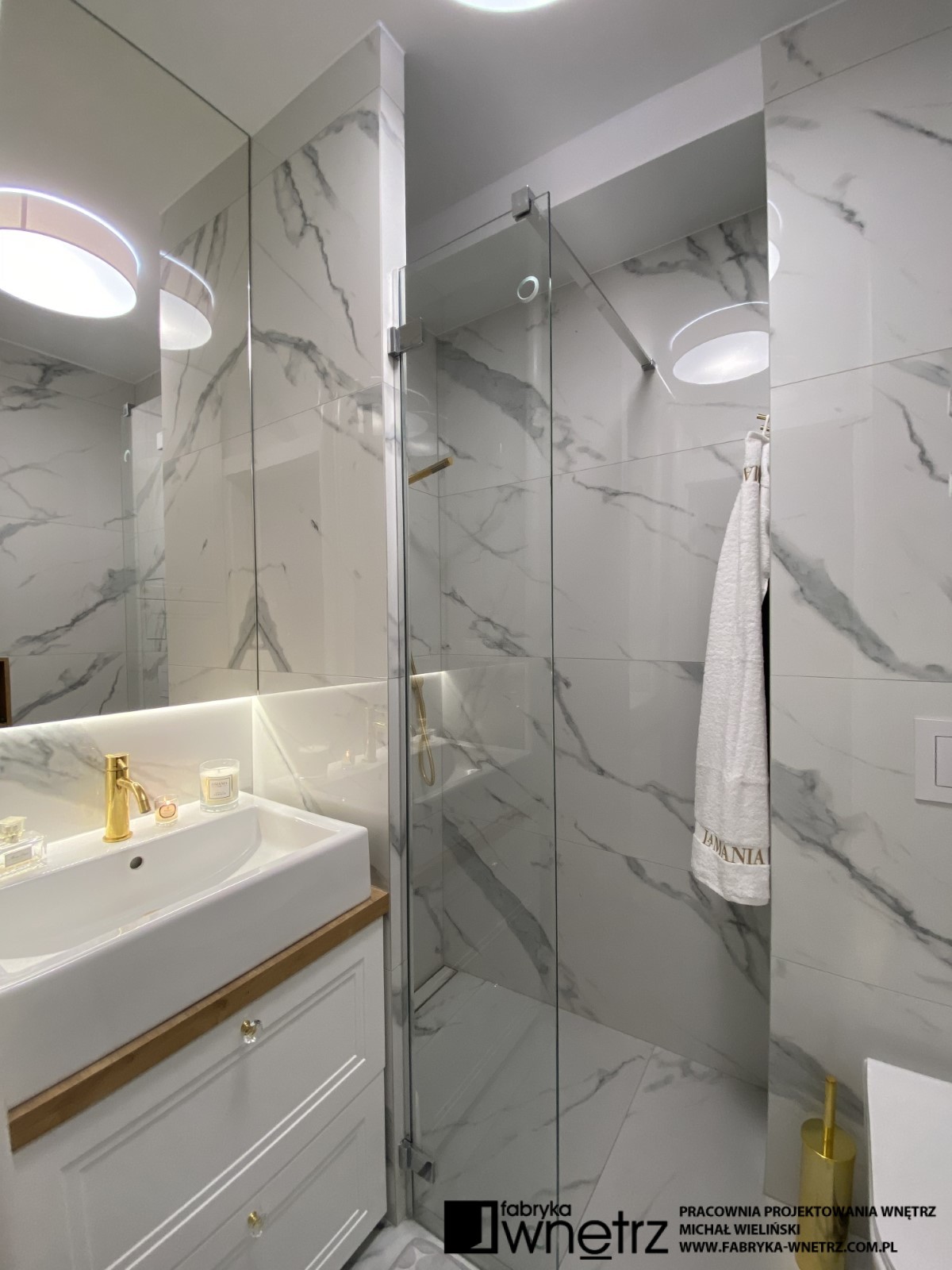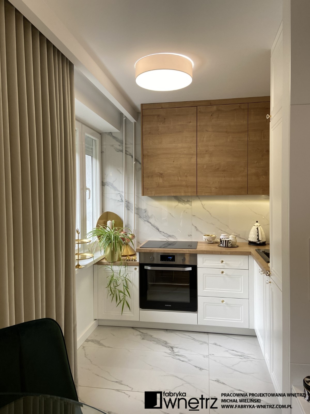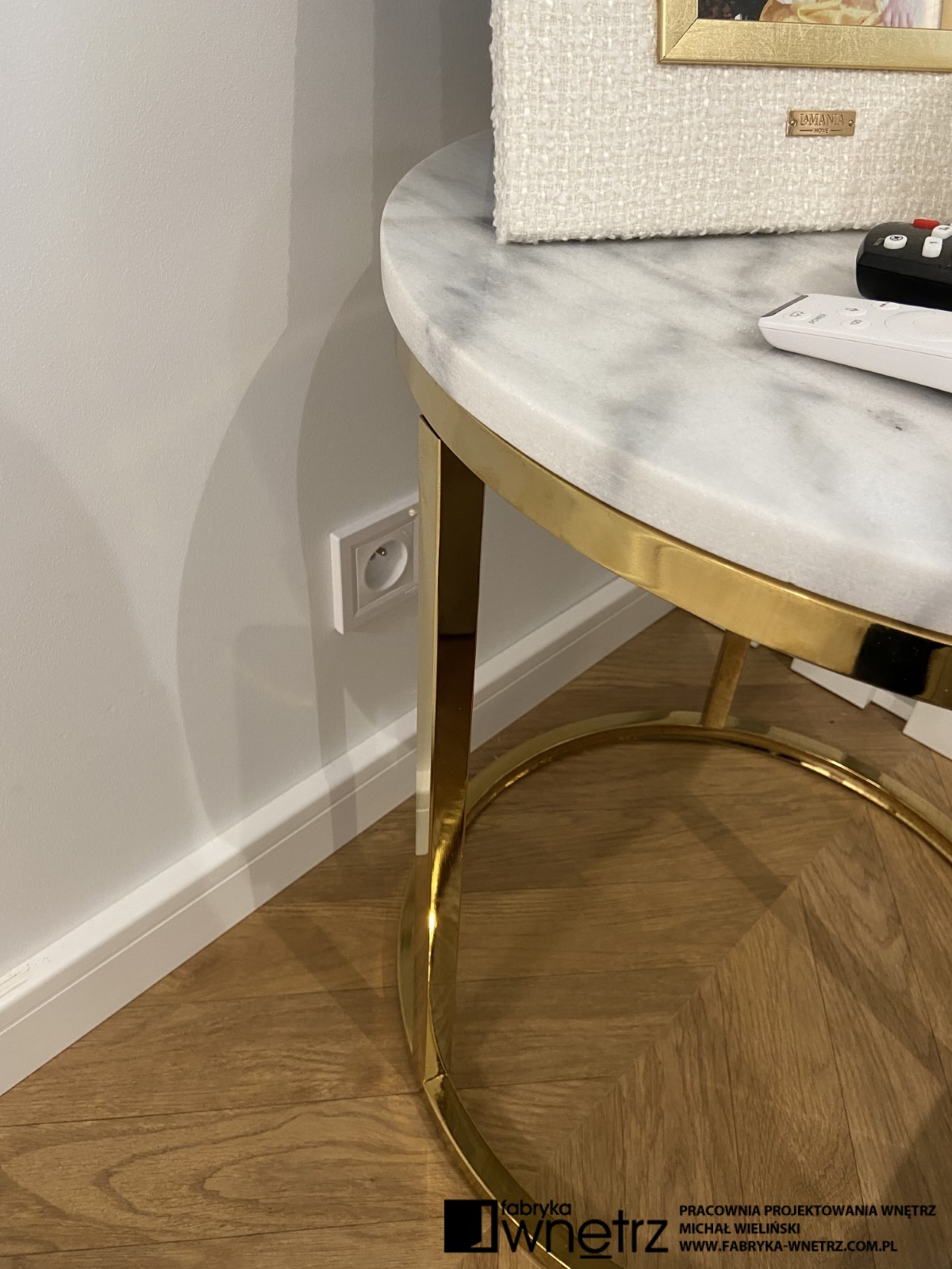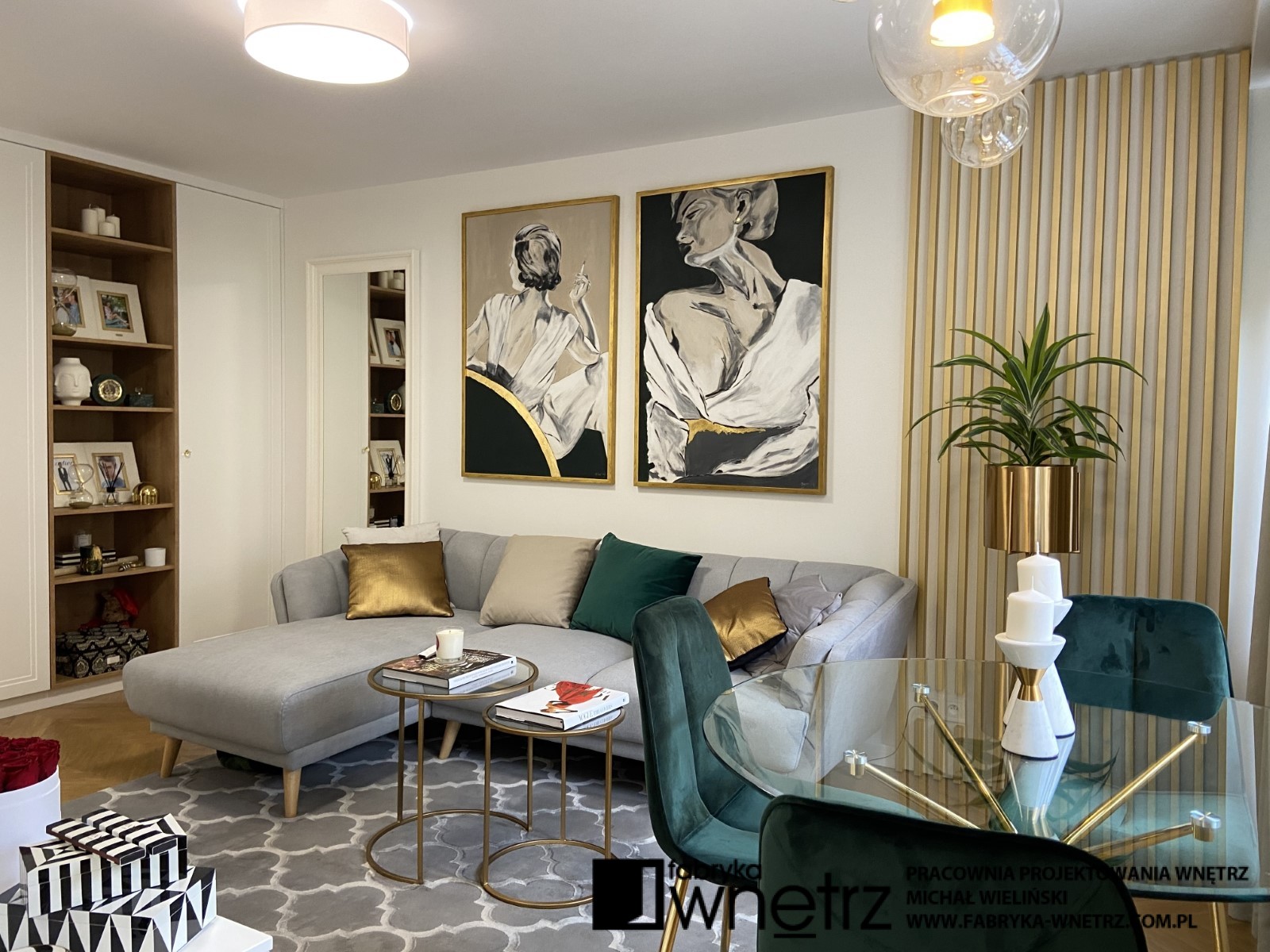 Mieszkanie na styku stylu nowoczesnego i modern classic w Koninie. Zaprojektowane i wykończone przez naszą pracownię, w 100% pod klucz. Inwestor mógł skupić się tylko i wyłącznie na finansowaniu całej inwestycji i obejrzeć dopiero efekt końcowy naszej pracy. Resztą zajęliśmy się my. Motywem przewodnim w tym wnętrzu jest kolor złoty, który pojawia się zarówno w stałych elementach zabudowy, lampach, klamkach, uchwytach, jak i w meblach, akcesoriach łazienkowych, oraz w sztuce, która obecna jest w tym mieszkaniu na każdym kroku. Niewielkie mieszkanie o powierzchni 38m2, zyskało na przestrzeni, poprzez wyburzenie fragmentów ścian, otwierając na salon kuchnię i przedpokój. Drewno, tkaniny, dywany, roślinność i dodatki, wprowadzają bardzo przytulny klimat. Tapicerowane fragmenty ścian nad łóżkiem i siedziskiem, w połączeniu z nastrojowym oświetleniem, pozwalają na wieczorny relaks po trudach całego dnia. W całym mieszkaniu udało nam się zmieścić bardzo dużą ilość szaf, aby wnętrze mogło cieszyć otwartą, uporządkowaną przestrzenią.