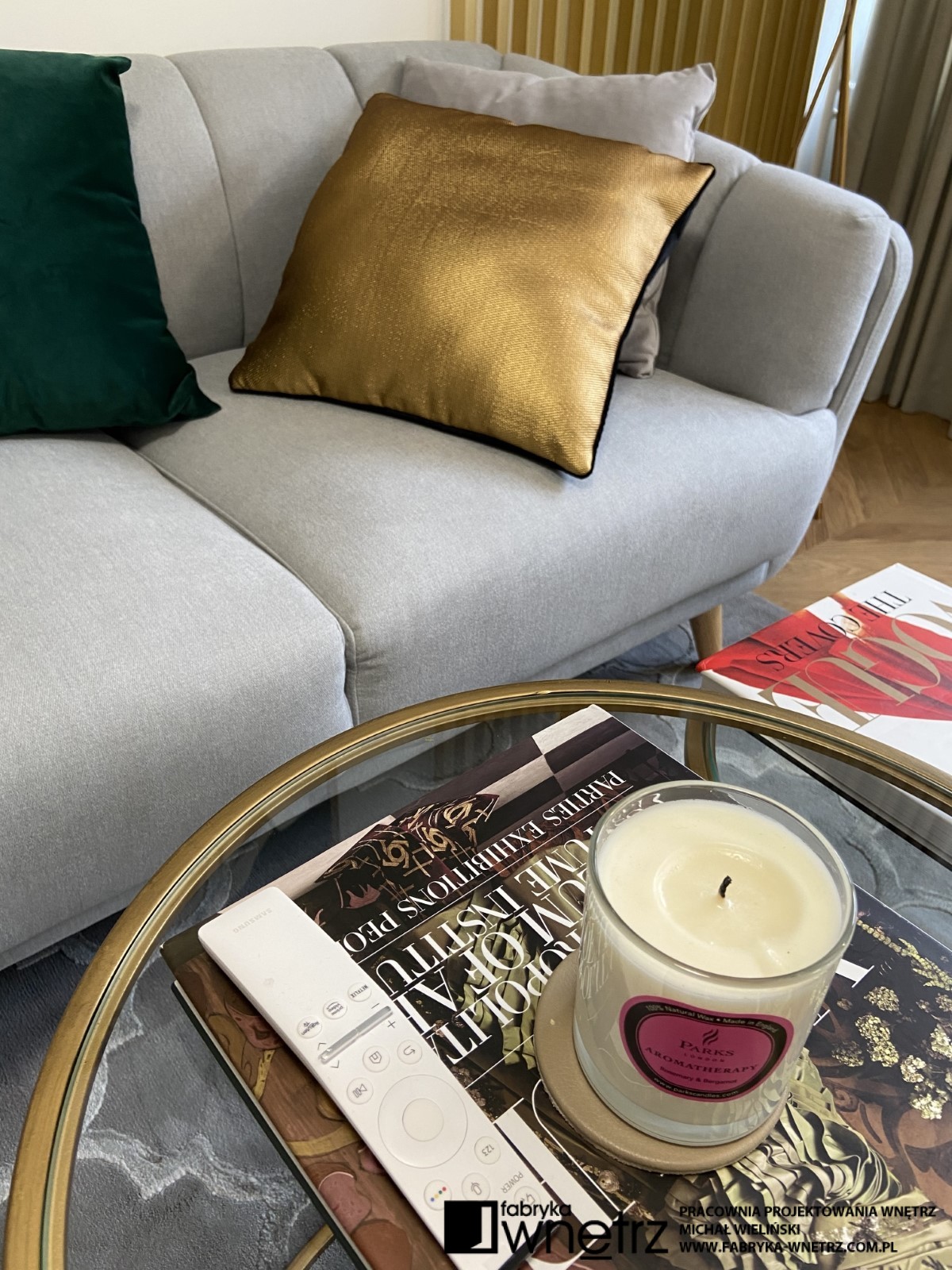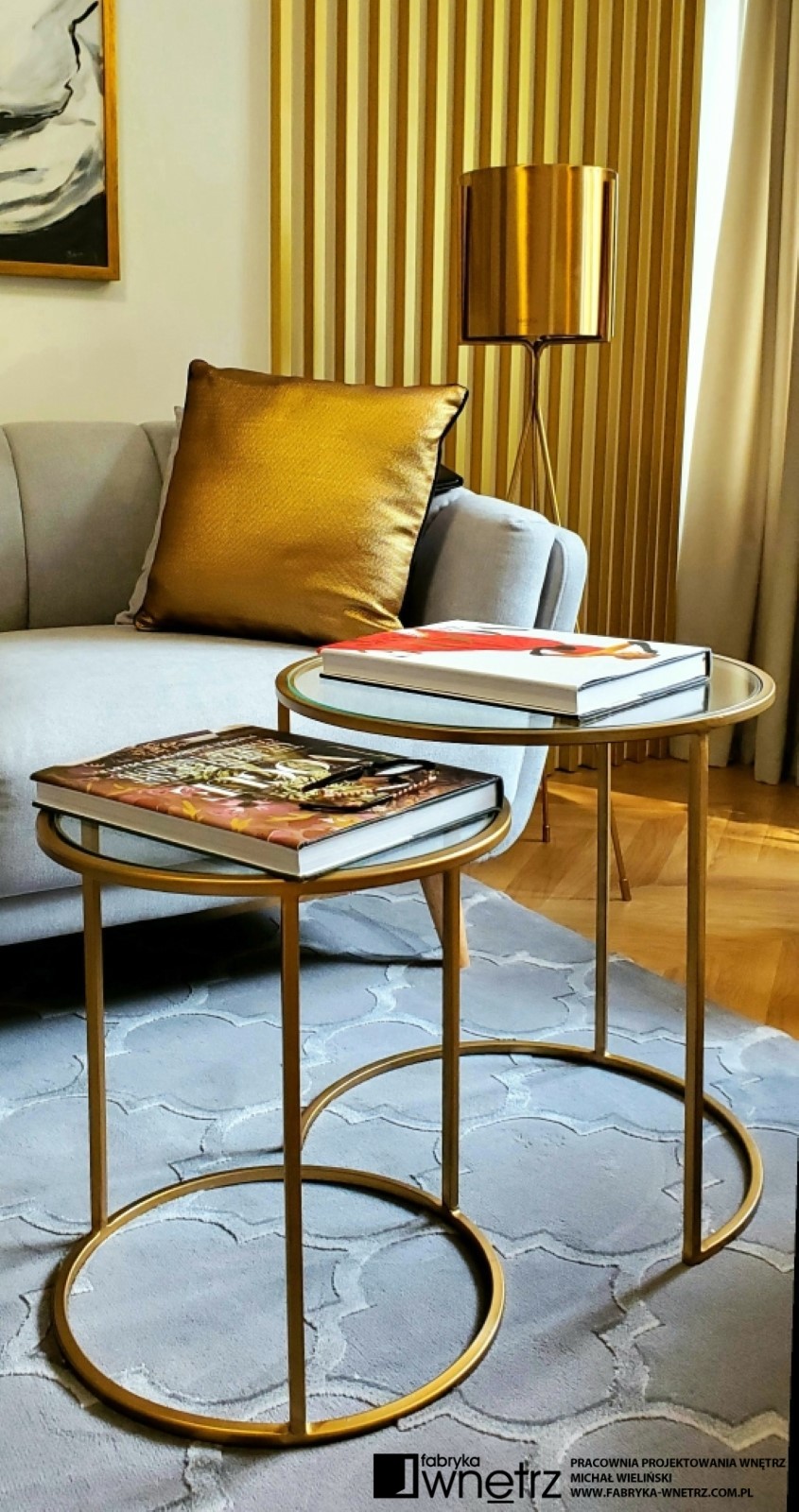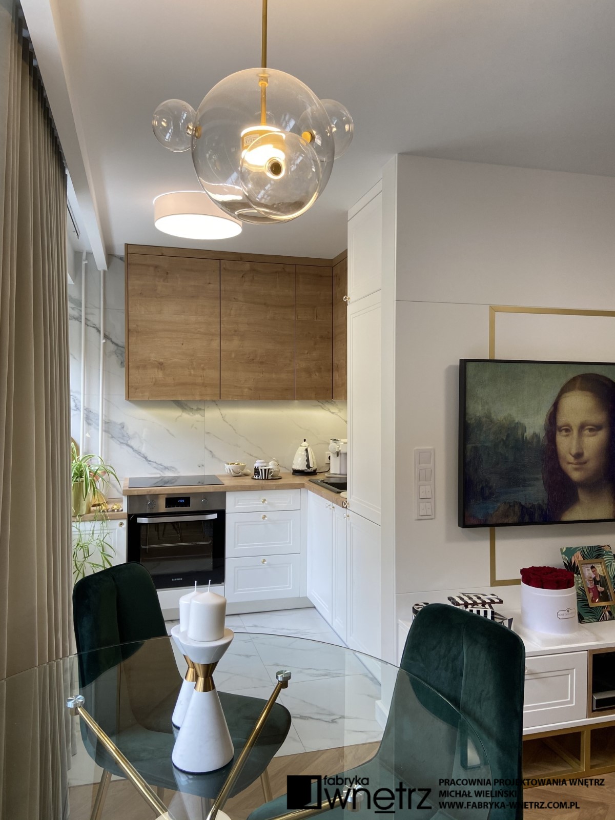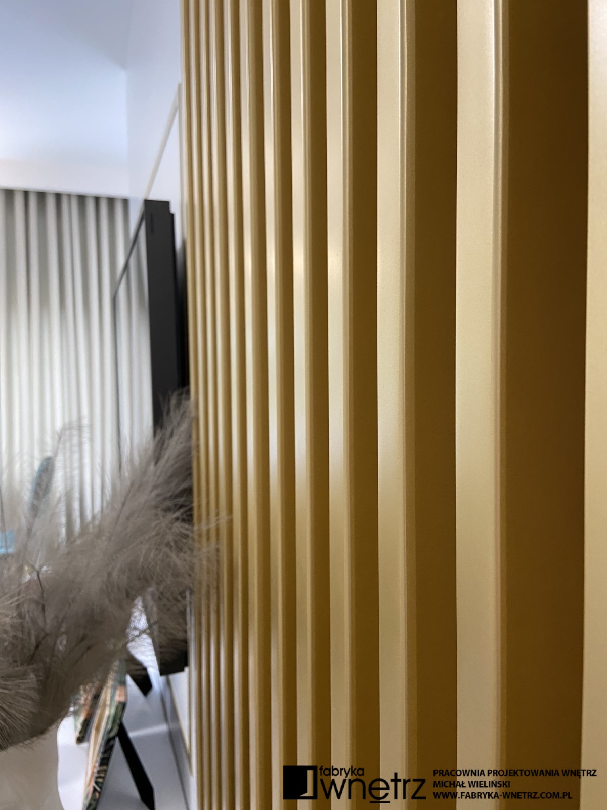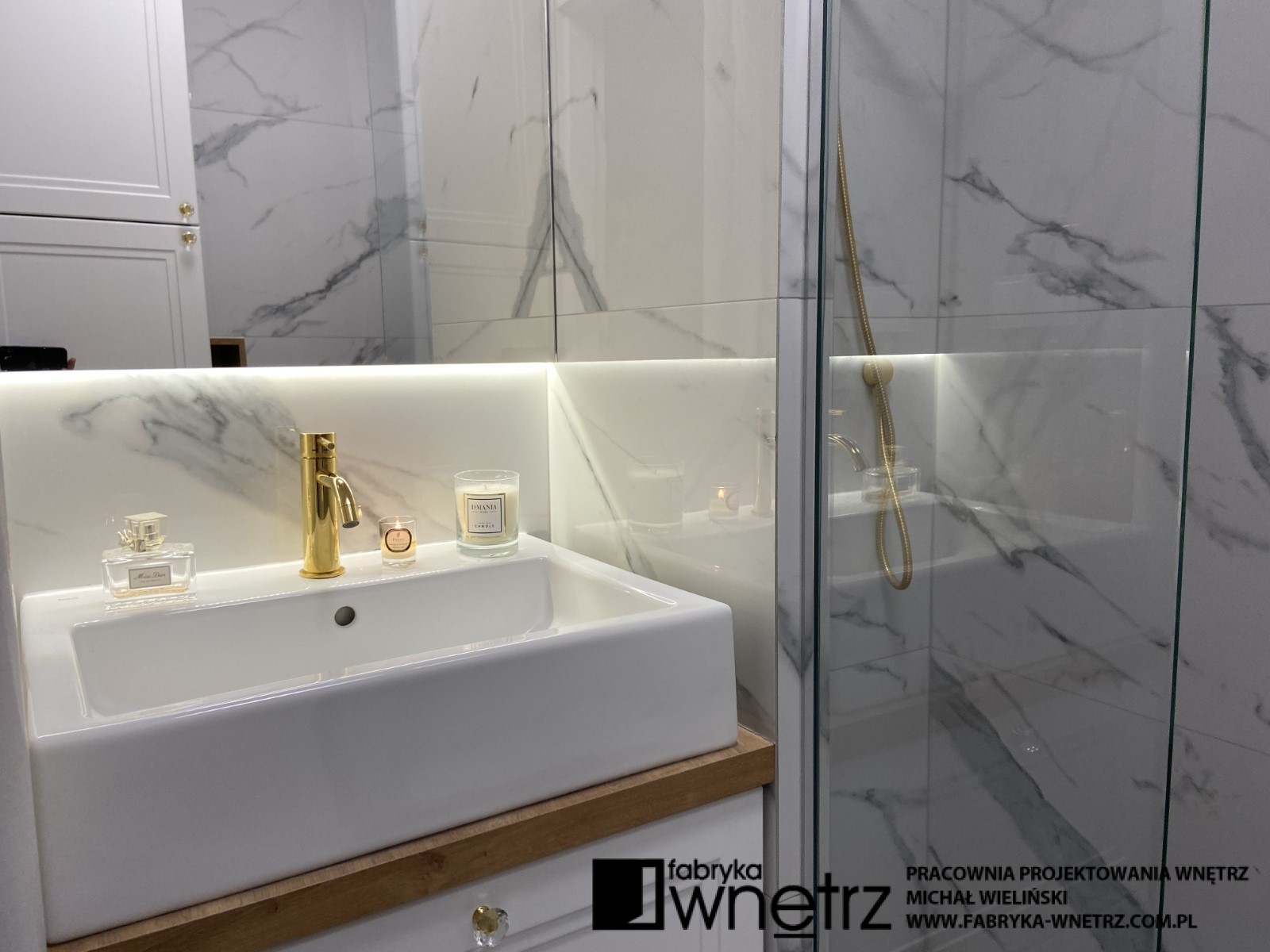Mieszkanie na styku stylu nowoczesnego i modern classic w Koninie. Zaprojektowane i wykończone przez naszą pracownię, w 100% pod klucz. Inwestor mógł skupić się tylko i wyłącznie na finansowaniu całej inwestycji i obejrzeć dopiero efekt końcowy naszej pracy. Resztą zajęliśmy się my. Motywem przewodnim w tym wnętrzu jest kolor złoty, który pojawia się zarówno w stałych elementach zabudowy, lampach, klamkach, uchwytach, jak i w meblach, akcesoriach łazienkowych, oraz w sztuce, która obecna jest w tym mieszkaniu na każdym kroku. Niewielkie mieszkanie o powierzchni 38m2, zyskało na przestrzeni, poprzez wyburzenie fragmentów ścian, otwierając na salon kuchnię i przedpokój. Drewno, tkaniny, dywany, roślinność i dodatki, wprowadzają bardzo przytulny klimat. Tapicerowane fragmenty ścian nad łóżkiem i siedziskiem, w połączeniu z nastrojowym oświetleniem, pozwalają na wieczorny relaks po trudach całego dnia. W całym mieszkaniu udało nam się zmieścić bardzo dużą ilość szaf, aby wnętrze mogło cieszyć otwartą, uporządkowaną przestrzenią.