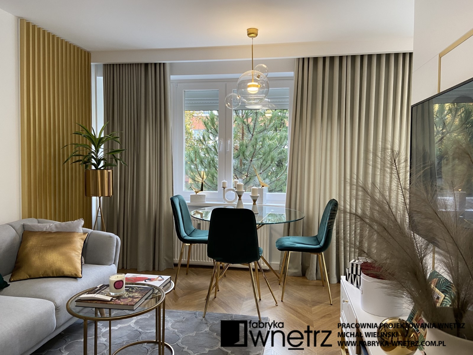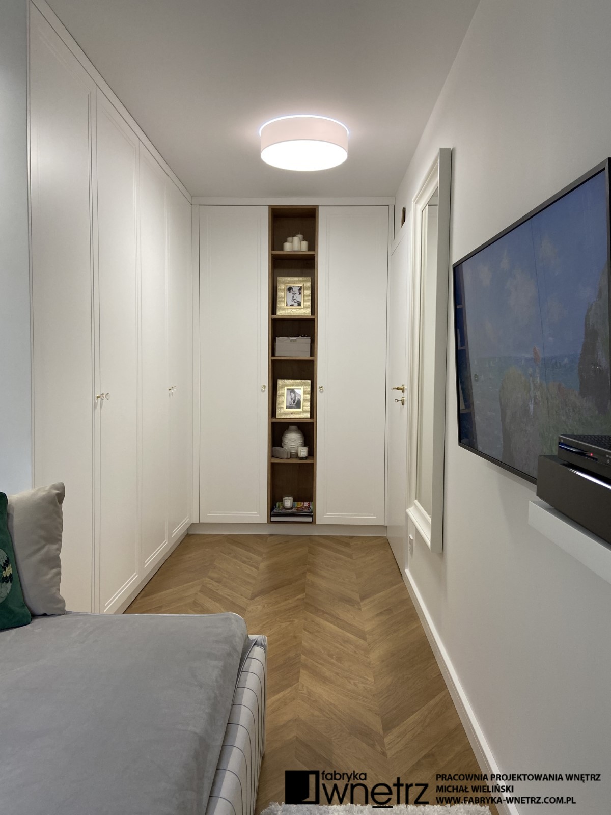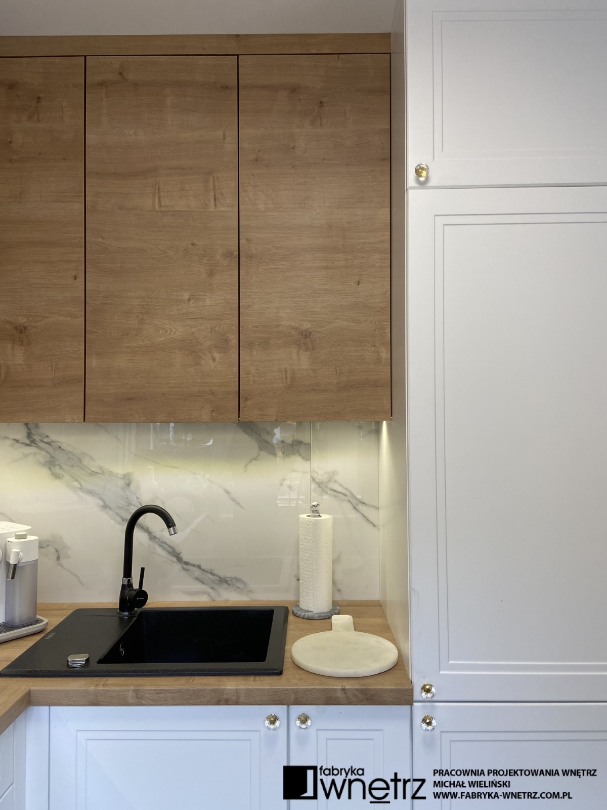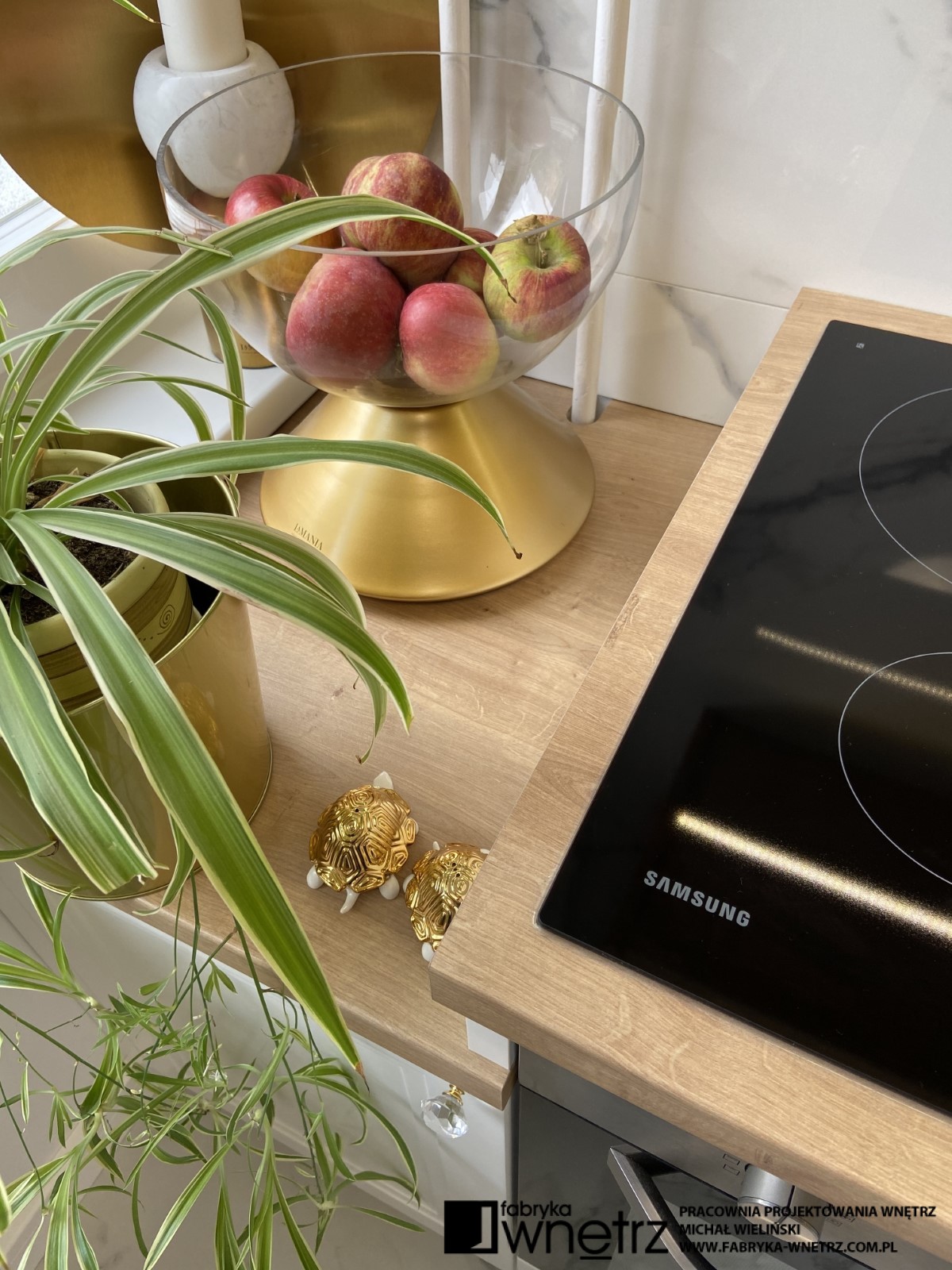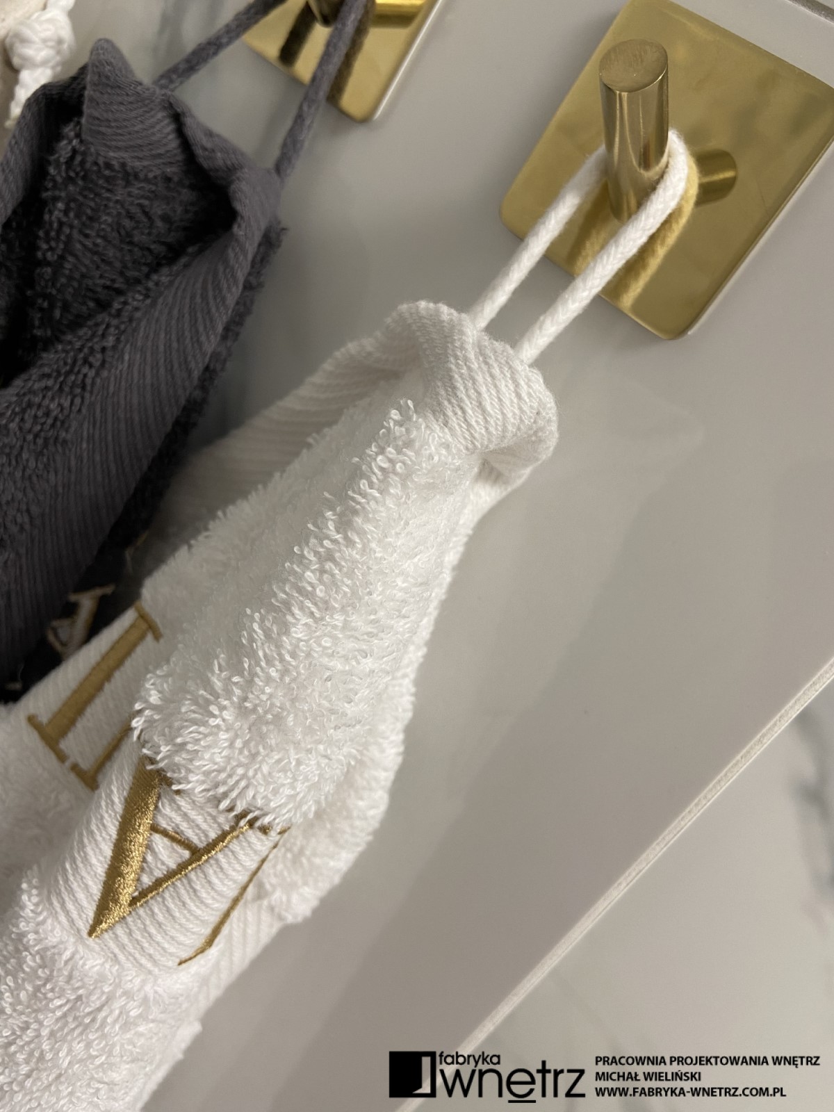 Mieszkanie na styku stylu nowoczesnego i modern classic w Koninie. Zaprojektowane i wykończone przez naszą pracownię, w 100% pod klucz. Inwestor mógł skupić się tylko i wyłącznie na finansowaniu całej inwestycji i obejrzeć dopiero efekt końcowy naszej pracy. Resztą zajęliśmy się my. Motywem przewodnim w tym wnętrzu jest kolor złoty, który pojawia się zarówno w stałych elementach zabudowy, lampach, klamkach, uchwytach, jak i w meblach, akcesoriach łazienkowych, oraz w sztuce, która obecna jest w tym mieszkaniu na każdym kroku. Niewielkie mieszkanie o powierzchni 38m2, zyskało na przestrzeni, poprzez wyburzenie fragmentów ścian, otwierając na salon kuchnię i przedpokój. Drewno, tkaniny, dywany, roślinność i dodatki, wprowadzają bardzo przytulny klimat. Tapicerowane fragmenty ścian nad łóżkiem i siedziskiem, w połączeniu z nastrojowym oświetleniem, pozwalają na wieczorny relaks po trudach całego dnia. W całym mieszkaniu udało nam się zmieścić bardzo dużą ilość szaf, aby wnętrze mogło cieszyć otwartą, uporządkowaną przestrzenią.