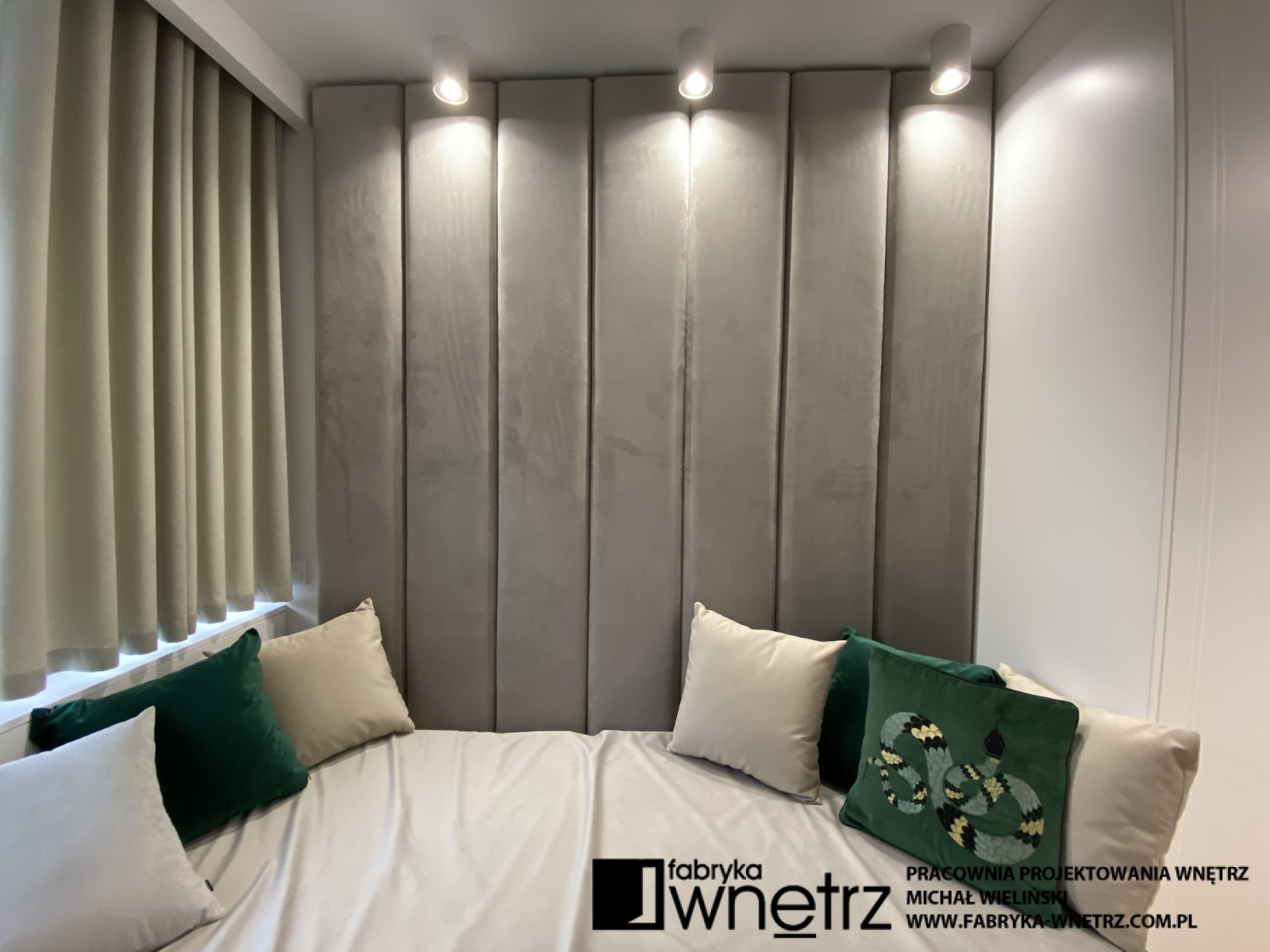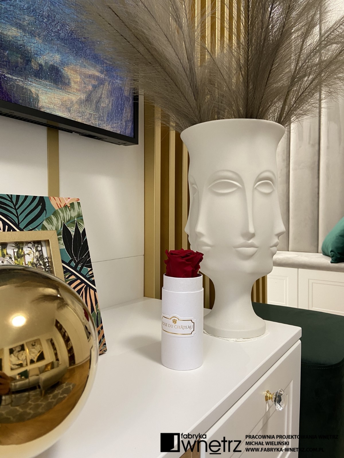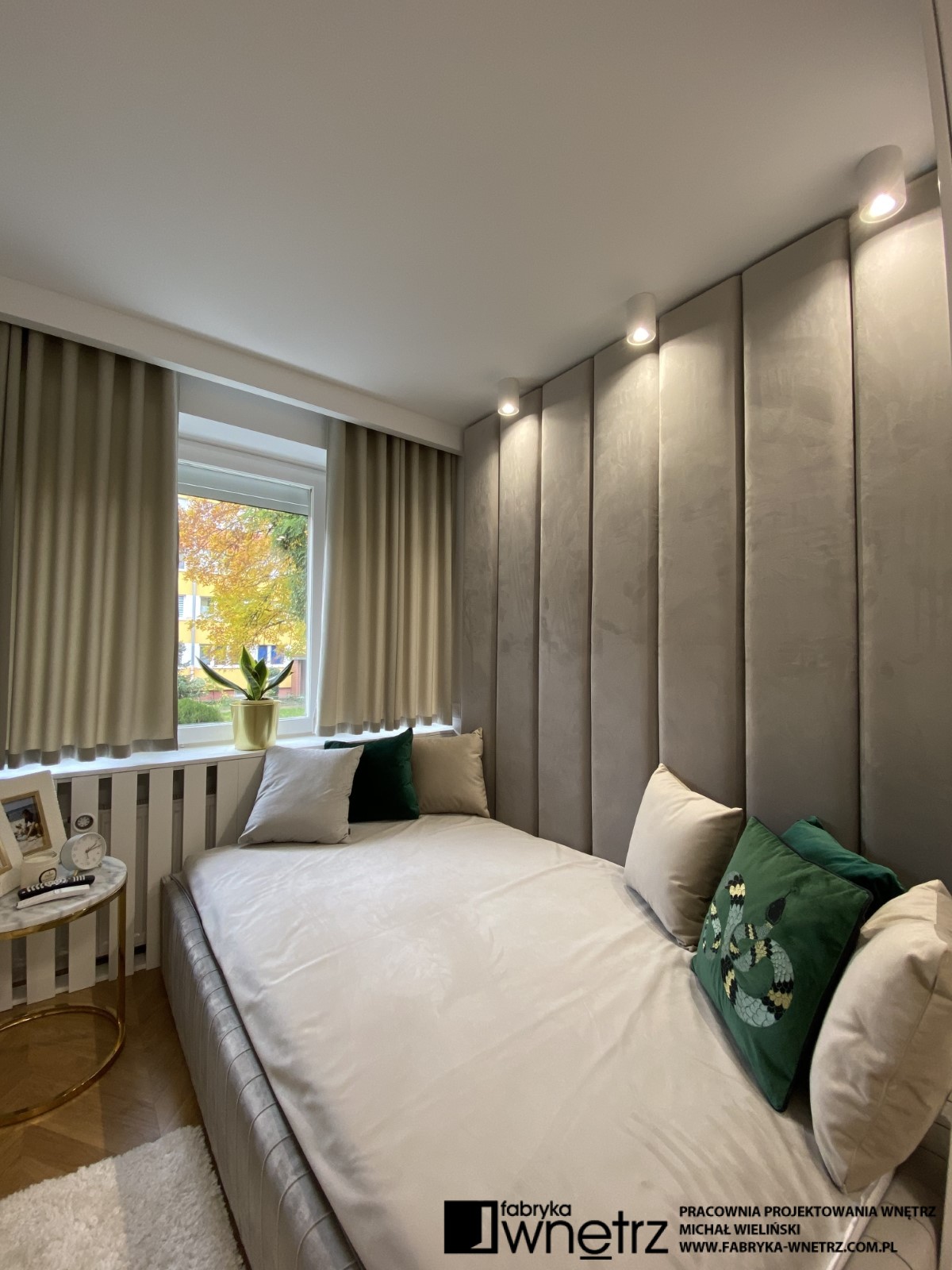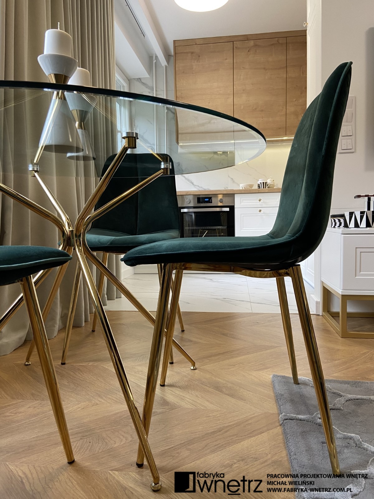 Mieszkanie na styku stylu nowoczesnego i modern classic w Koninie. Zaprojektowane i wykończone przez naszą pracownię, w 100% pod klucz. Inwestor mógł skupić się tylko i wyłącznie na finansowaniu całej inwestycji i obejrzeć dopiero efekt końcowy naszej pracy. Resztą zajęliśmy się my. Motywem przewodnim w tym wnętrzu jest kolor złoty, który pojawia się zarówno w stałych elementach zabudowy, lampach, klamkach, uchwytach, jak i w meblach, akcesoriach łazienkowych, oraz w sztuce, która obecna jest w tym mieszkaniu na każdym kroku. Niewielkie mieszkanie o powierzchni 38m2, zyskało na przestrzeni, poprzez wyburzenie fragmentów ścian, otwierając na salon kuchnię i przedpokój. Drewno, tkaniny, dywany, roślinność i dodatki, wprowadzają bardzo przytulny klimat. Tapicerowane fragmenty ścian nad łóżkiem i siedziskiem, w połączeniu z nastrojowym oświetleniem, pozwalają na wieczorny relaks po trudach całego dnia. W całym mieszkaniu udało nam się zmieścić bardzo dużą ilość szaf, aby wnętrze mogło cieszyć otwartą, uporządkowaną przestrzenią.