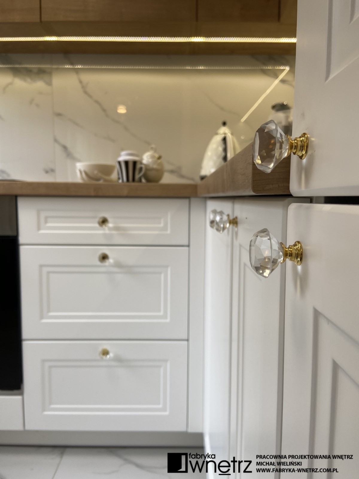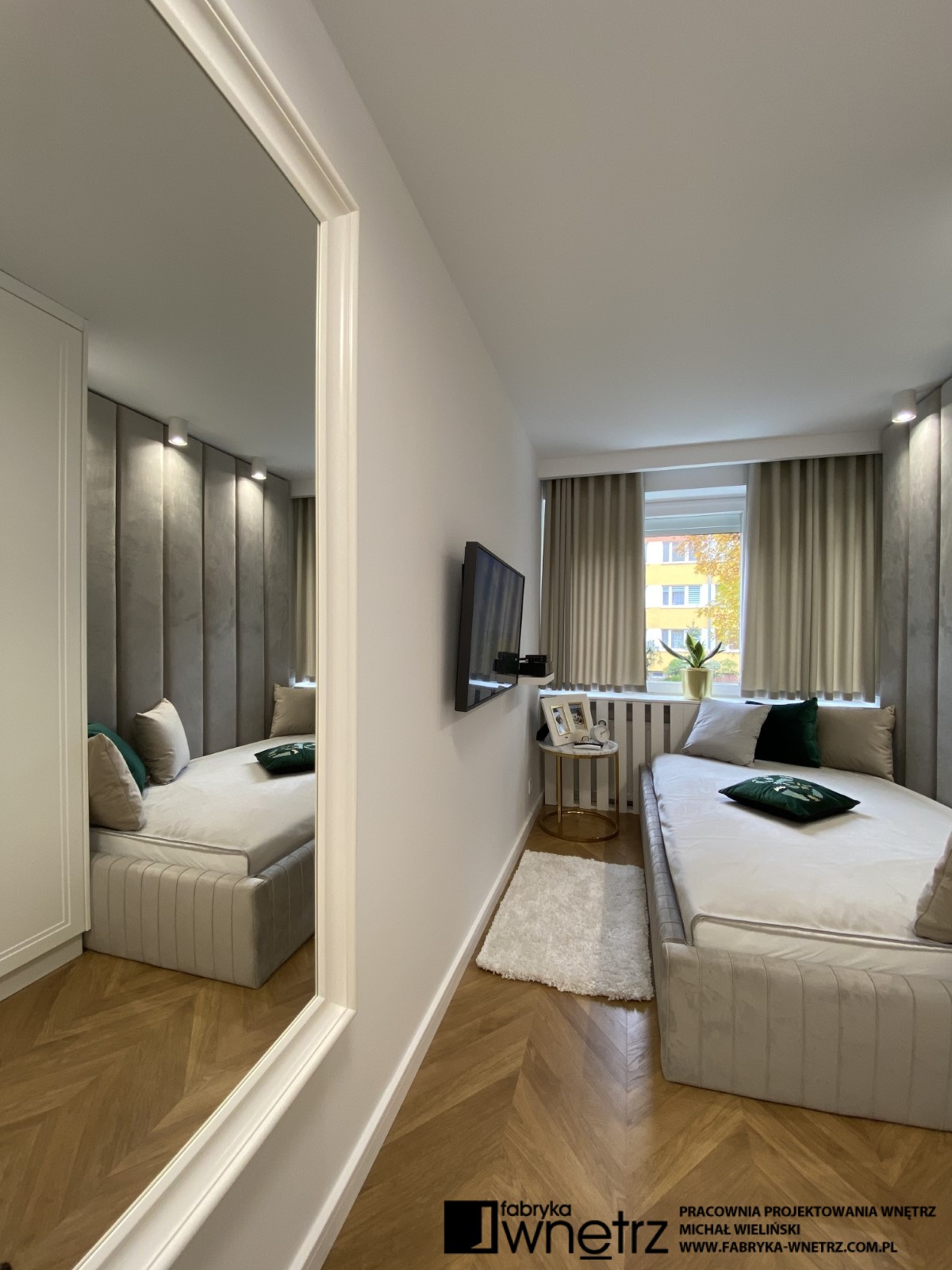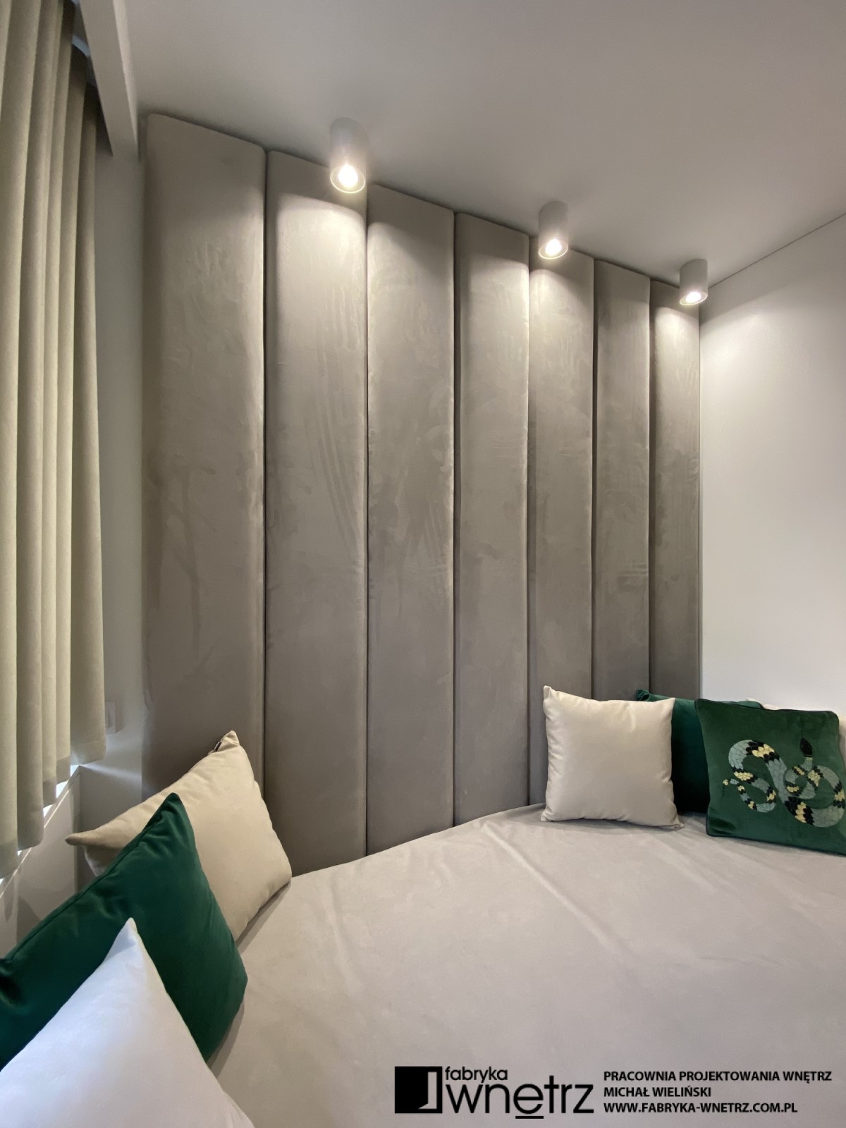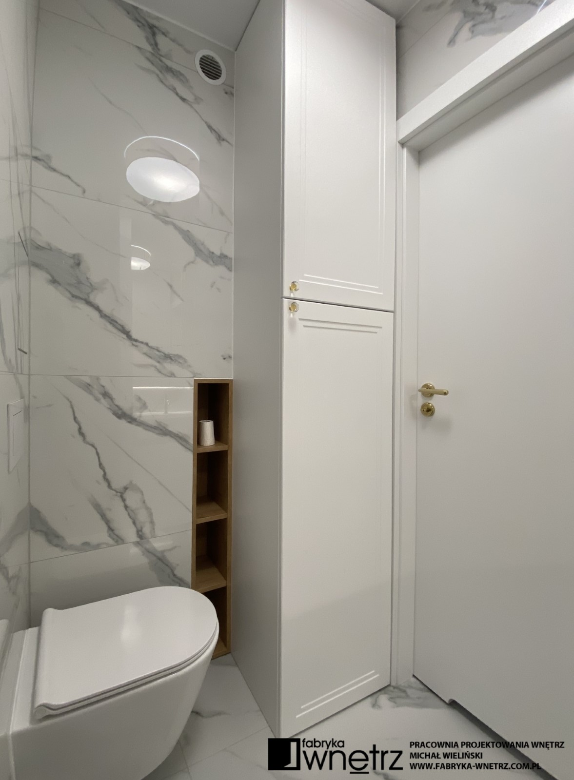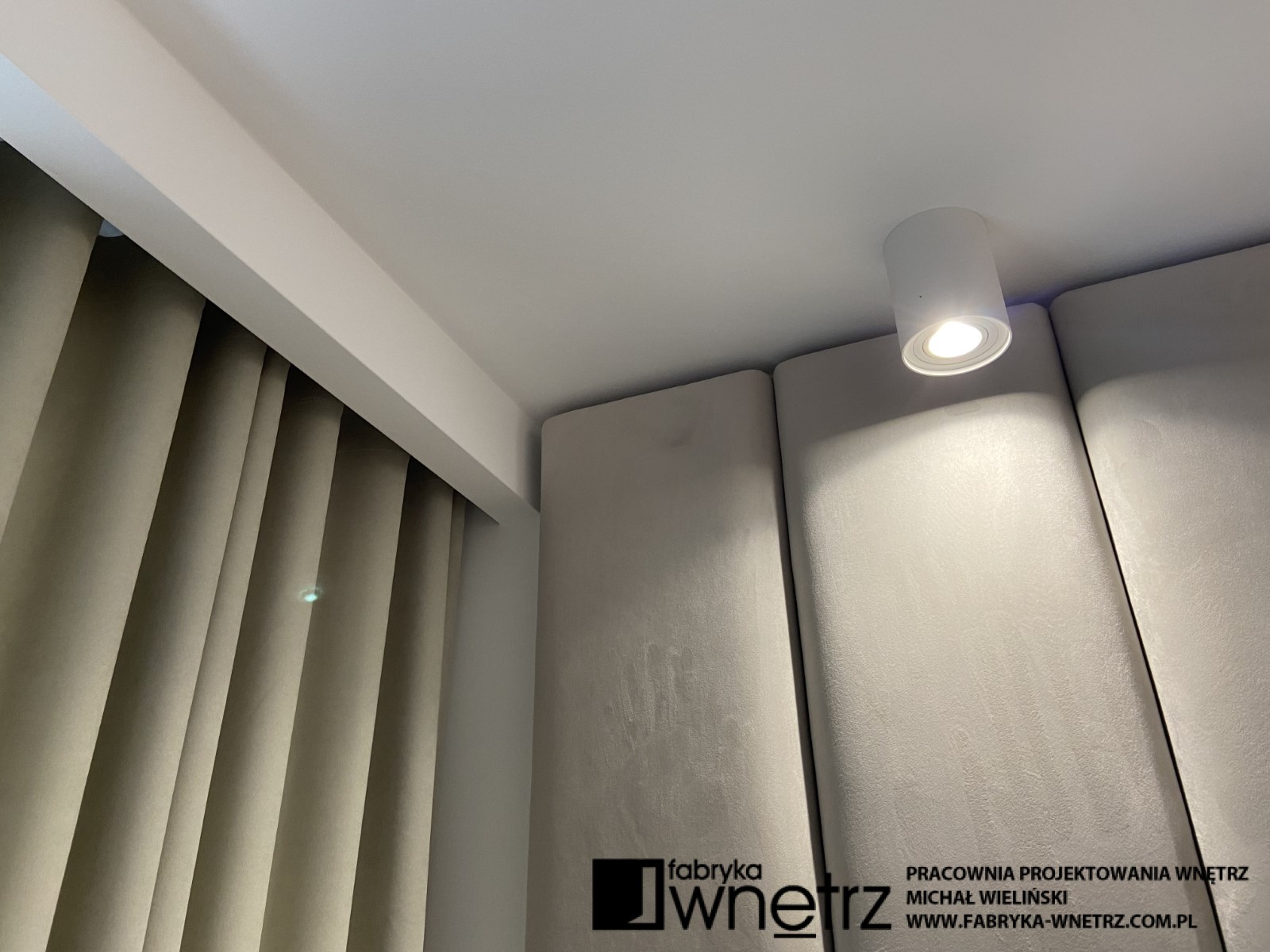 Mieszkanie na styku stylu nowoczesnego i modern classic w Koninie. Zaprojektowane i wykończone przez naszą pracownię, w 100% pod klucz. Inwestor mógł skupić się tylko i wyłącznie na finansowaniu całej inwestycji i obejrzeć dopiero efekt końcowy naszej pracy. Resztą zajęliśmy się my. Motywem przewodnim w tym wnętrzu jest kolor złoty, który pojawia się zarówno w stałych elementach zabudowy, lampach, klamkach, uchwytach, jak i w meblach, akcesoriach łazienkowych, oraz w sztuce, która obecna jest w tym mieszkaniu na każdym kroku. Niewielkie mieszkanie o powierzchni 38m2, zyskało na przestrzeni, poprzez wyburzenie fragmentów ścian, otwierając na salon kuchnię i przedpokój. Drewno, tkaniny, dywany, roślinność i dodatki, wprowadzają bardzo przytulny klimat. Tapicerowane fragmenty ścian nad łóżkiem i siedziskiem, w połączeniu z nastrojowym oświetleniem, pozwalają na wieczorny relaks po trudach całego dnia. W całym mieszkaniu udało nam się zmieścić bardzo dużą ilość szaf, aby wnętrze mogło cieszyć otwartą, uporządkowaną przestrzenią.