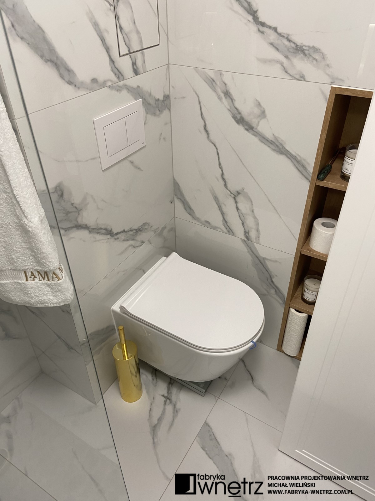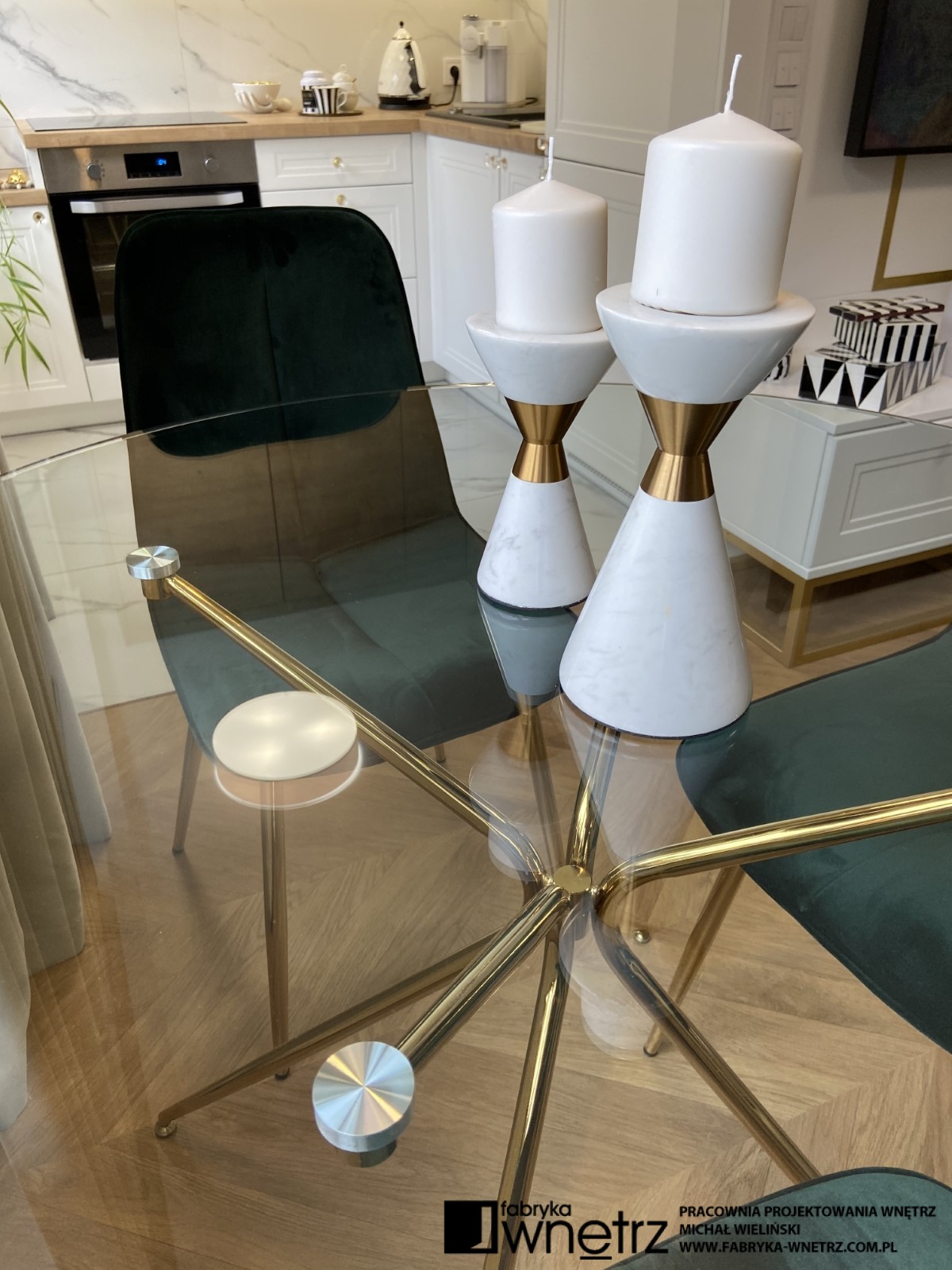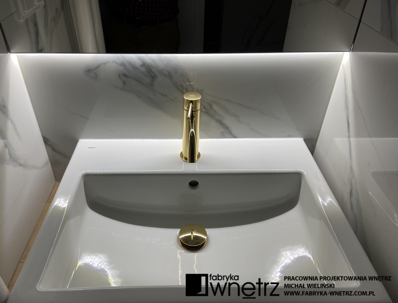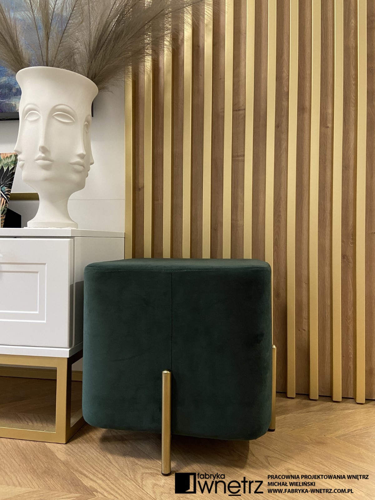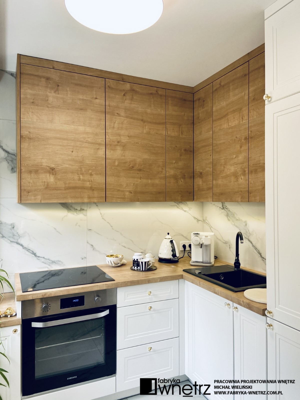 Mieszkanie na styku stylu nowoczesnego i modern classic w Koninie. Zaprojektowane i wykończone przez naszą pracownię, w 100% pod klucz. Inwestor mógł skupić się tylko i wyłącznie na finansowaniu całej inwestycji i obejrzeć dopiero efekt końcowy naszej pracy. Resztą zajęliśmy się my. Motywem przewodnim w tym wnętrzu jest kolor złoty, który pojawia się zarówno w stałych elementach zabudowy, lampach, klamkach, uchwytach, jak i w meblach, akcesoriach łazienkowych, oraz w sztuce, która obecna jest w tym mieszkaniu na każdym kroku. Niewielkie mieszkanie o powierzchni 38m2, zyskało na przestrzeni, poprzez wyburzenie fragmentów ścian, otwierając na salon kuchnię i przedpokój. Drewno, tkaniny, dywany, roślinność i dodatki, wprowadzają bardzo przytulny klimat. Tapicerowane fragmenty ścian nad łóżkiem i siedziskiem, w połączeniu z nastrojowym oświetleniem, pozwalają na wieczorny relaks po trudach całego dnia. W całym mieszkaniu udało nam się zmieścić bardzo dużą ilość szaf, aby wnętrze mogło cieszyć otwartą, uporządkowaną przestrzenią.