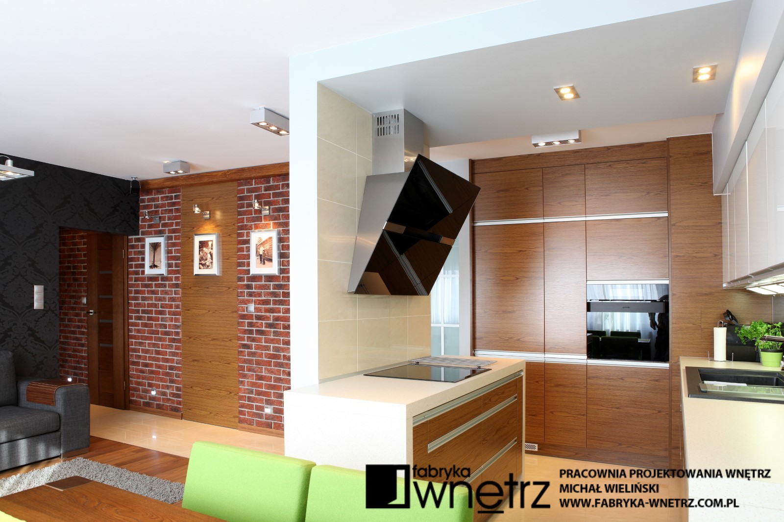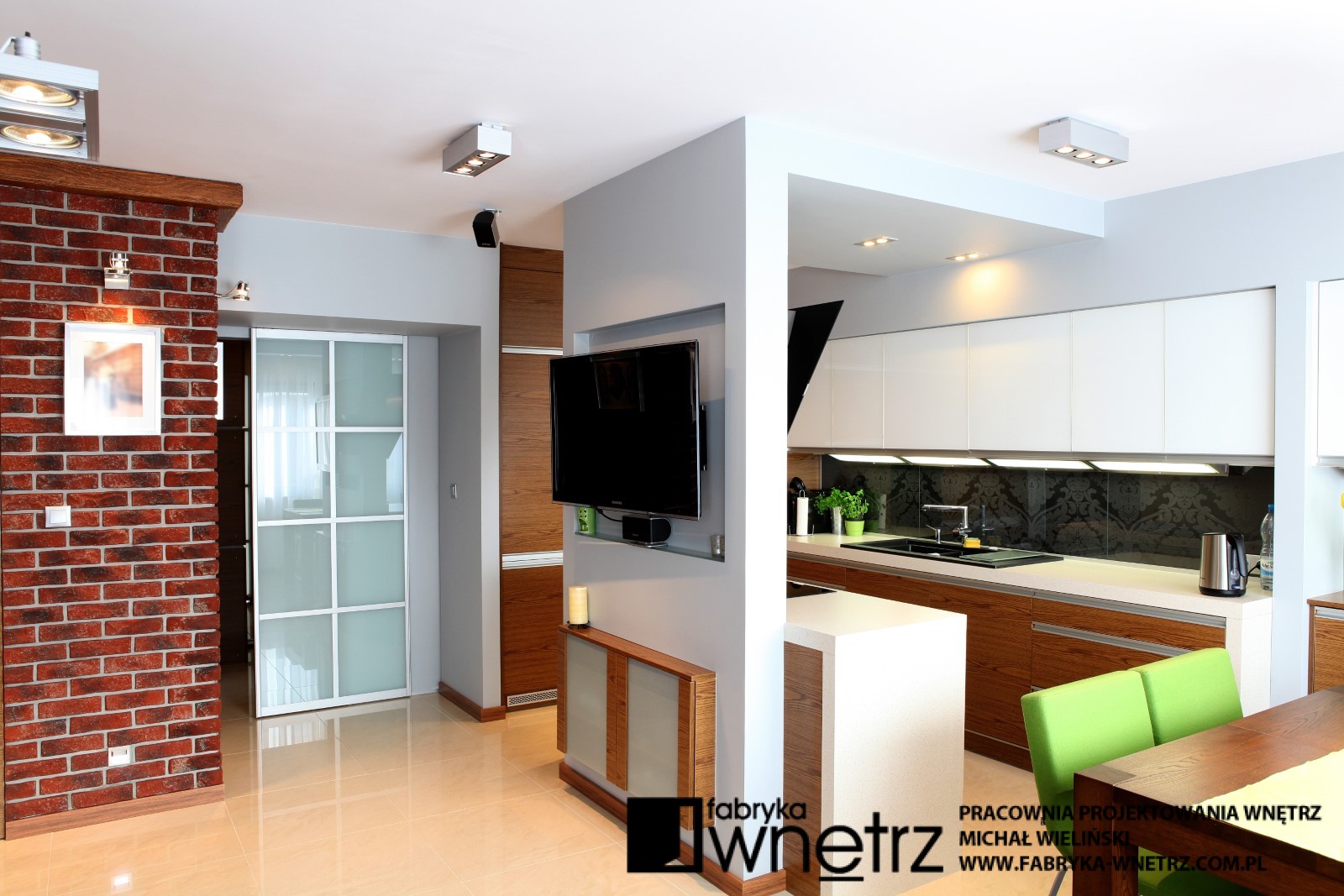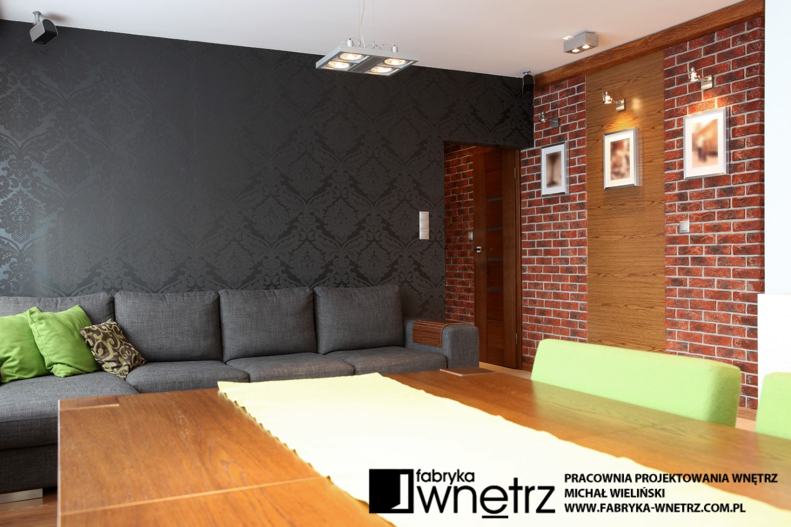 Projekt wnętrz mieszkania w Koninie. Odważne połączenie lśniących gładkich powierzchni białego mdf-u lakierowanego z wzorzystą czarną tapetą i cegłą na ścianie.