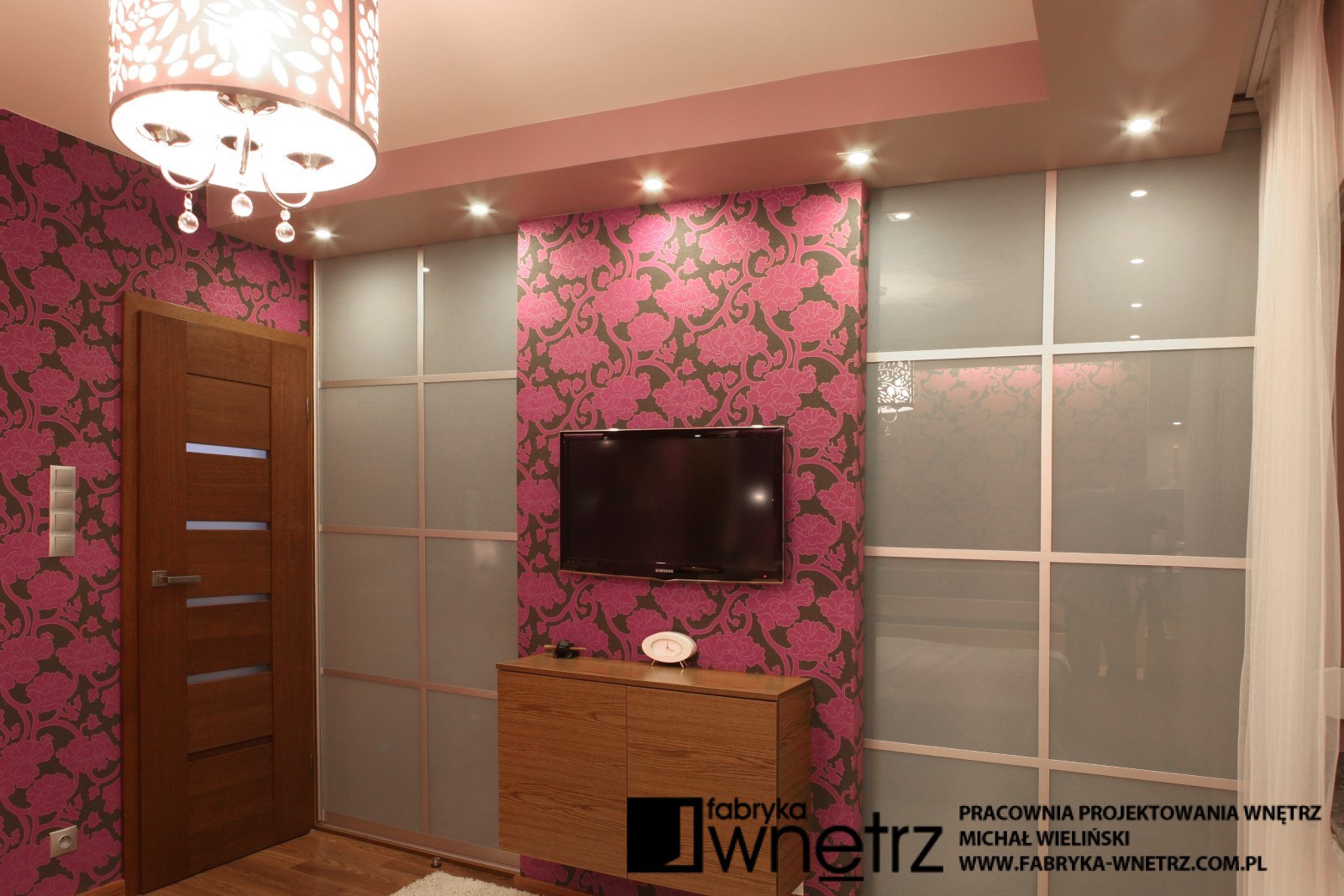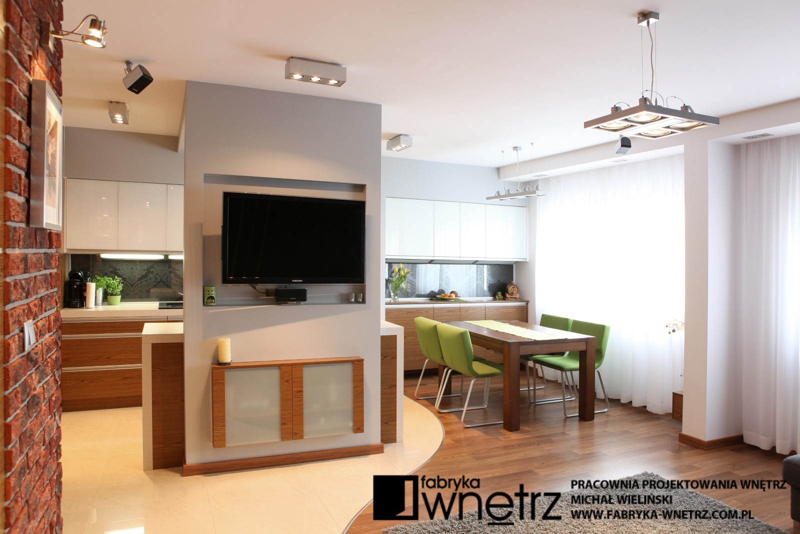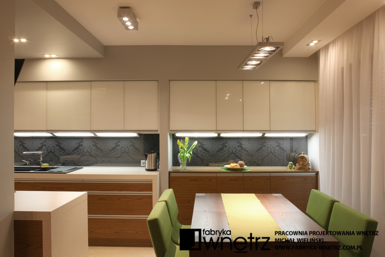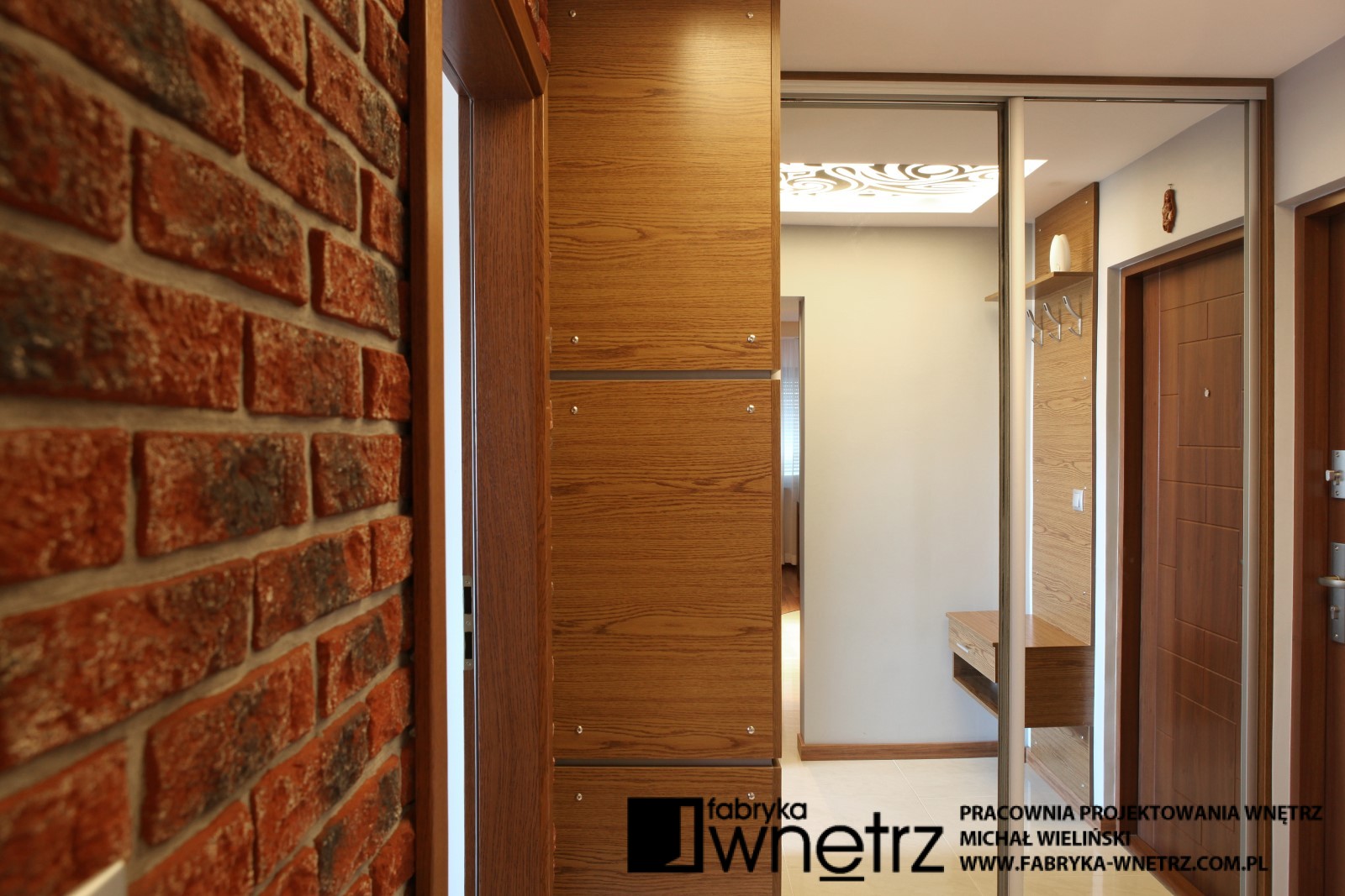 Projekt wnętrz mieszkania w Koninie. Odważne połączenie lśniących gładkich powierzchni białego mdf-u lakierowanego z wzorzystą czarną tapetą i cegłą na ścianie.