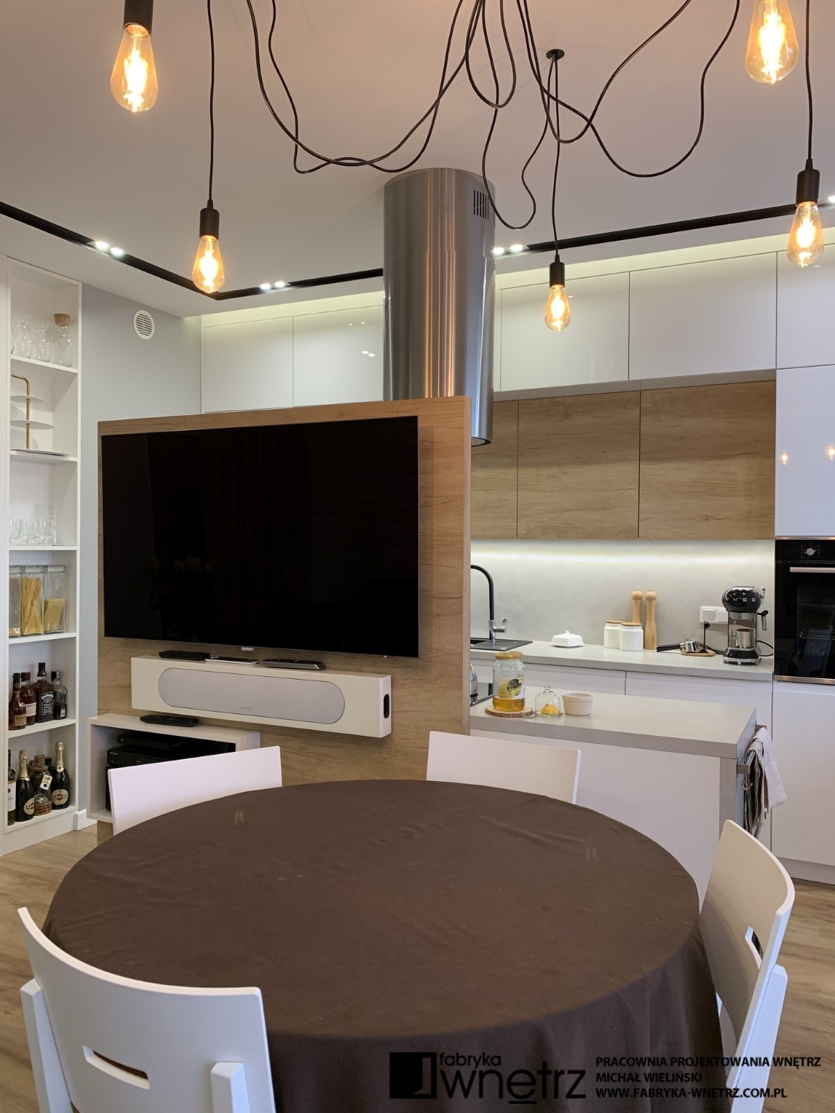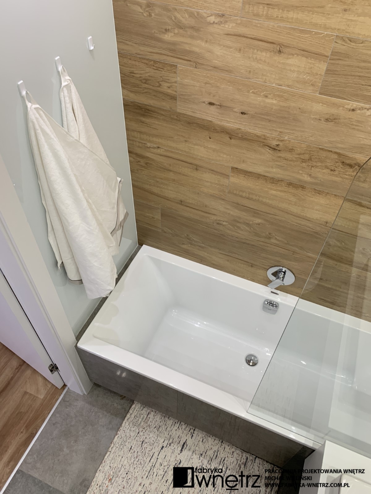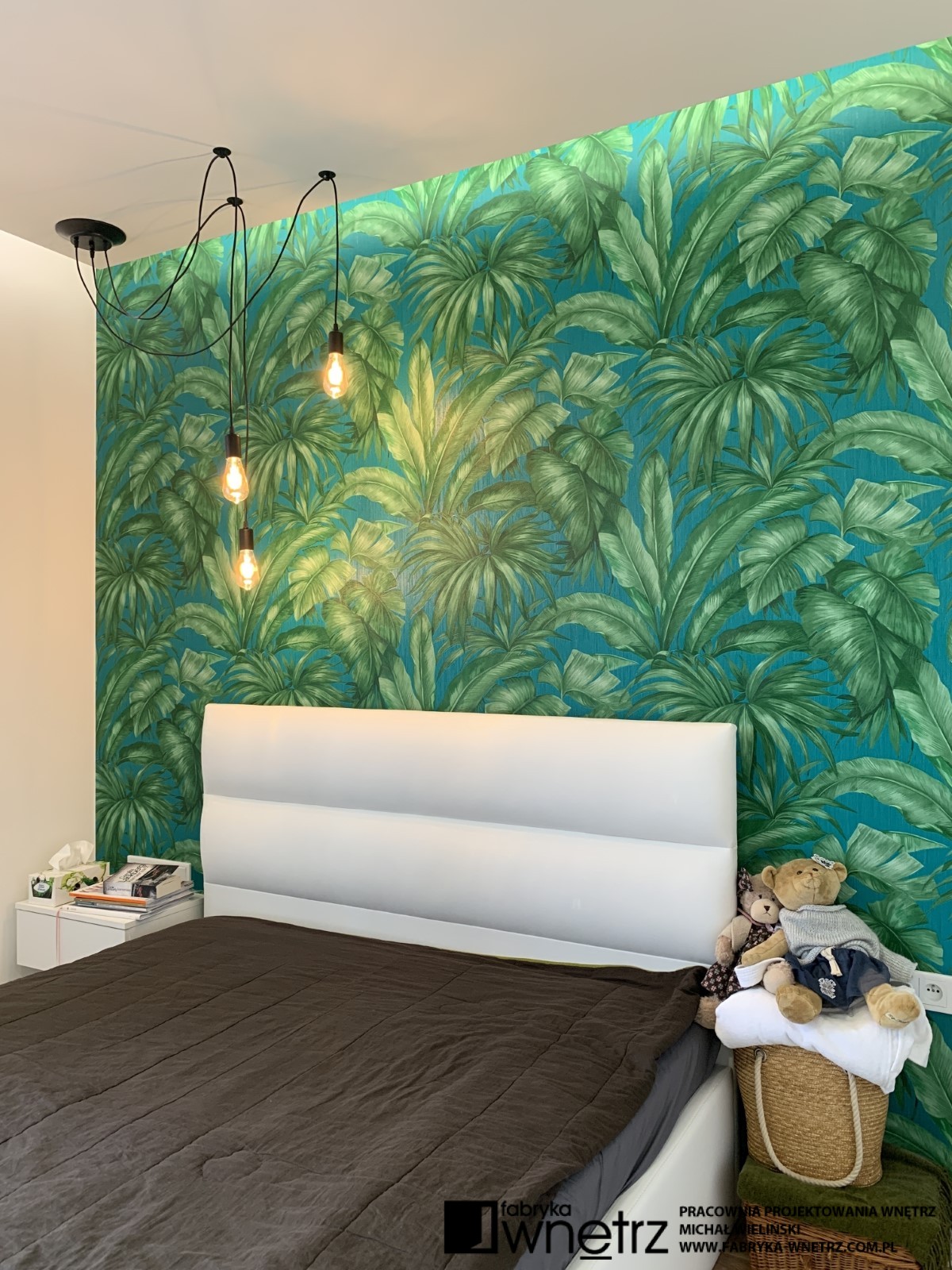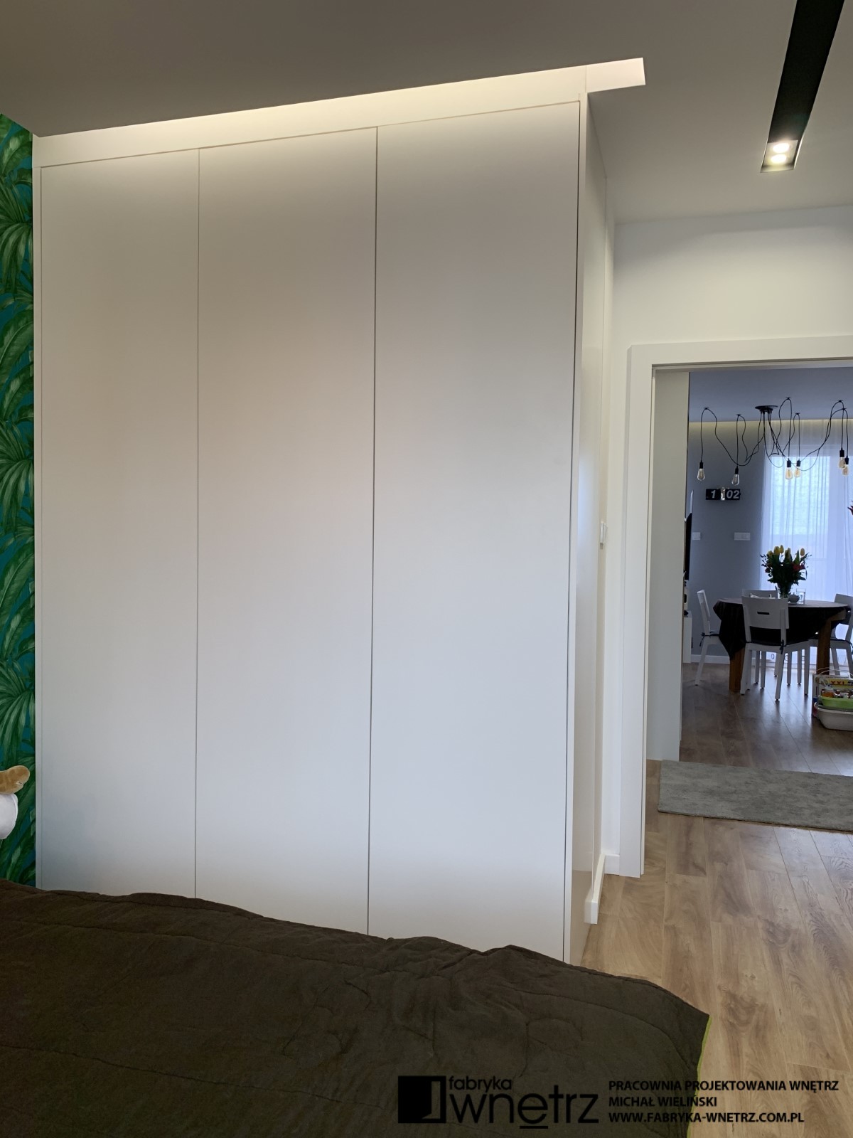 Wnętrza mieszkania w Pile. Stonowana, jasna kolorystyka z dodatkiem ciepłego drewna, to motyw przewodni w tym nowoczesnym mieszkaniu. W stosunkowo małej otwartej przestrzeni, musieliśmy znaleźć miejsce na aneks kuchenny, spory wypoczynek, stół, telewizor, szafę i witrynę. Całość oddzieliliśmy od wejścia ażurową, cienką ścianką z szafką na buty. W sypialni zmieściliśmy łóżko z dużą szafą na tle bujnej roślinności z dzikiej dżungli. Z niej do pokoju dziecięcego zawędrowała zagubiona małpka, wisząca na drewnianej ramie łóżka. Kolory i faktury z części dziennej tego mieszkania, zagościły również w małej, ale bardzo funkcjonalnej łazience.
