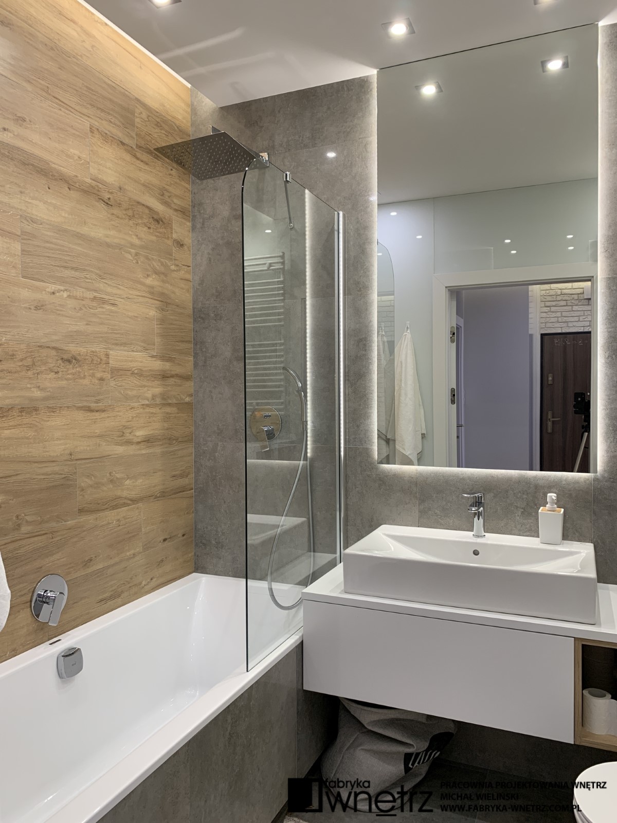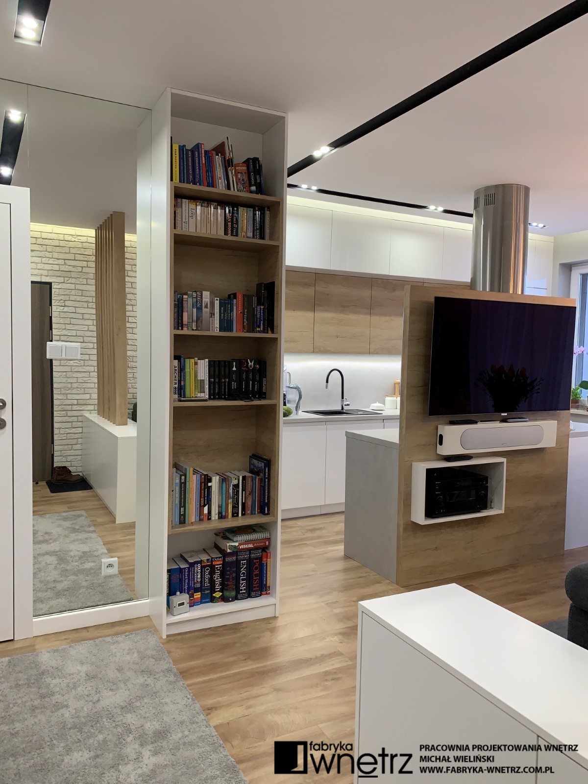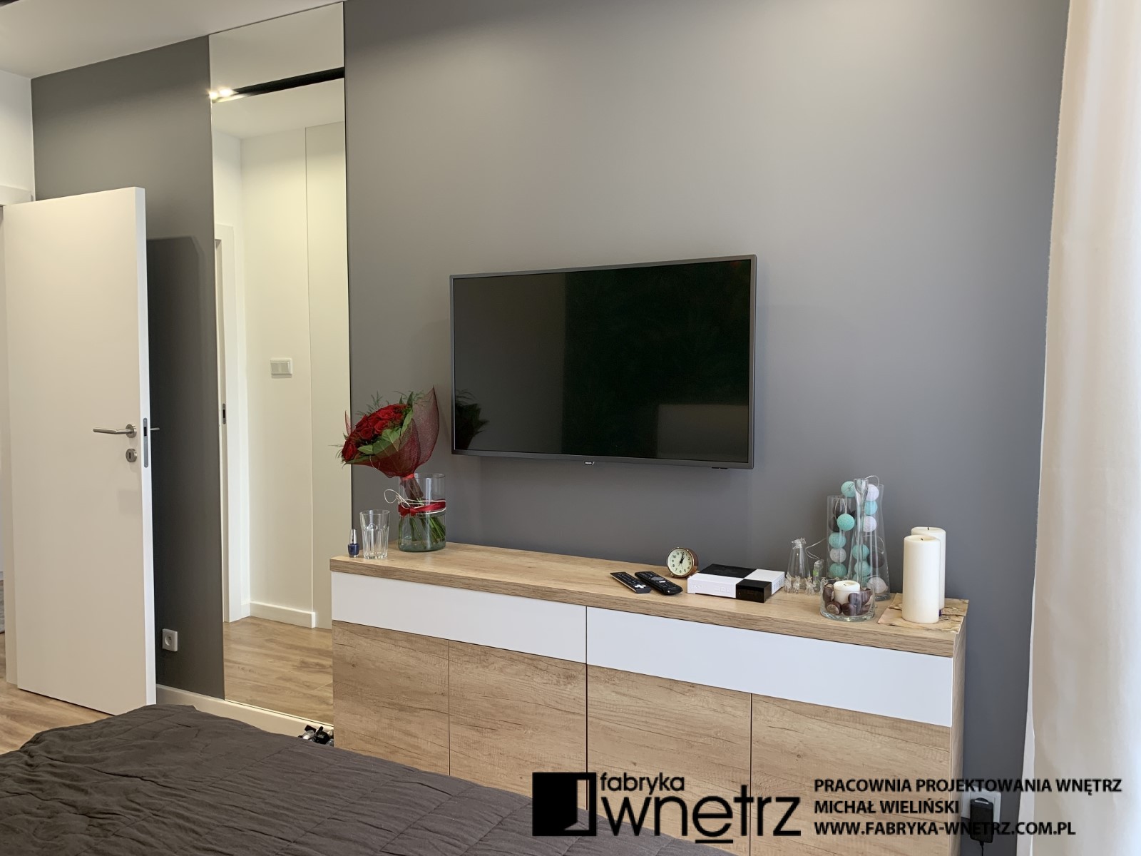 Wnętrza mieszkania w Pile. Stonowana, jasna kolorystyka z dodatkiem ciepłego drewna, to motyw przewodni w tym nowoczesnym mieszkaniu. W stosunkowo małej otwartej przestrzeni, musieliśmy znaleźć miejsce na aneks kuchenny, spory wypoczynek, stół, telewizor, szafę i witrynę. Całość oddzieliliśmy od wejścia ażurową, cienką ścianką z szafką na buty. W sypialni zmieściliśmy łóżko z dużą szafą na tle bujnej roślinności z dzikiej dżungli. Z niej do pokoju dziecięcego zawędrowała zagubiona małpka, wisząca na drewnianej ramie łóżka. Kolory i faktury z części dziennej tego mieszkania, zagościły również w małej, ale bardzo funkcjonalnej łazience.