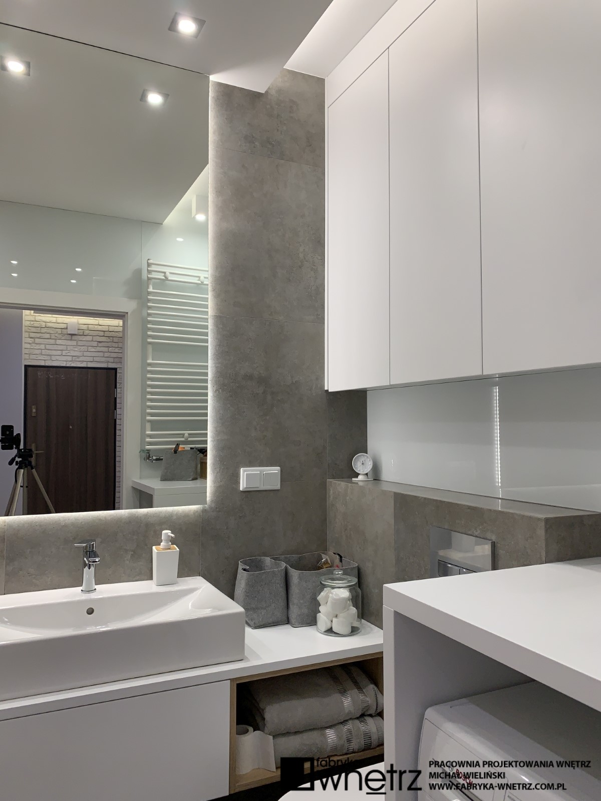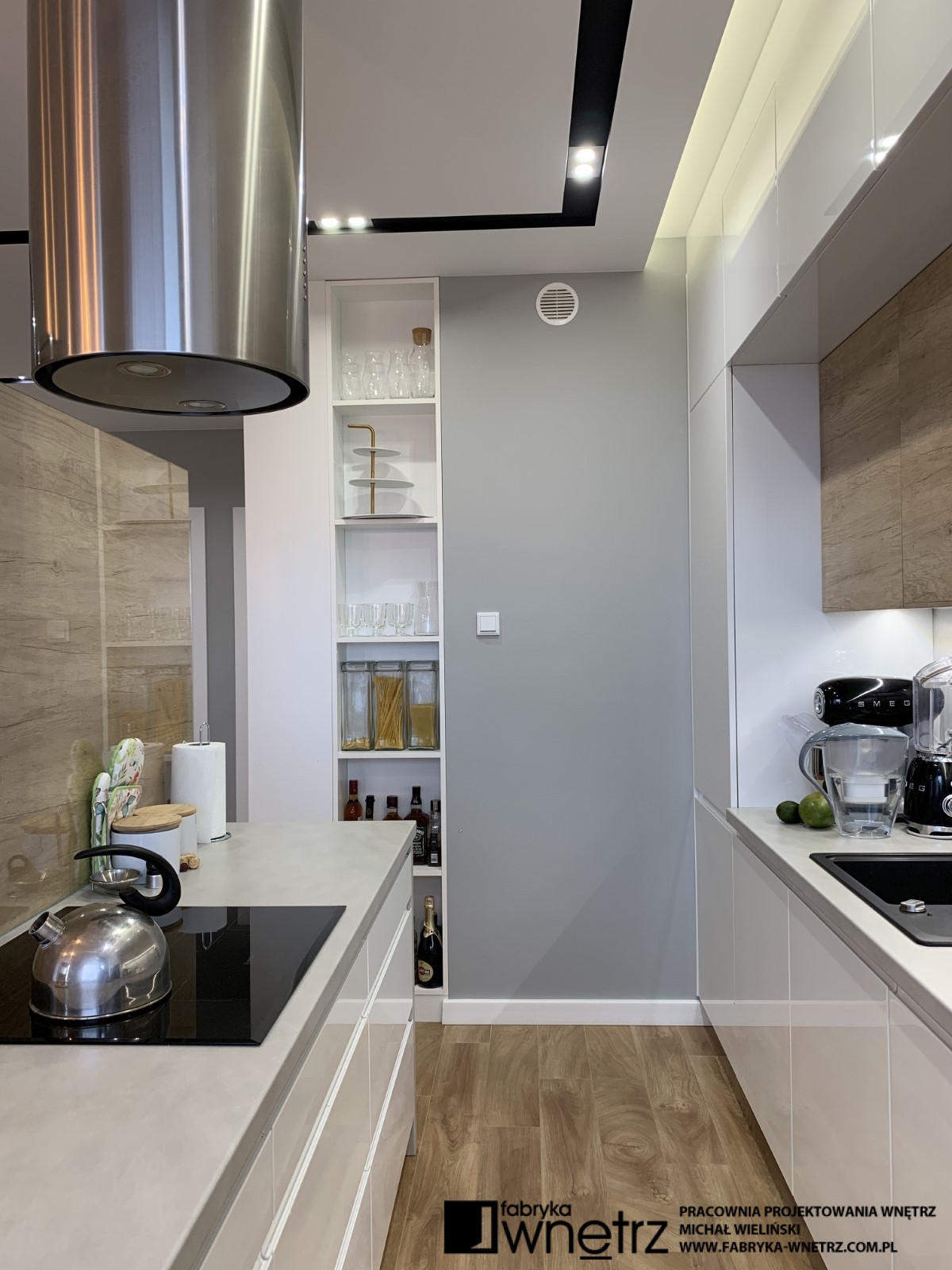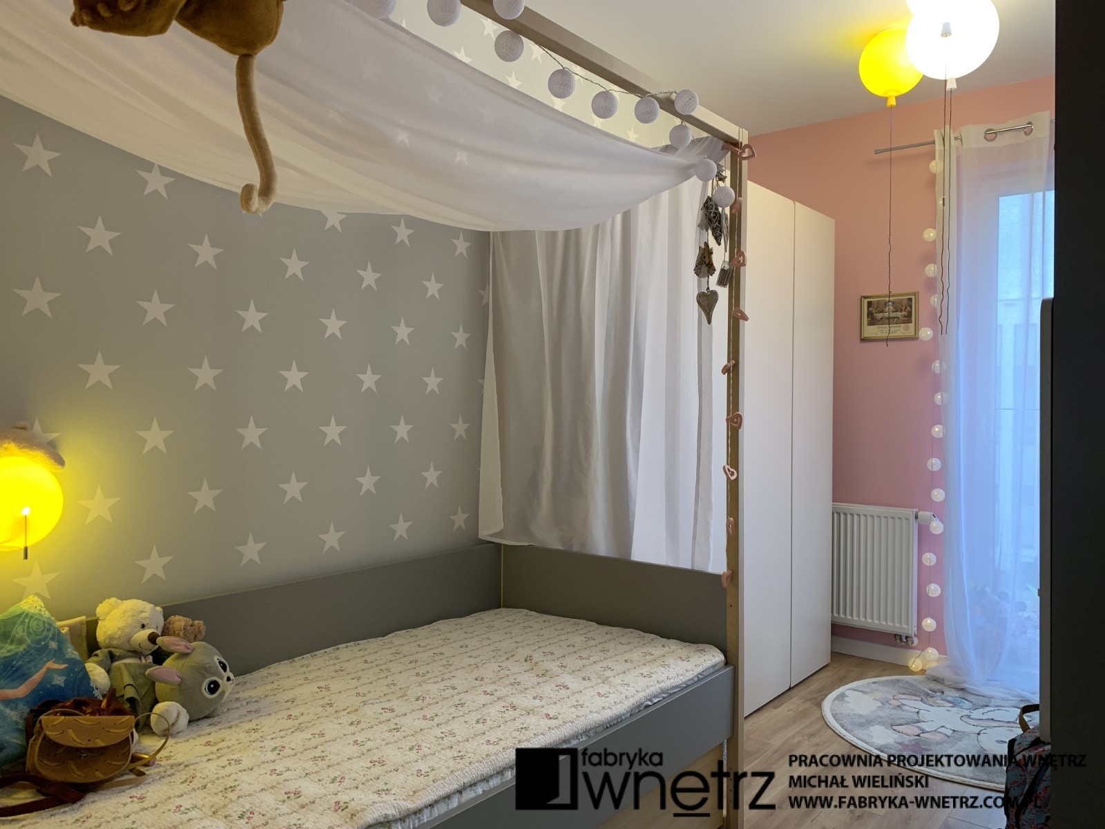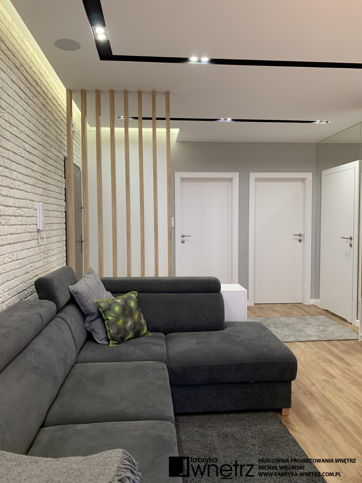 Wnętrza mieszkania w Pile. Stonowana, jasna kolorystyka z dodatkiem ciepłego drewna, to motyw przewodni w tym nowoczesnym mieszkaniu. W stosunkowo małej otwartej przestrzeni, musieliśmy znaleźć miejsce na aneks kuchenny, spory wypoczynek, stół, telewizor, szafę i witrynę. Całość oddzieliliśmy od wejścia ażurową, cienką ścianką z szafką na buty. W sypialni zmieściliśmy łóżko z dużą szafą na tle bujnej roślinności z dzikiej dżungli. Z niej do pokoju dziecięcego zawędrowała zagubiona małpka, wisząca na drewnianej ramie łóżka. Kolory i faktury z części dziennej tego mieszkania, zagościły również w małej, ale bardzo funkcjonalnej łazience.