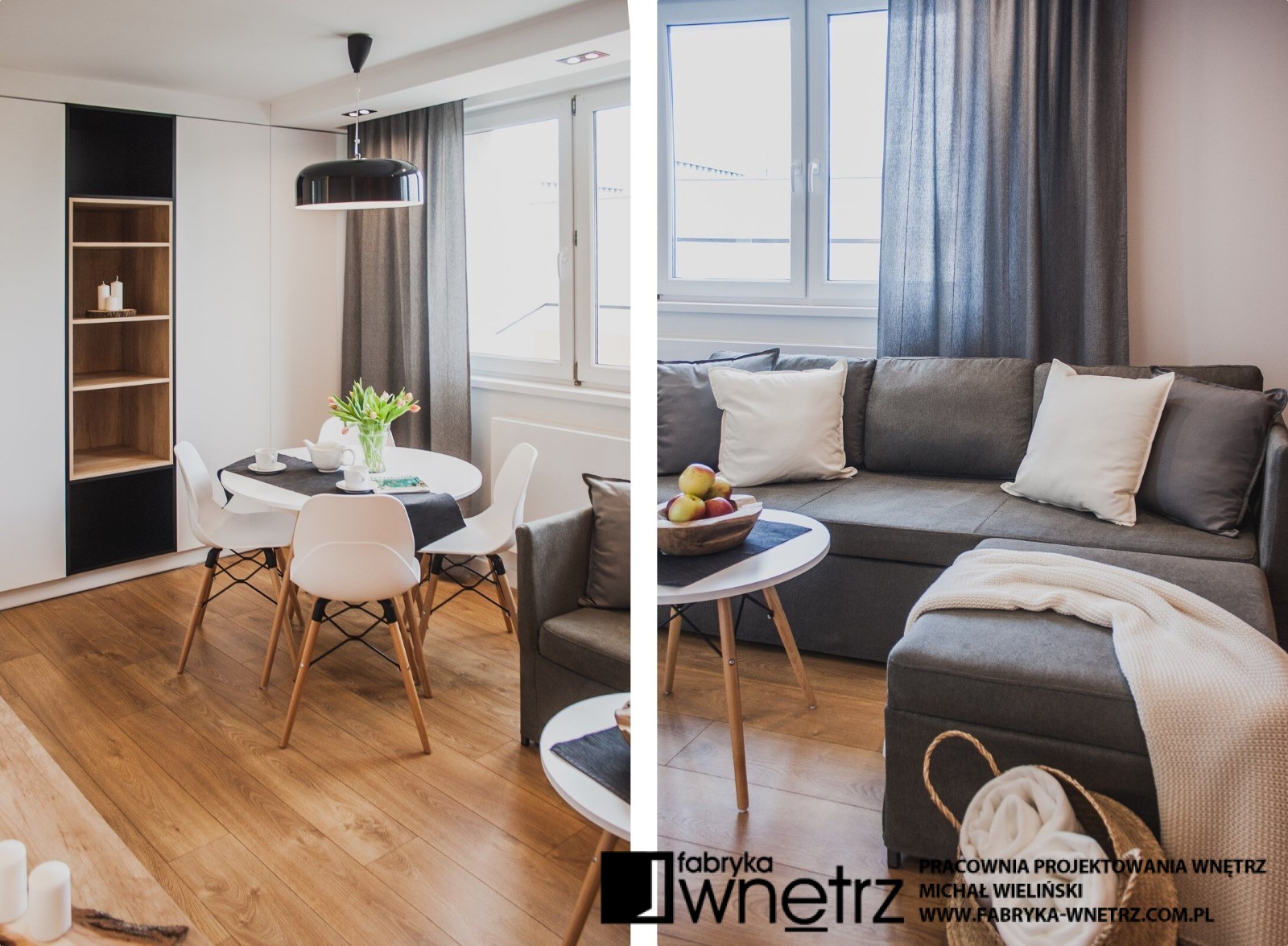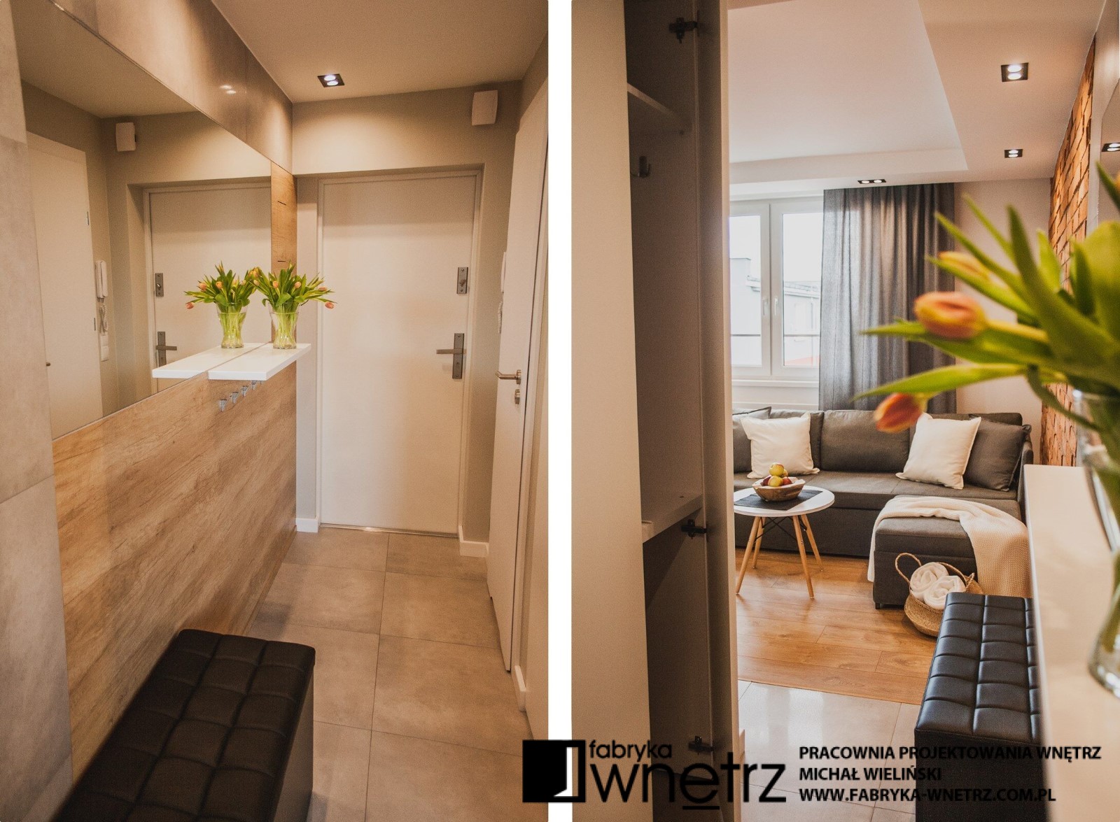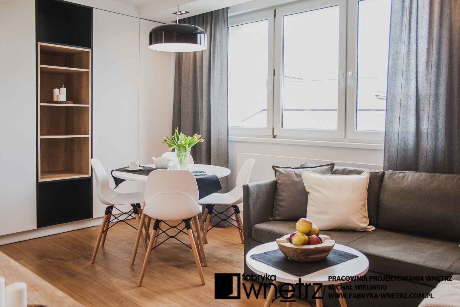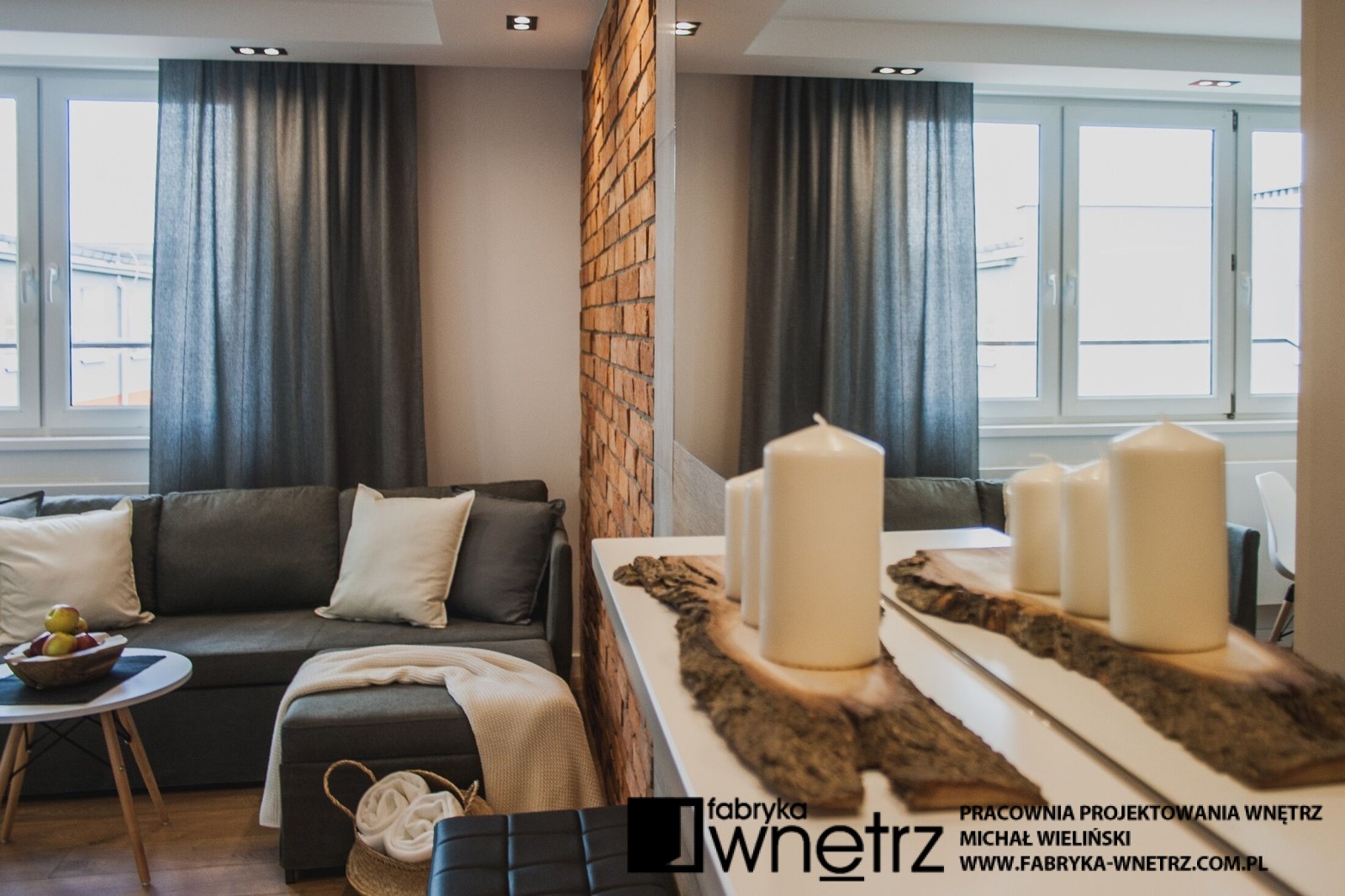 Kawalerka w Turku. Niewielki metraż, a wielkie możliwości. Mieszkanie to zostało zaprojektowane dla 1-2 osób. Jest w pełni wyposażone we wszystkie potrzebne do wygodnego życia sprzęty. Na 25 metrach kwadratowych mamy wygodny salon, otwarty na wygodną i funkcjonalną kuchnię z rozkładanym narożnikiem, dużą szafą i miejscem na telewizor. Przedsionek z miejscem na pralkę i szafę, oraz komfortową łazienkę, z dużą kabiną prysznicową. Klimat w tym wnętrzu tworzy stara cegła z odzysku, białe fronty mebli w połysku, oraz jasny odcień drewna. Całość uzupełniają dodatki, w postaci stylowych lamp wiszących, punktowego ledowego oświetlenia i miękkich tkanin zasłon i poduszek.