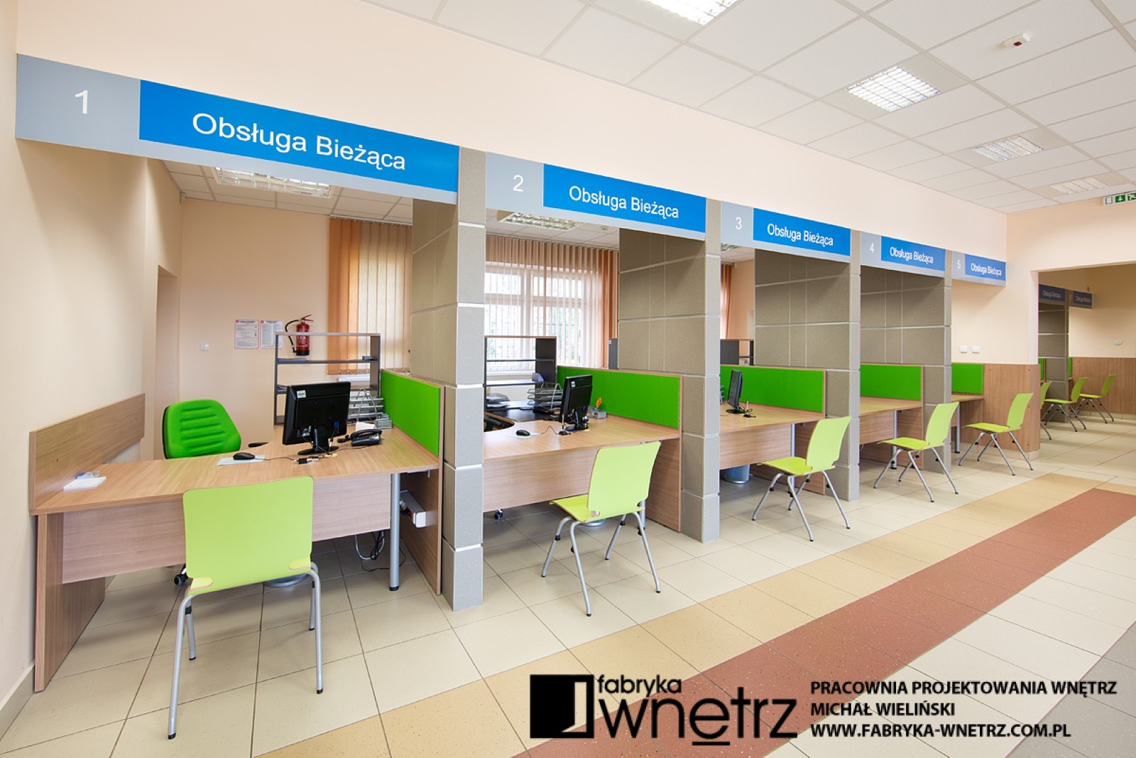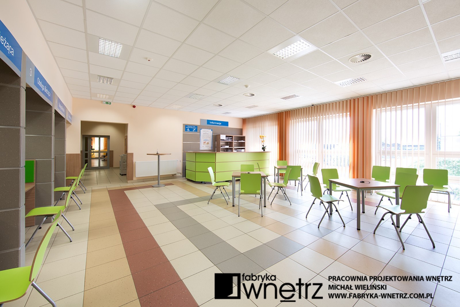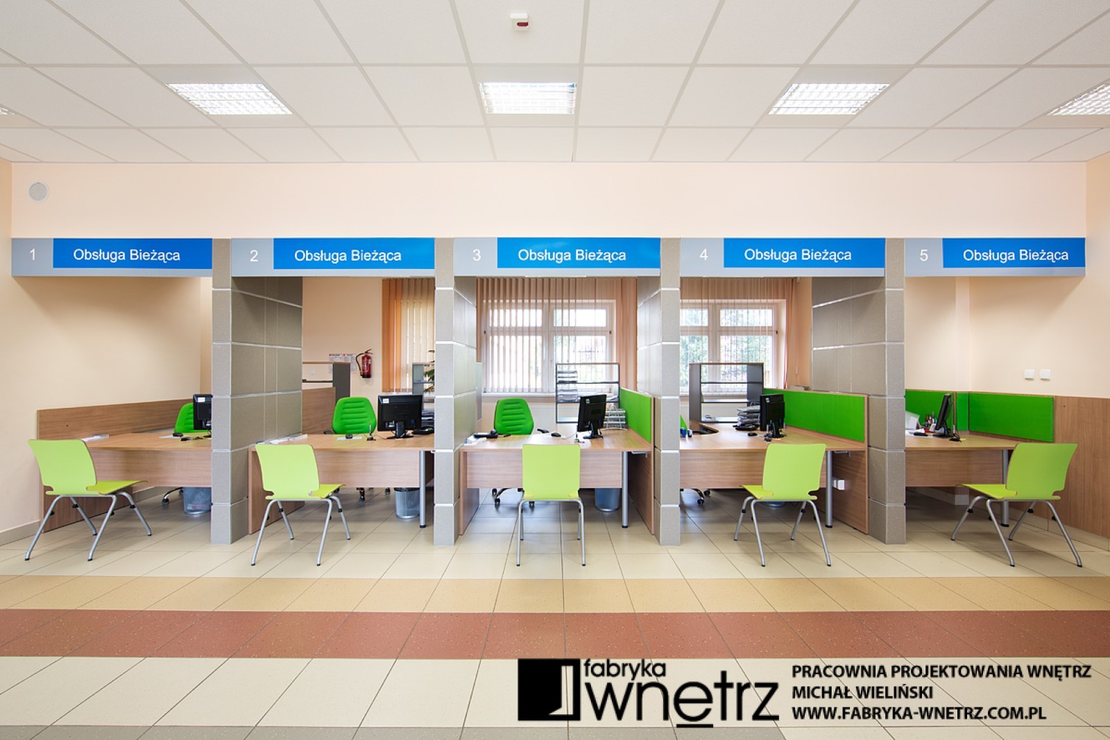 Wnętrza Urzędu Skarbowego w Koninie. Recepcja, poczekalnia z kącikiem zabaw dla dzieci i sala obsługi. Kompleksową realizację wykonała firma Scala Office.