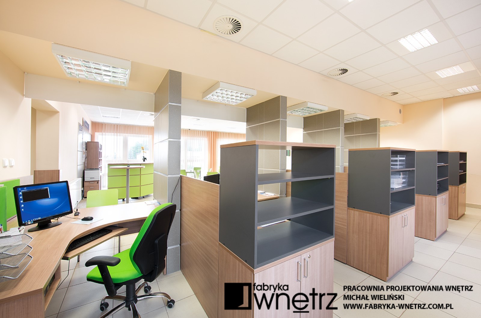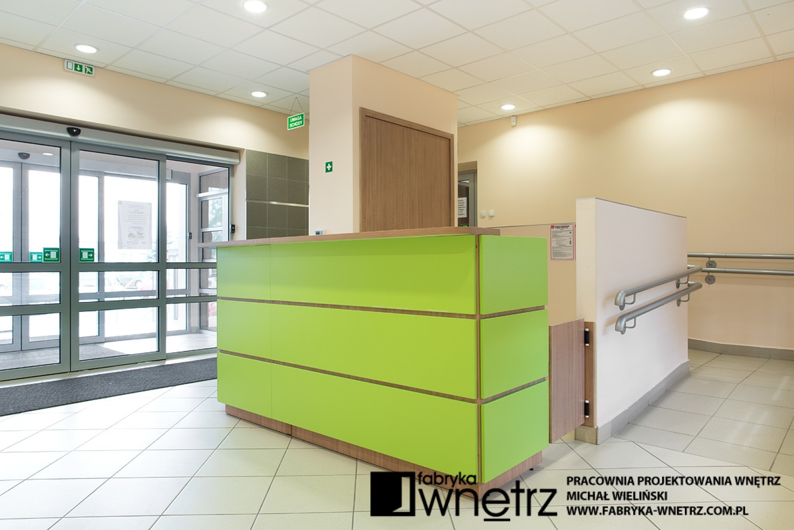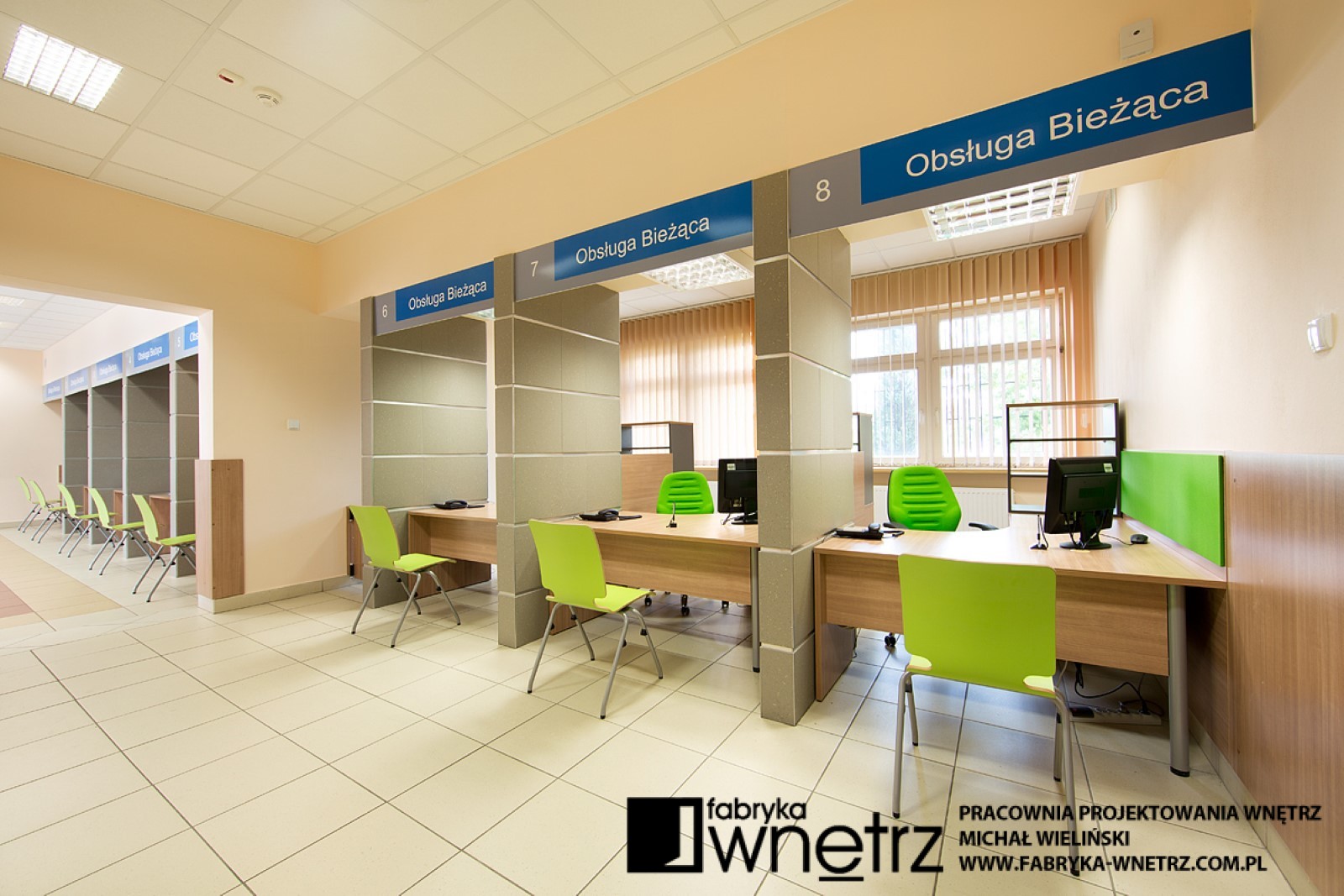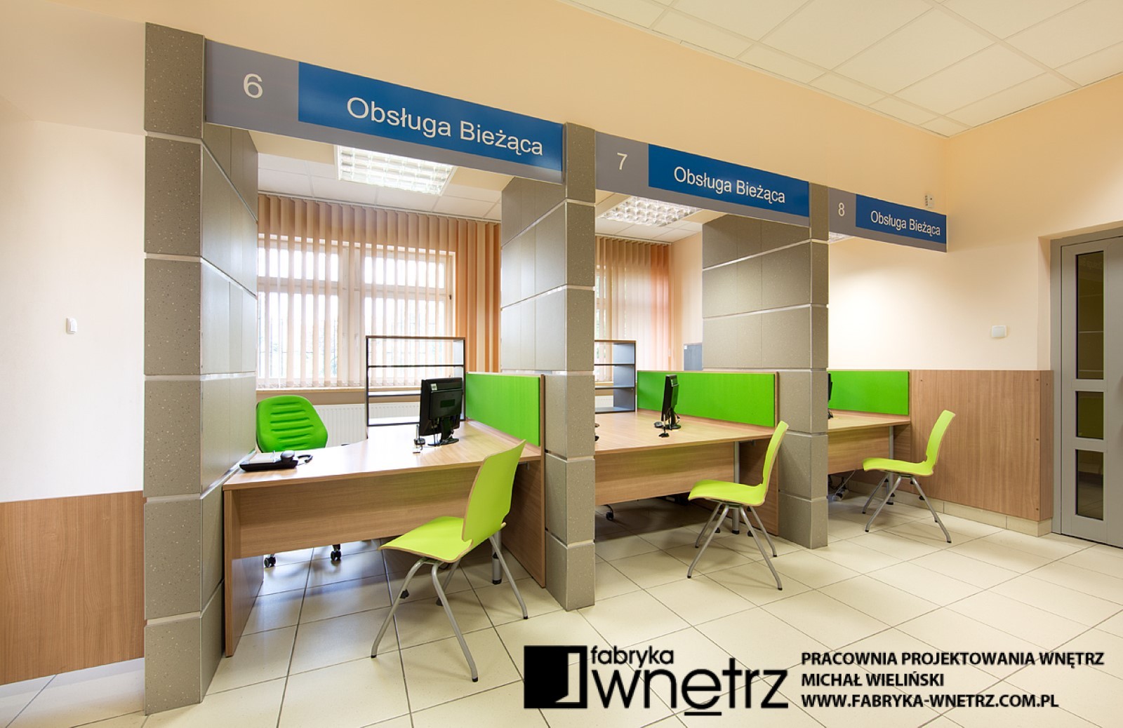 Wnętrza Urzędu Skarbowego w Koninie. Recepcja, poczekalnia z kącikiem zabaw dla dzieci i sala obsługi. Kompleksową realizację wykonała firma Scala Office.